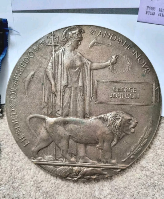 SOLD! WW1 Death Plaque & Medal Group to Corporal George Johnson, 7th King’s Own Yorkshire Light Infantry