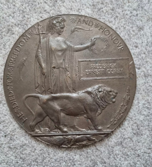 SOLD! WW1 Death Plaque to Private Frederick Ernest Corby, 1st Surrey Rifles (London Regiment)