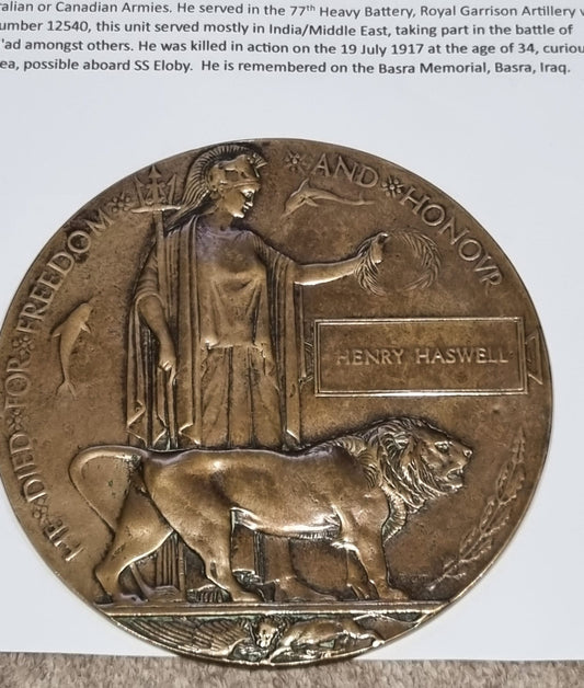 SOLD! WW1 British Death Plaque to Henry Haswell