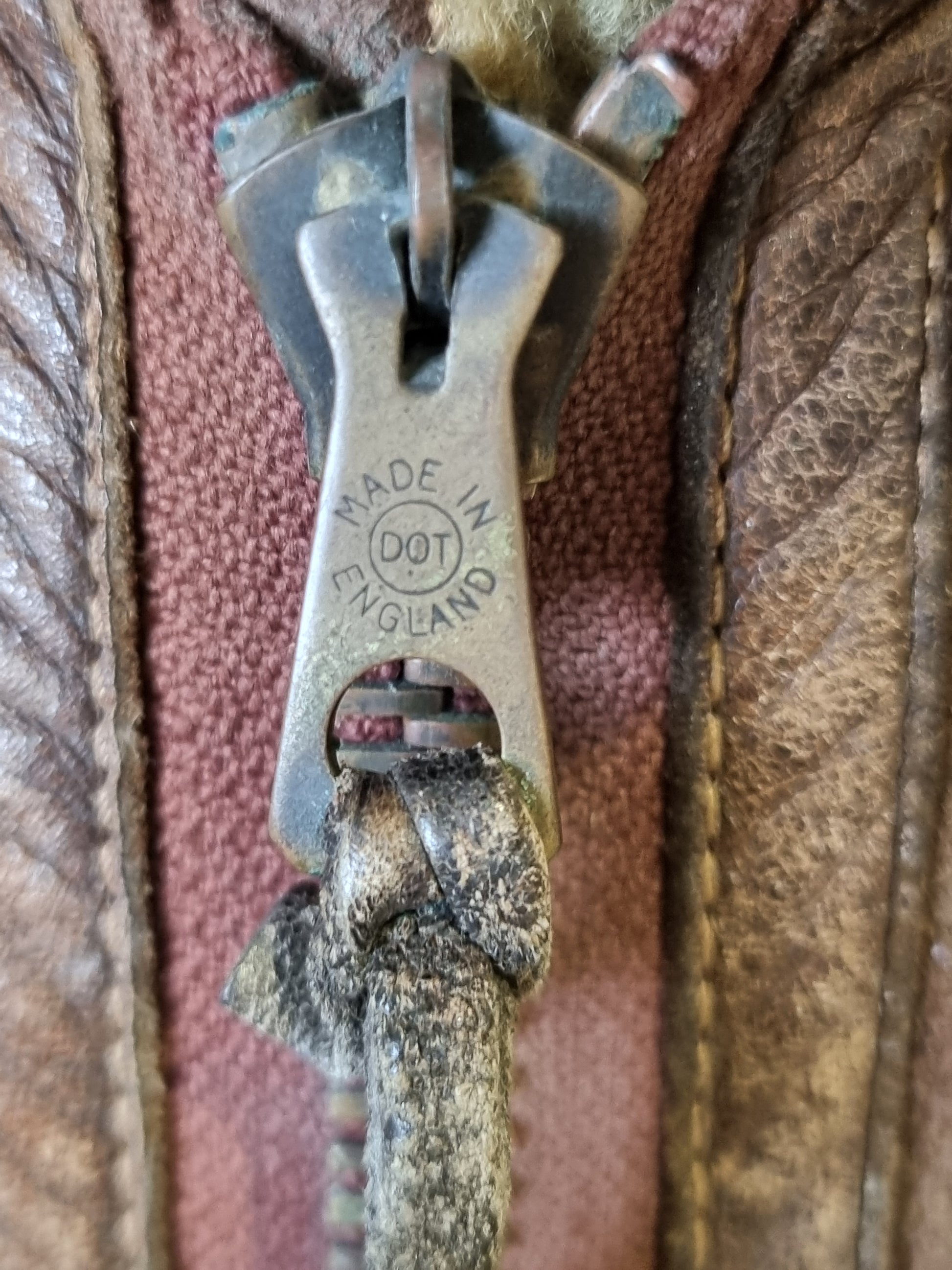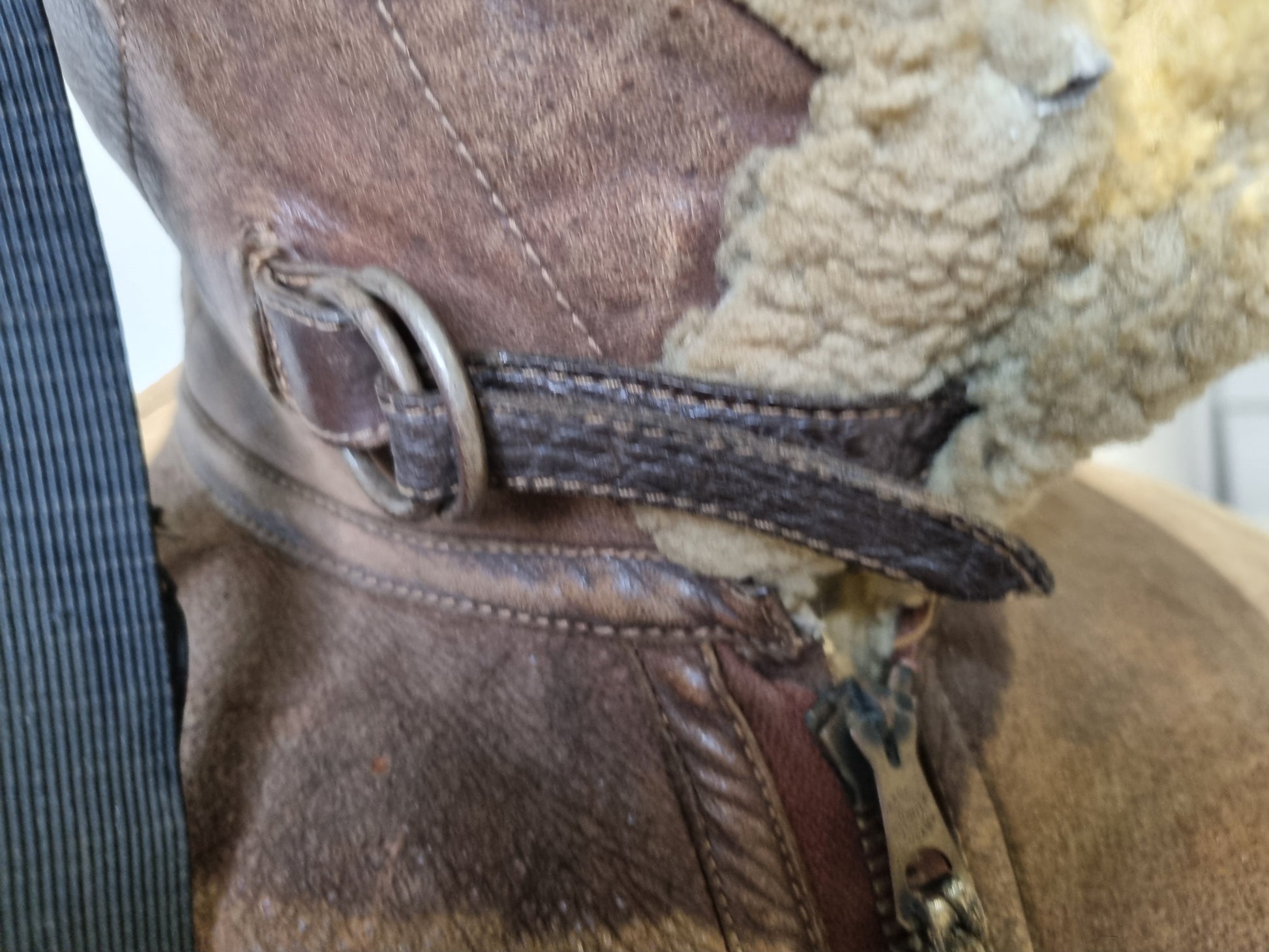 These straps were fitted to all early production Irvin flying jackets by all makers. They were intended to be worn across the forehead to keep the collar up in opened top cockpits of 1930s aircraft. They fit into the reverse of the collar by being attached to two metal eyelets - one of the eyelets is missing from the collar.