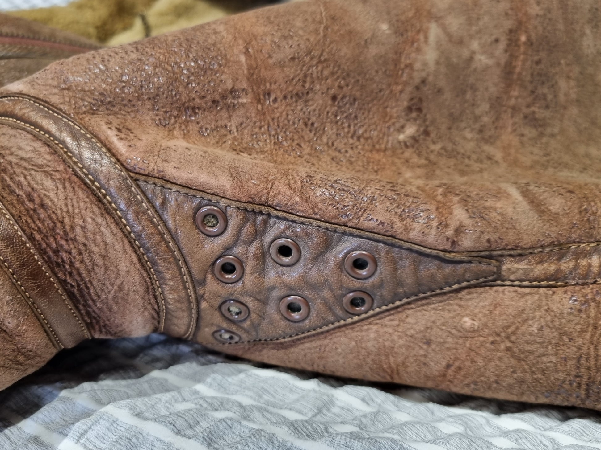 In decent condition for its age - with 3 period arm patches and another period repair to the arm. Also some wear to the leather - still nice and supple though.