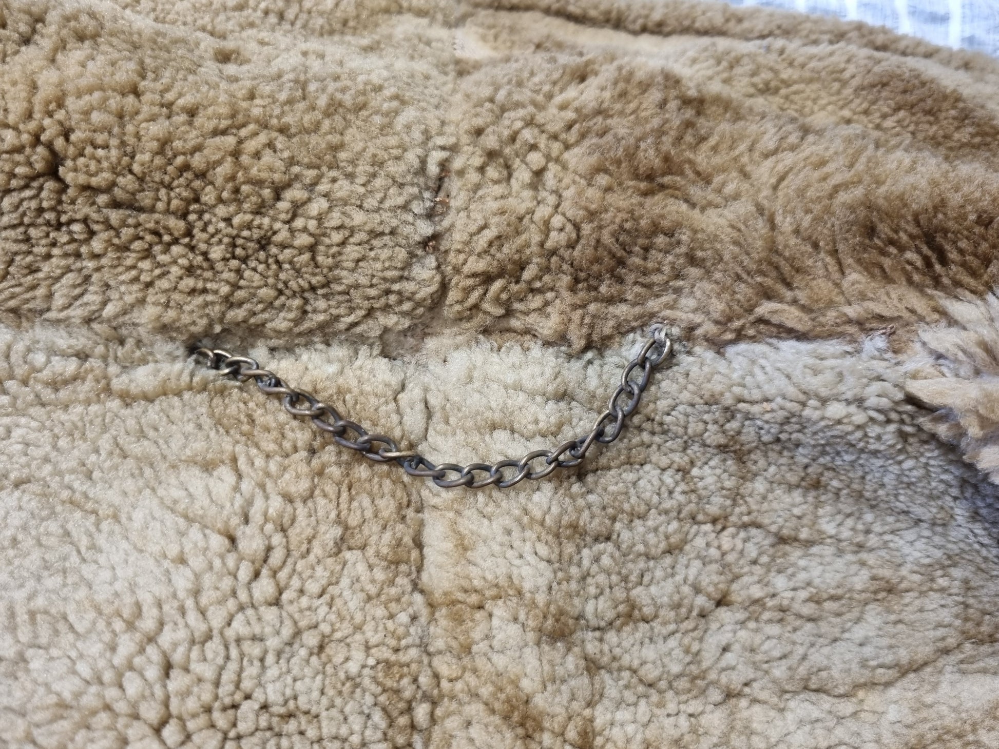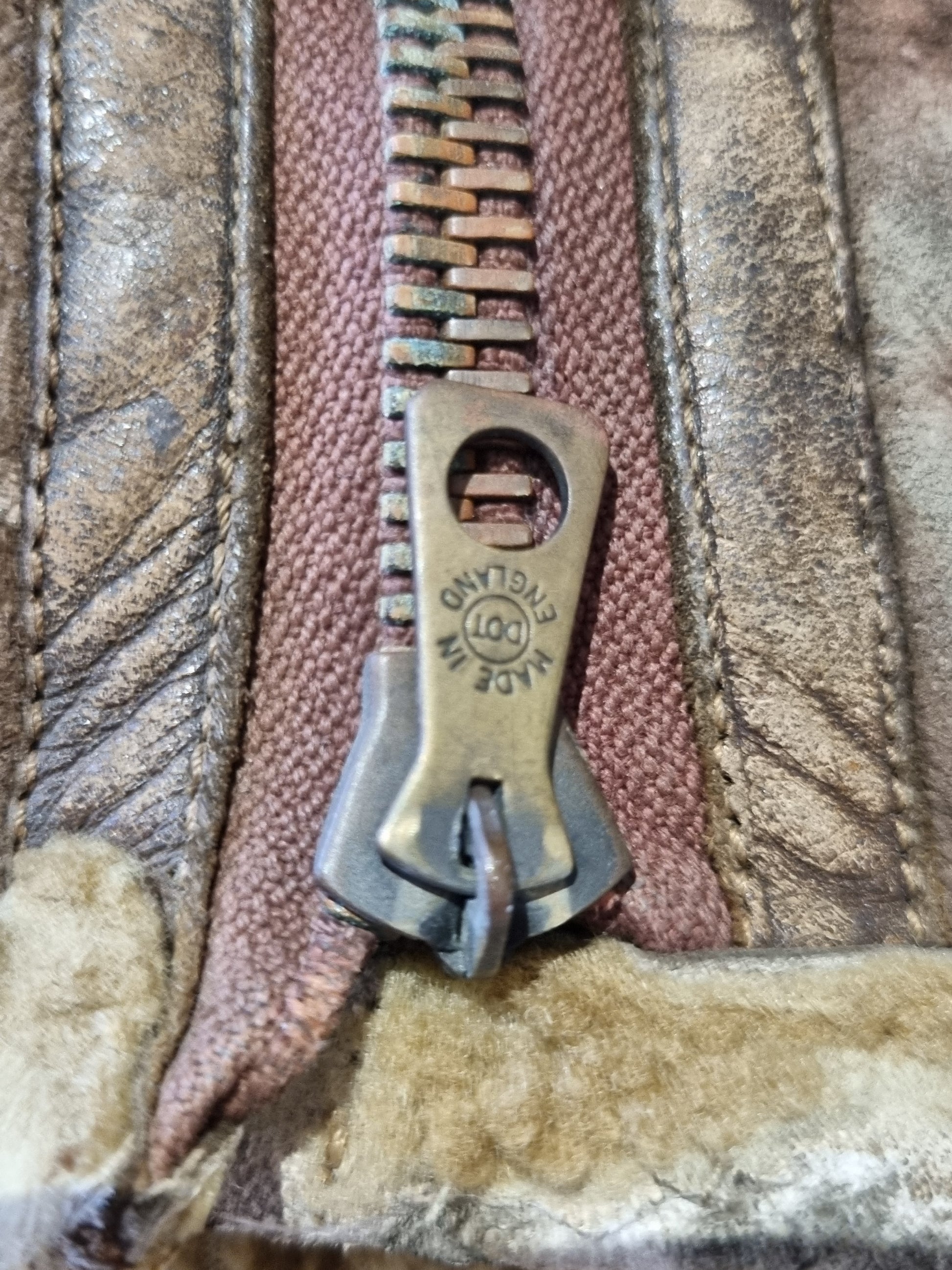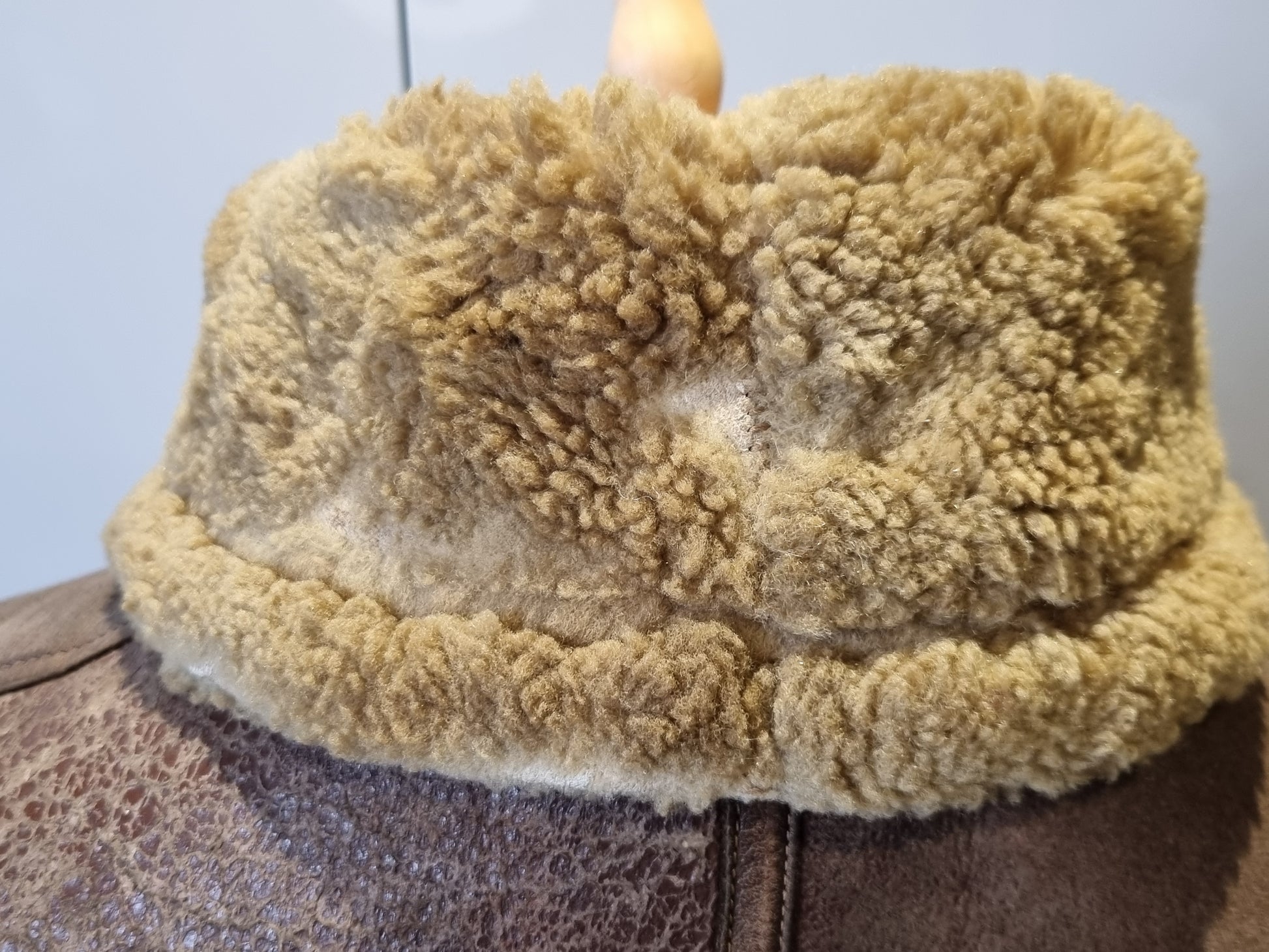 Sheepskin lining is generally in nice condition, but with some wear to the collar area.