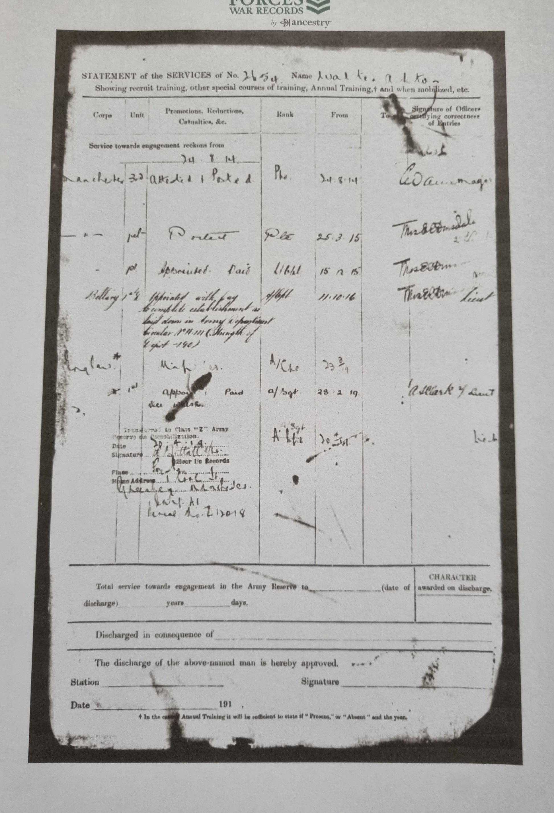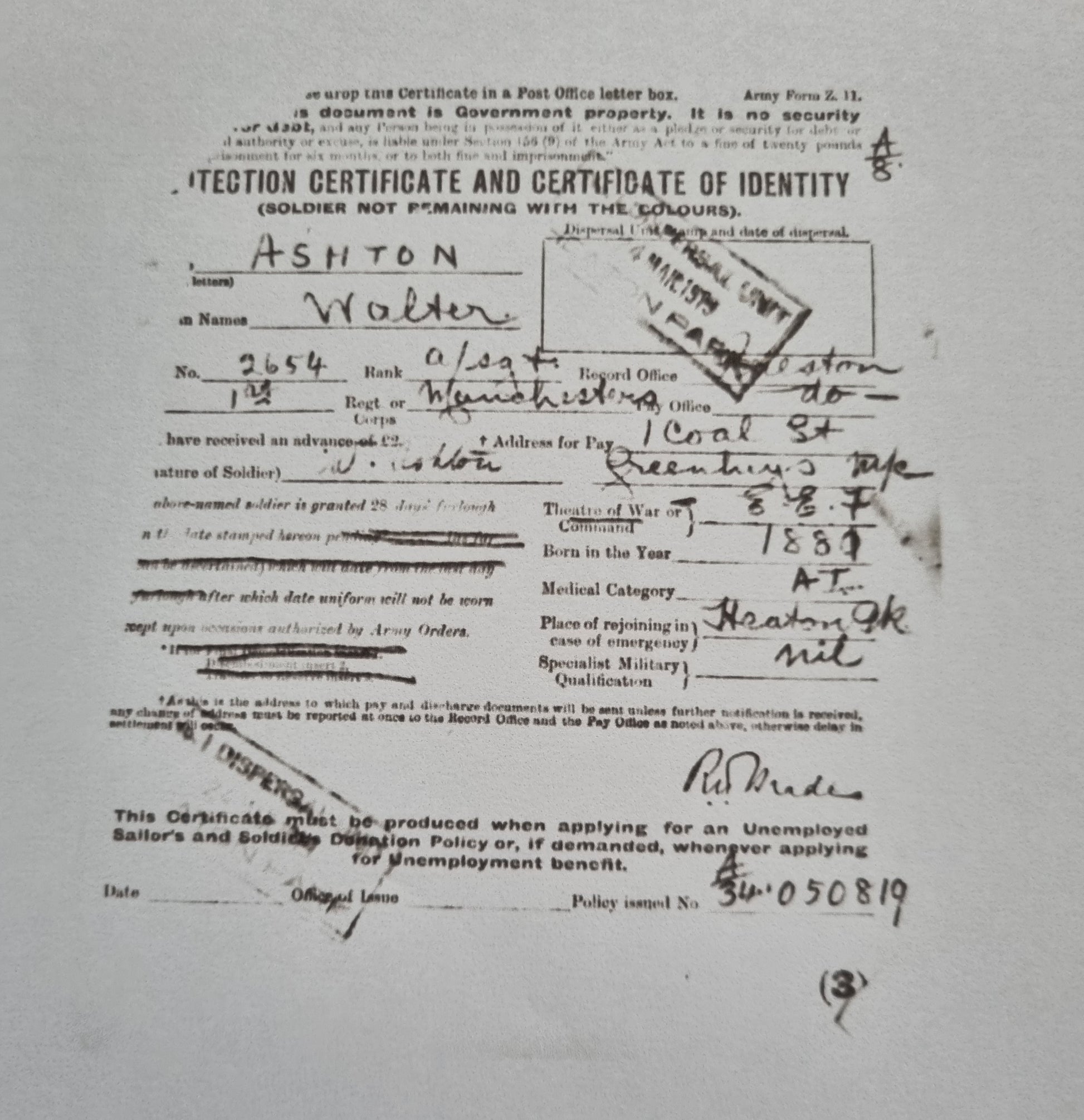 For WW1, he rejoined up as a Private in the 3rd Manchester Regiment within the BEF on 24th August 1914. This was a Reserve Regiment re-training and re-equipping reservists, within which he quickly rose to Duty Sergeant on transport duties.