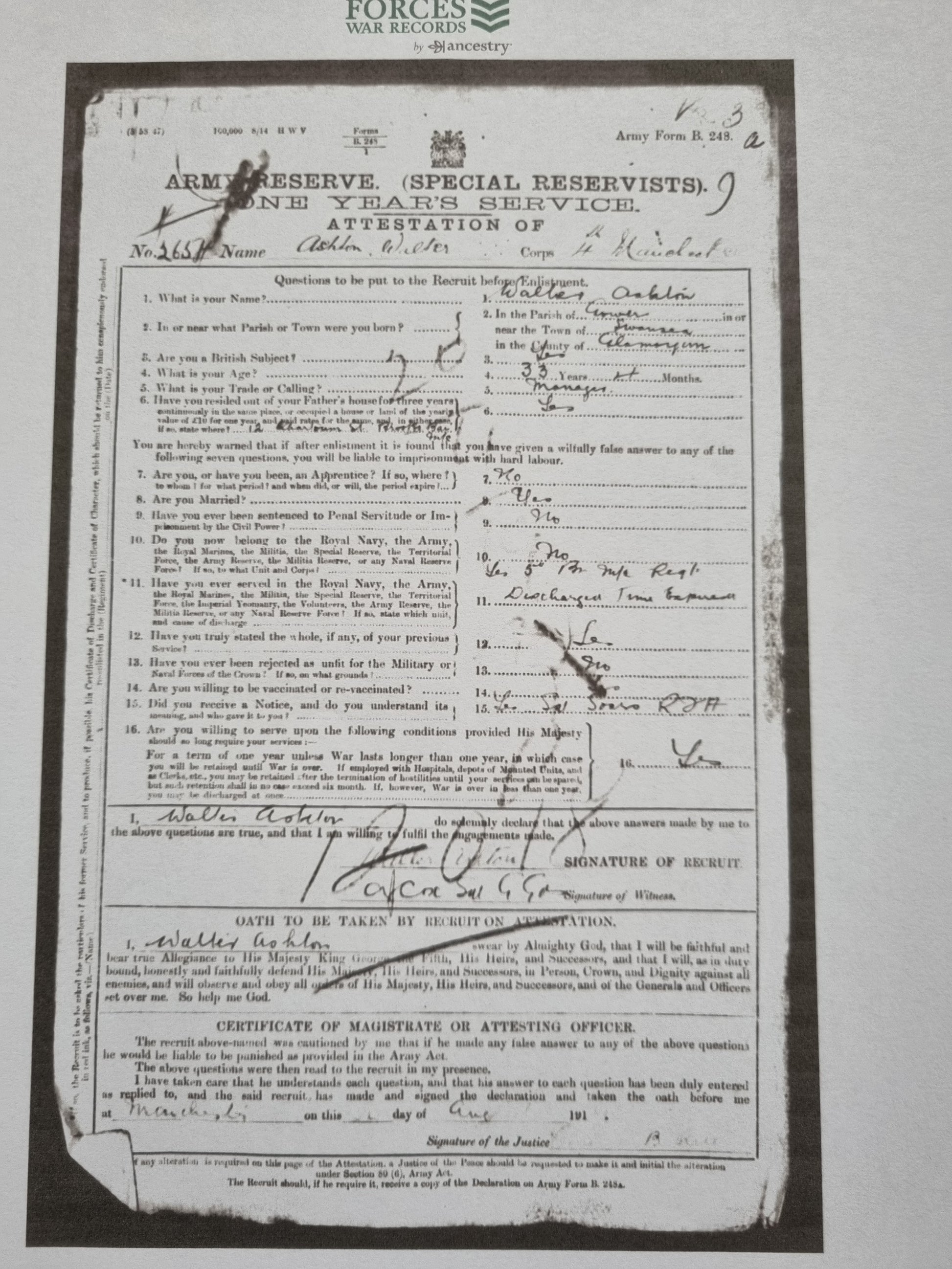 He served with the 1st Battalion Manchester Regiment during the 2nd Boer War.