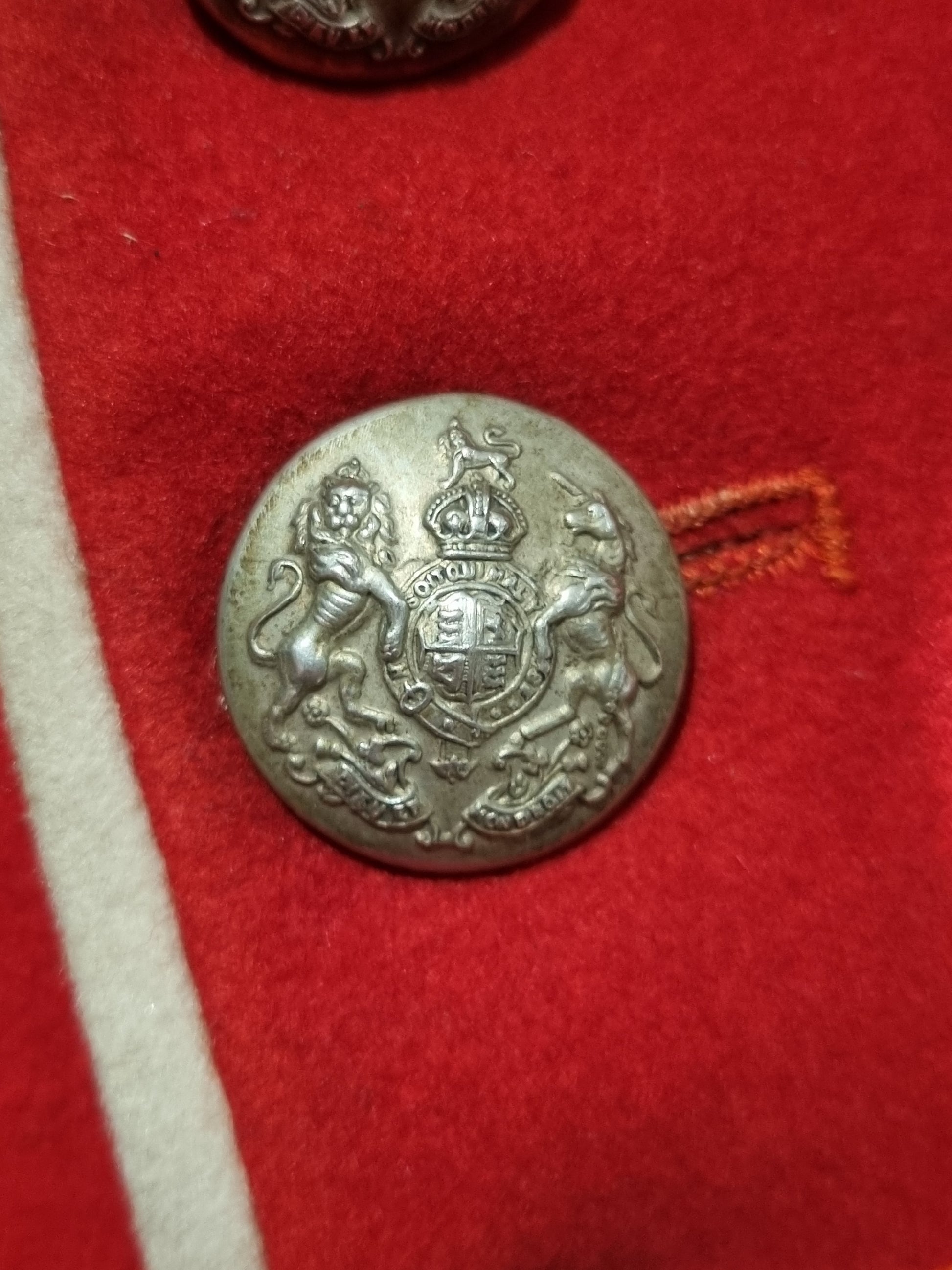 Scarlet serge, single breasted tunic with yellow high collar with white metal collar badges. Yellow gauntlet cuffs with piped edging and gimp lines.