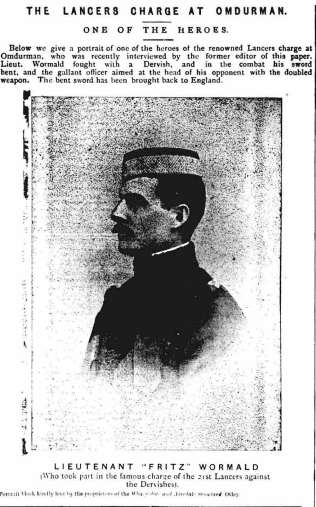 “Lieut ‘Fritz’ Wormald’s Graphic Account of the Lancers Charge at Omdurman: The famous charge of the 21st Lancers at the battle of Omdurman was the most dramatic incident in the campaign…The charge will rank amongst the great heroic deeds performed by soldiers of the Queen. The fact is that not only was a Yorkshireman there, but an officer from this district, in the person of Lieutenant Frederick William Wormald, son of Mr John Wormald of Denton Park, and of the great firm of blanket makers, Wormald and Walker. ‘Fritz’ as he is familiarly called amongst his friends- with whom he is very popular- was one of the gallant 300 who assailed a body of about 2,000 fighting dervishes, was the hero of an exciting adventure, and although having a hairbreadth escape, came out without a scratch. Upon his return home last Monday night, he had a cordial greeting at the hands of relatives and friends, and early on Tuesday morning we had the pleasure of an interview with the gallant young officer- we say young advisedly for he is only 28. Whilst he has the military carriage, he is unassuming, and there is an entire absence of bombard. He has been fortunate to be in the historic charge; he went to do his duty, did it, and thinks there is nothing grandiose about it. There was no wish to magnify the role he played, but rather to belittle it…We suggested that some description of his experiences would be of interest…regretting that he was not much of a hand at picture painting, he commenced…. Wormald belongs to the 7th Hussars and was at home on leave when he heard of the organisation of the Sudan Expedition…he wished to be at the front and take part in the fighting. He at once volunteered for service and seeing that nearly all the subalterns of the British Cavalry did the same, he esteems himself lucky to be one of the four selected. The 21st Lancers had lost some of their officers and he was attached to their regiment. He joined the Lancers at Cairo, and after waiting there a few days, they continued the journey to Omdurman…they proceeded by rail and steamboat down the Nile as far as Atbara. The heat being intense- considerably over 100 degrees in the shade- they had to march early in the day. The Lancers joined the main army at Wad Hamed….at last the eventful 2nd September arrived…They noticed in a nullah what appeared to be a small body of the enemy…they deployed into line for attack and charged at the gallop. When they got within two or three hundred yards…they discovered that instead of a mere handful of men, there were about 1500, armed with rifles and swords and waiting to receive them. The odds were overwhelming…there was nothing else for it but to ‘go right at them…pressed as to his own part in the memorable conflict, Wormald said he was leading a troop of Lancers on the right flank…as they came over the nullah he saw a Dervish making off and saying to himself " I'll have a go at this fellow,"' he started after him. The Dervish was mounted on an Arab horse which, however, was in a bad condition. and riding on a sturdy English pony, the Lieutenant soon gained on him. Seeing he was hotly pursued. the Dervish turned round and fired his rifle at him, Whether the shot came near Wormald did not know: the only thing he knew was that he was not hit and he got up to the warrior. When near enough, he delivered a sword point at his back with his sword, but to his dismay the sword bent, and was almost useless. This would have been a critical, probably a fatal moment, if the Dervish had turned to fight: but he was desperately bent on getting away. Lieut. Wormald aimed at his head with the doubled weapon and then, being a leader of his troop, returned to his men…the young officer speaks with little contempt about the untrustworthy blade….That blade however, has been brought home to England, it will be a trophy, possibly an heirloom. Since his return to British soil he has seen messrs Wilkinson, who make nearly all the models for officers of the army. They are putting in a new blade, and own themselves that the steel was soft. With regard to the enemy, he spoke of them as born fighters and brave men who have not the slightest fear of death”.