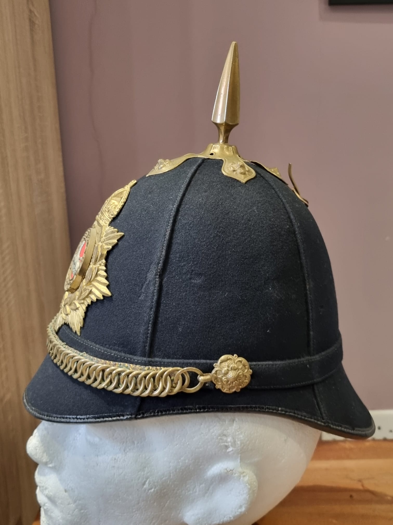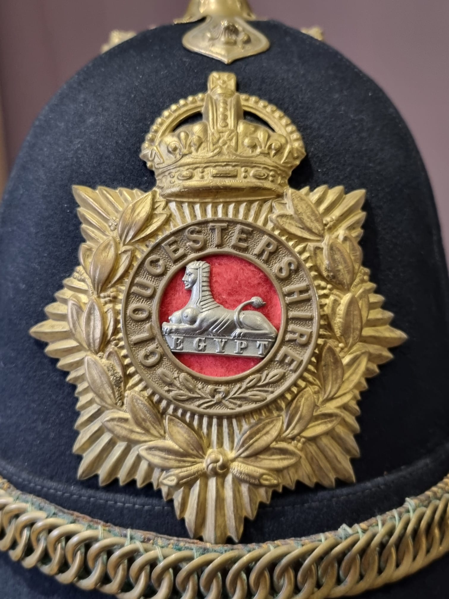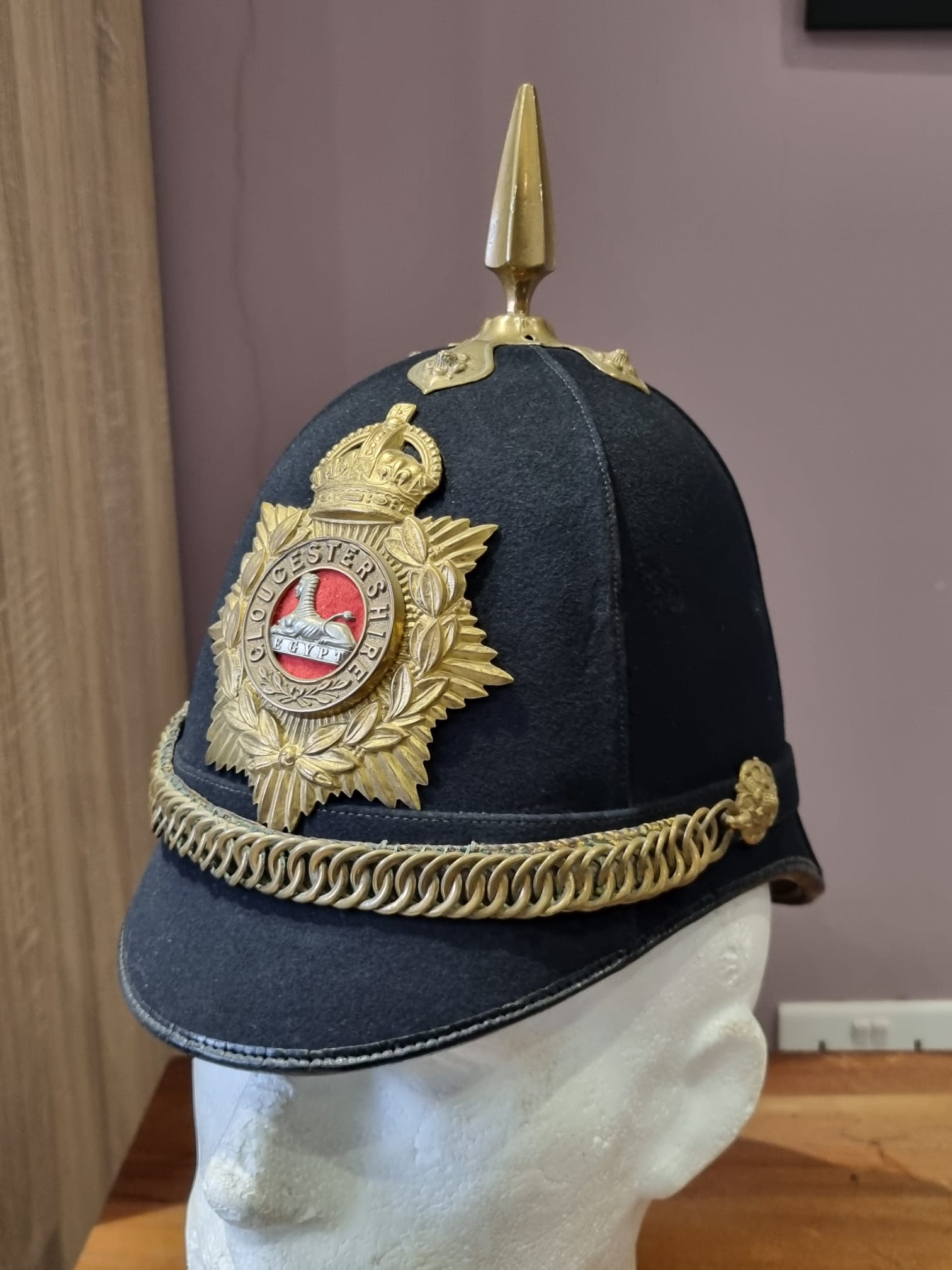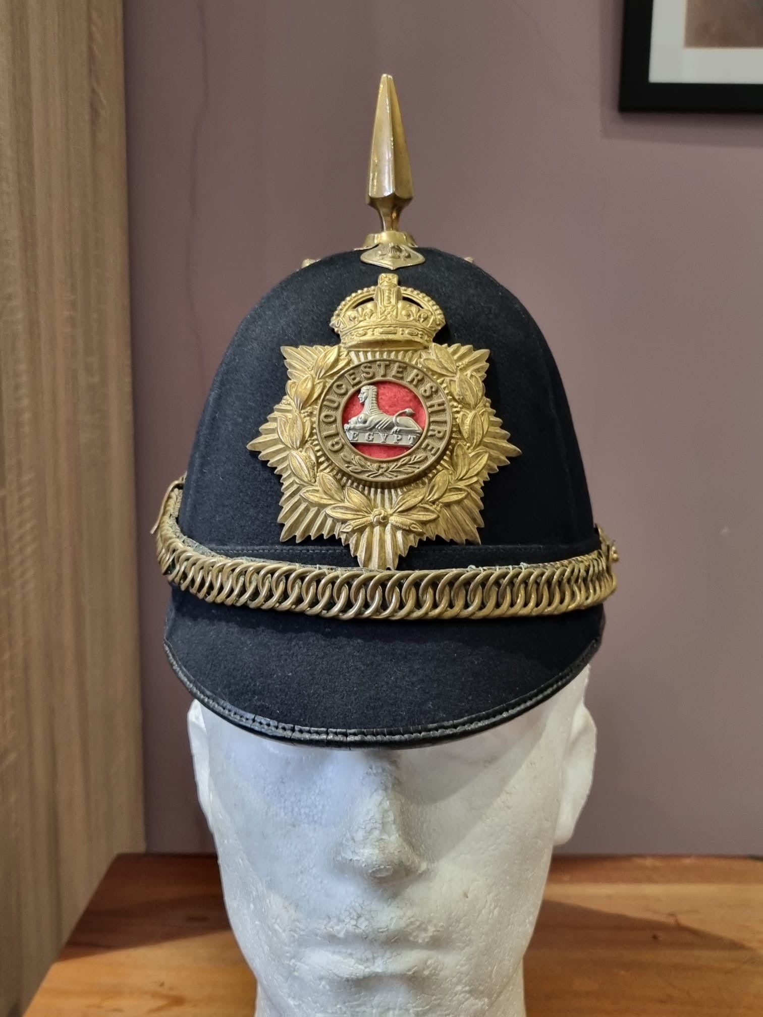 Complete with original chinstrap, hangers, roses etc and a lovely Gloucestershire front plate. With full leather liner and detachable spike.