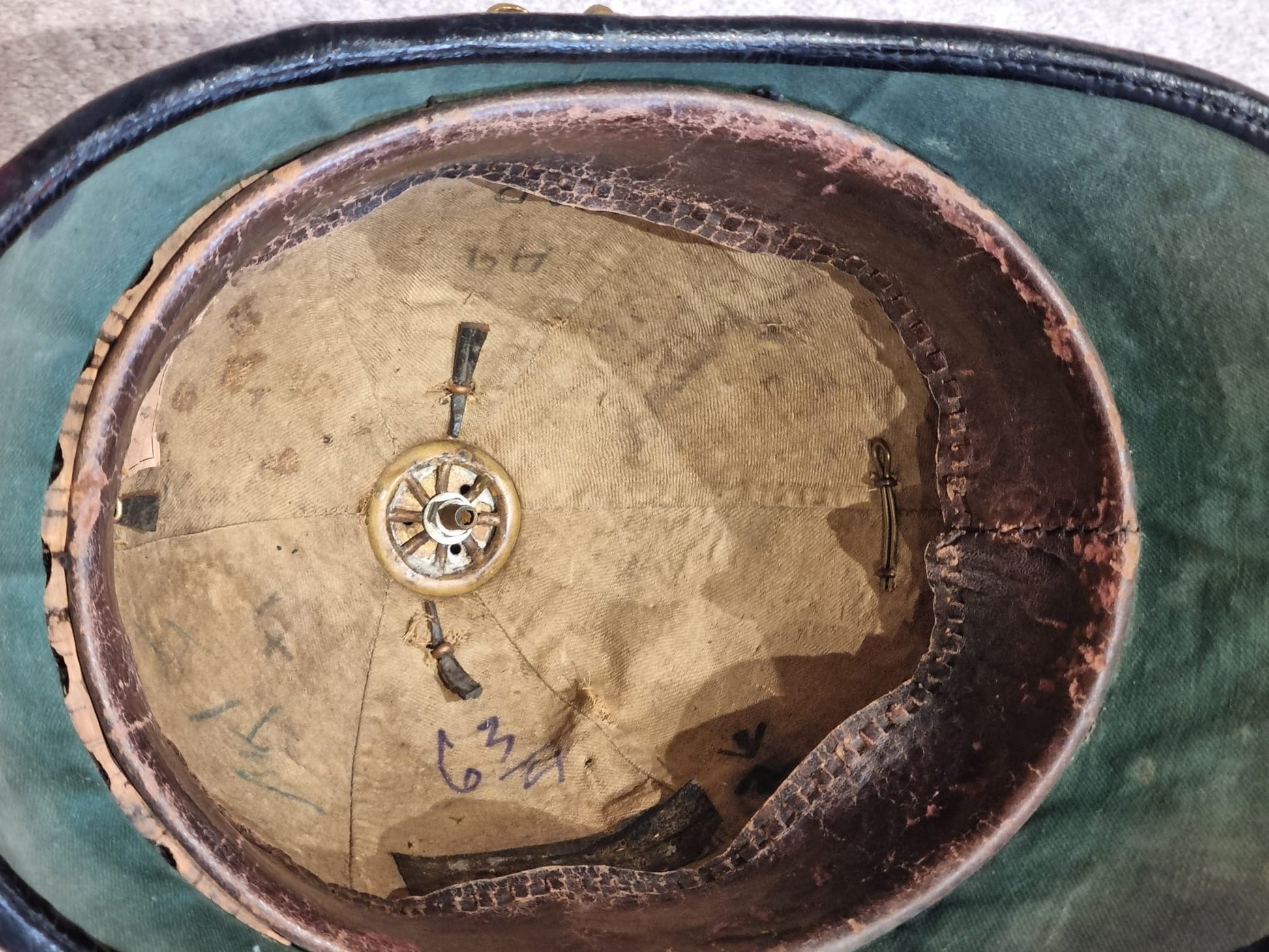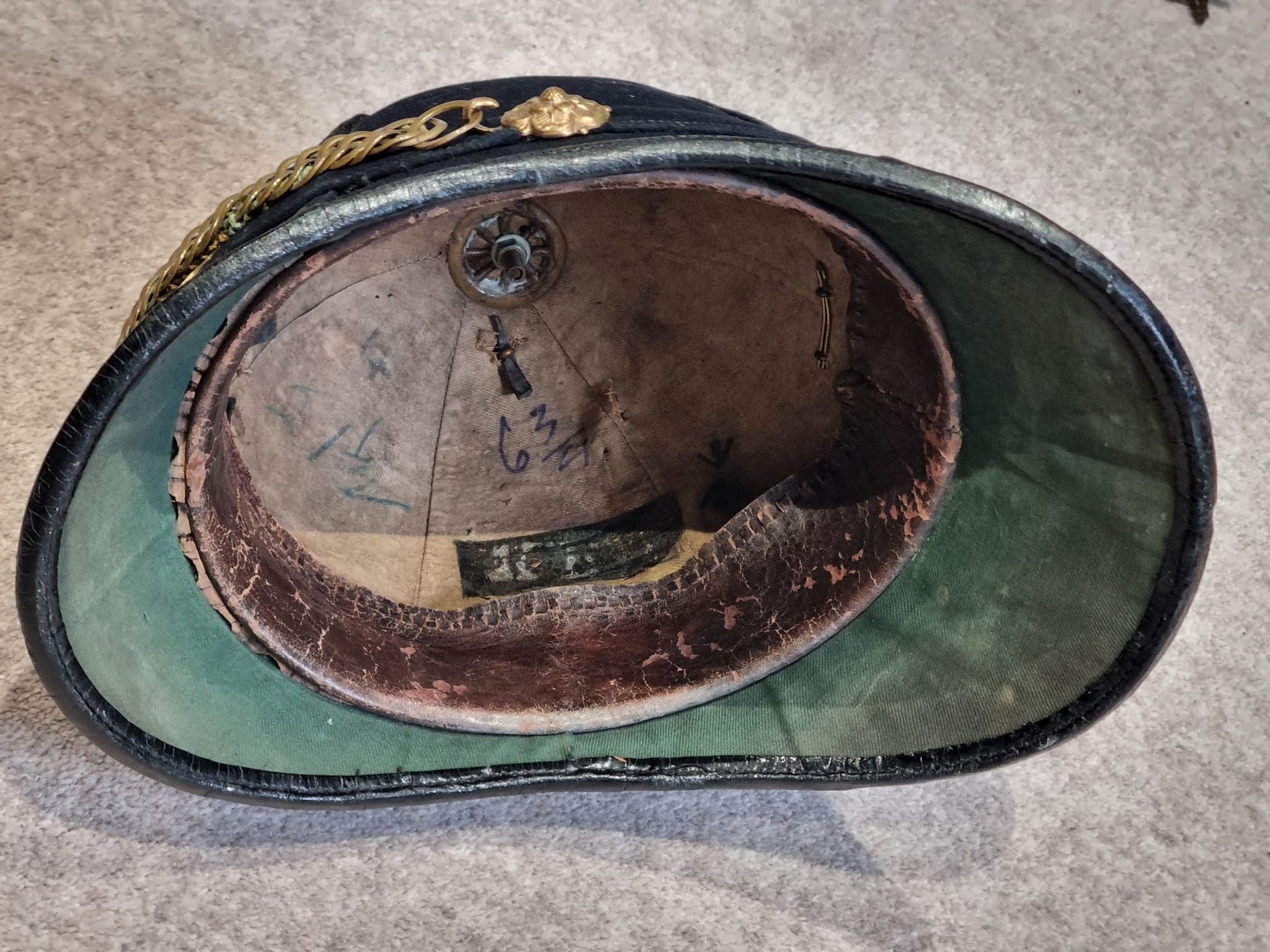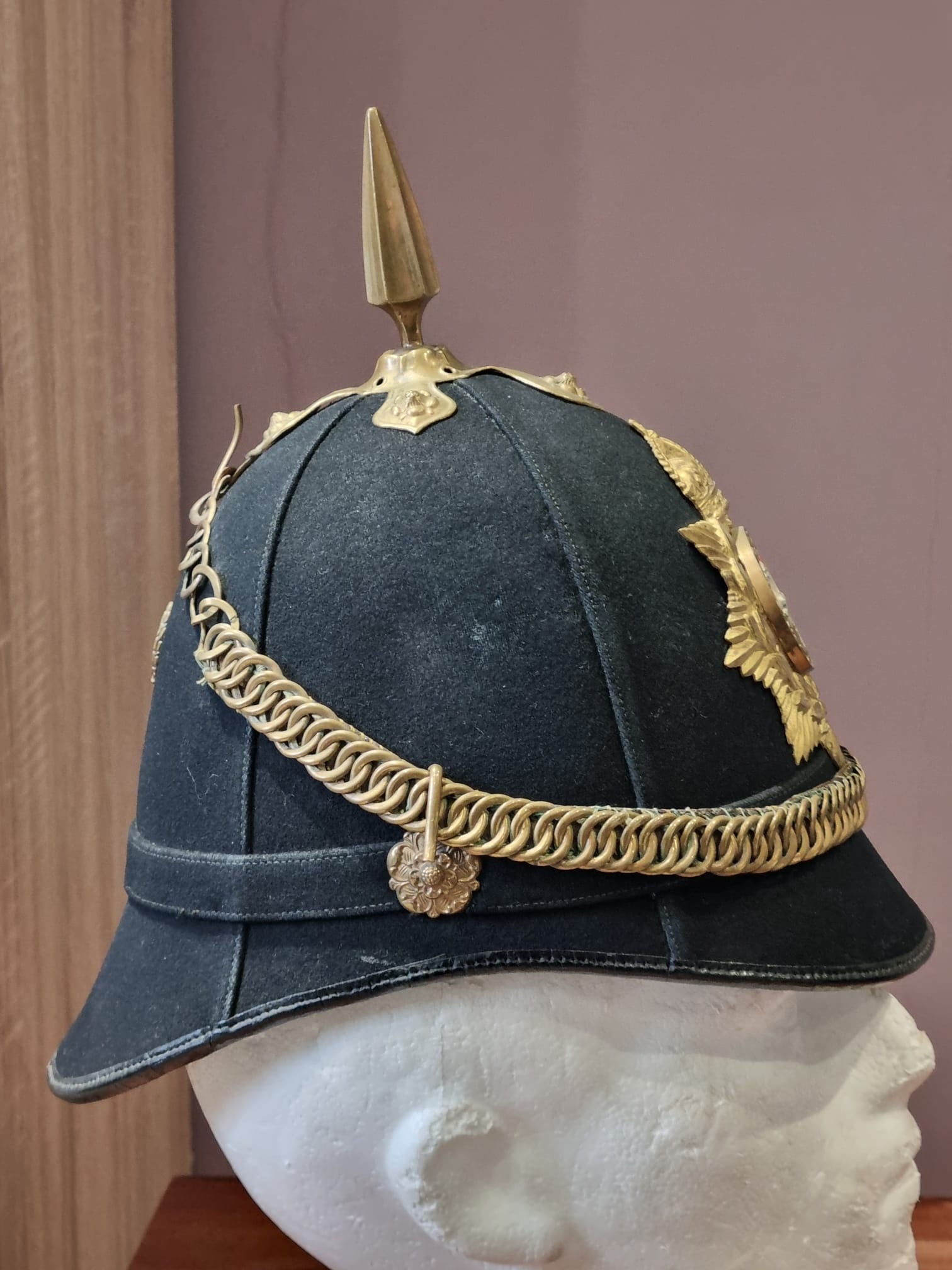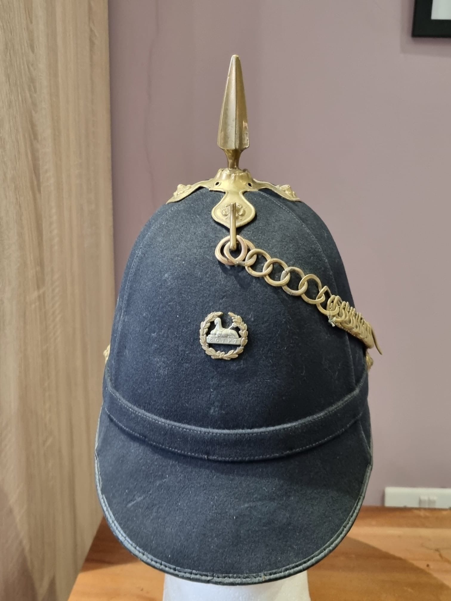 Complete with original chinstrap, hangers, roses etc and a lovely Gloucestershire front plate. With full leather liner and detachable spike.