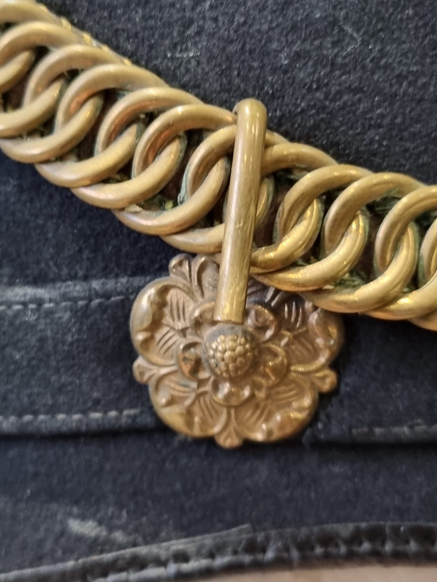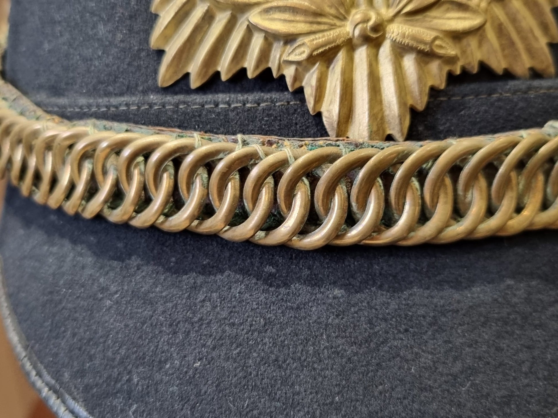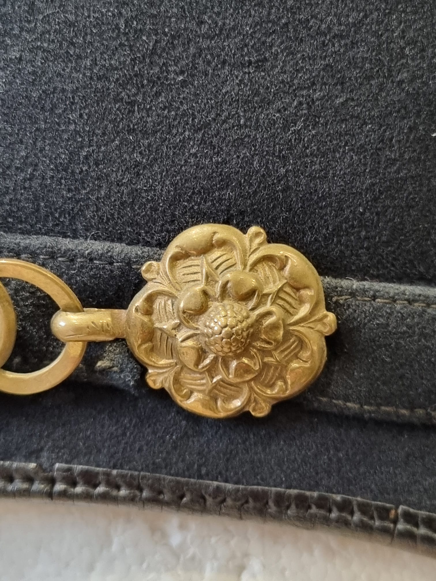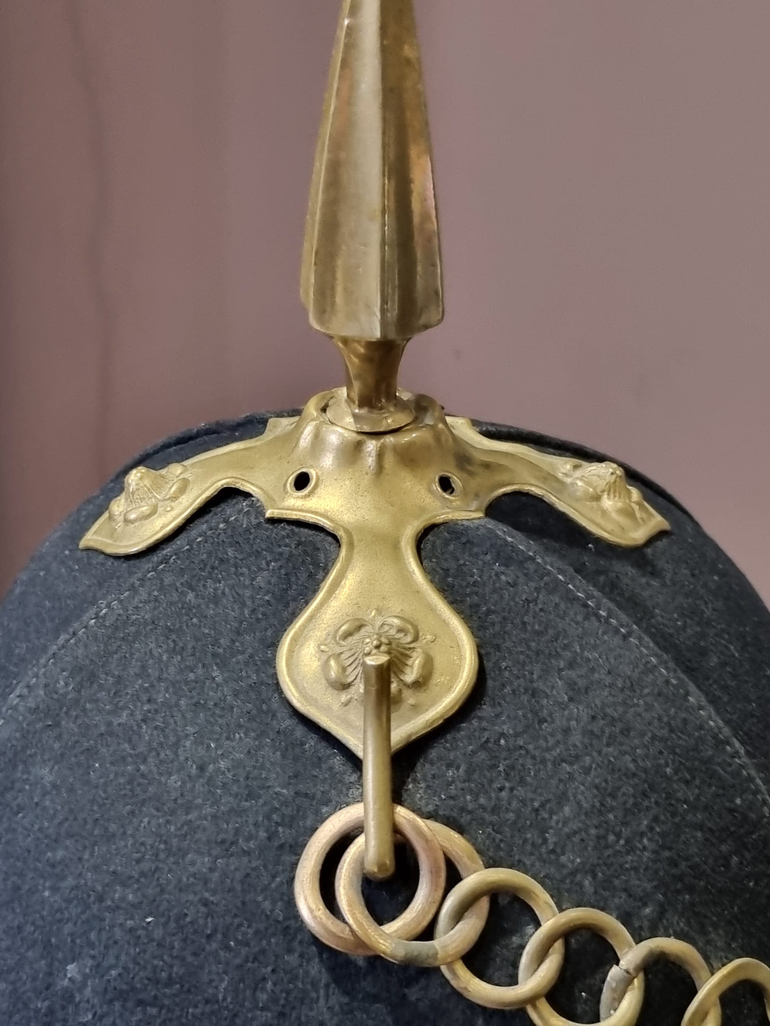 Complete with original chinstrap, hangers, roses etc and a lovely Gloucestershire front plate. With full leather liner and detachable spike.