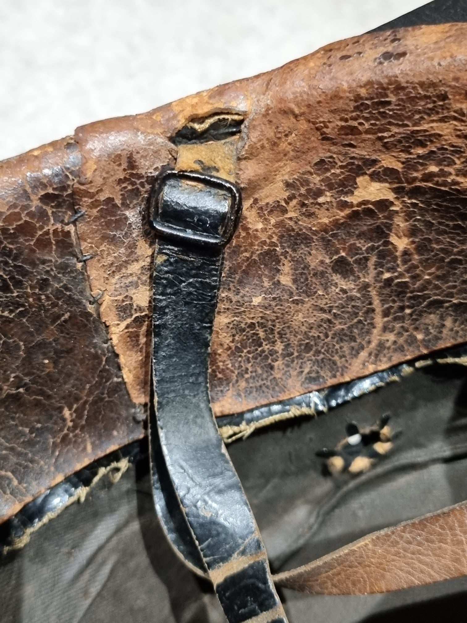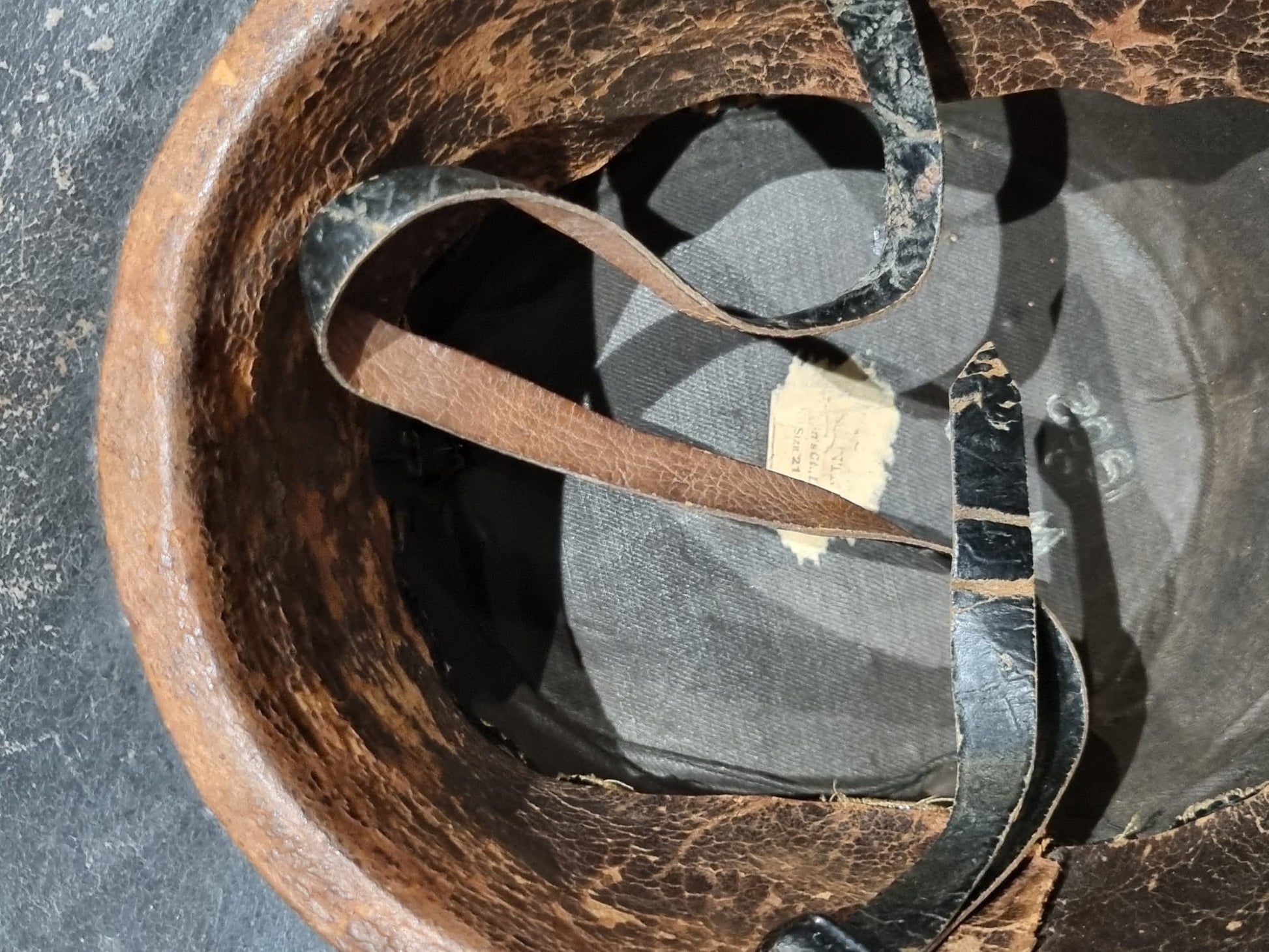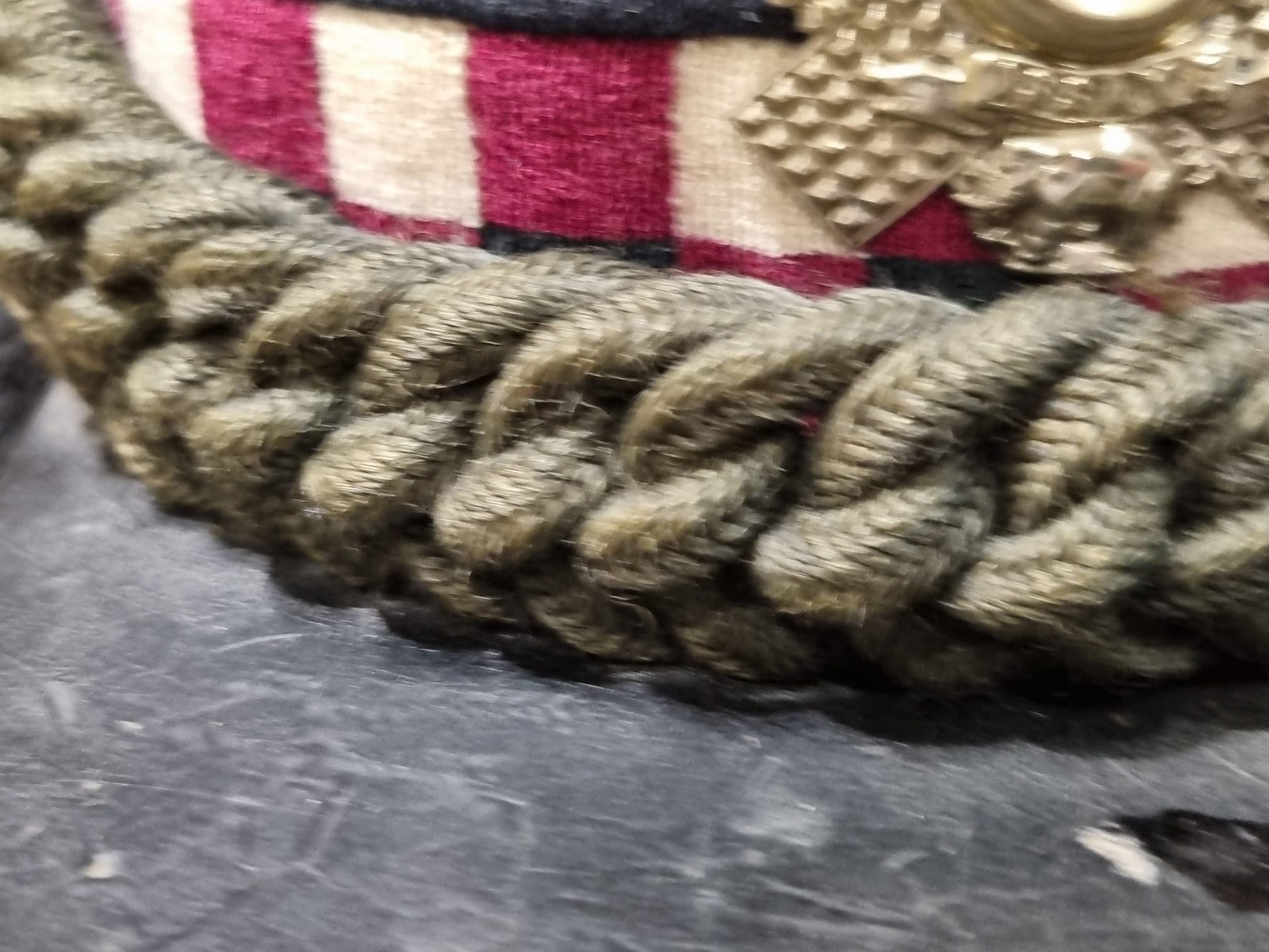 Complete with original pom, leather chinstrap, badges, rope decorations.