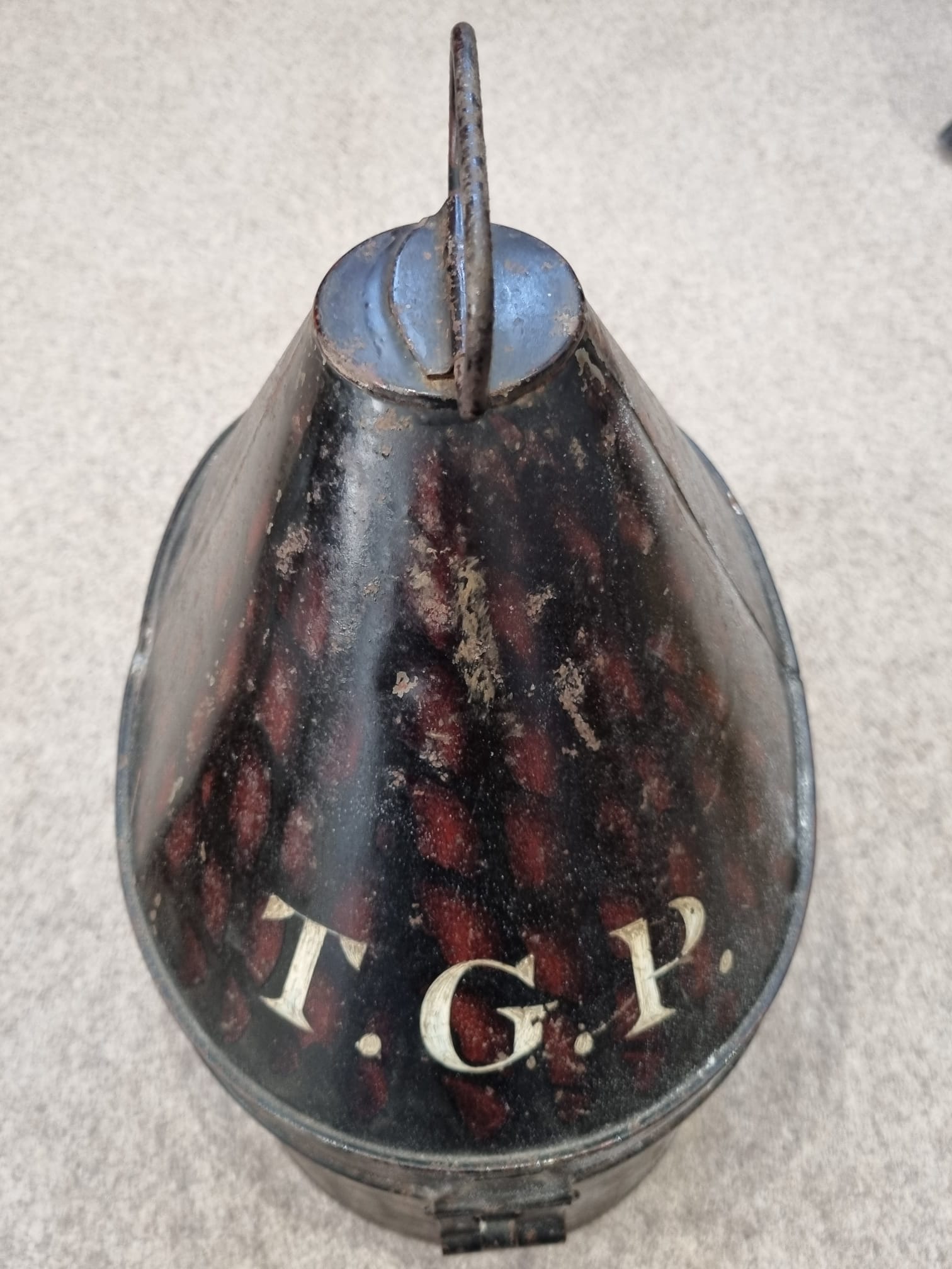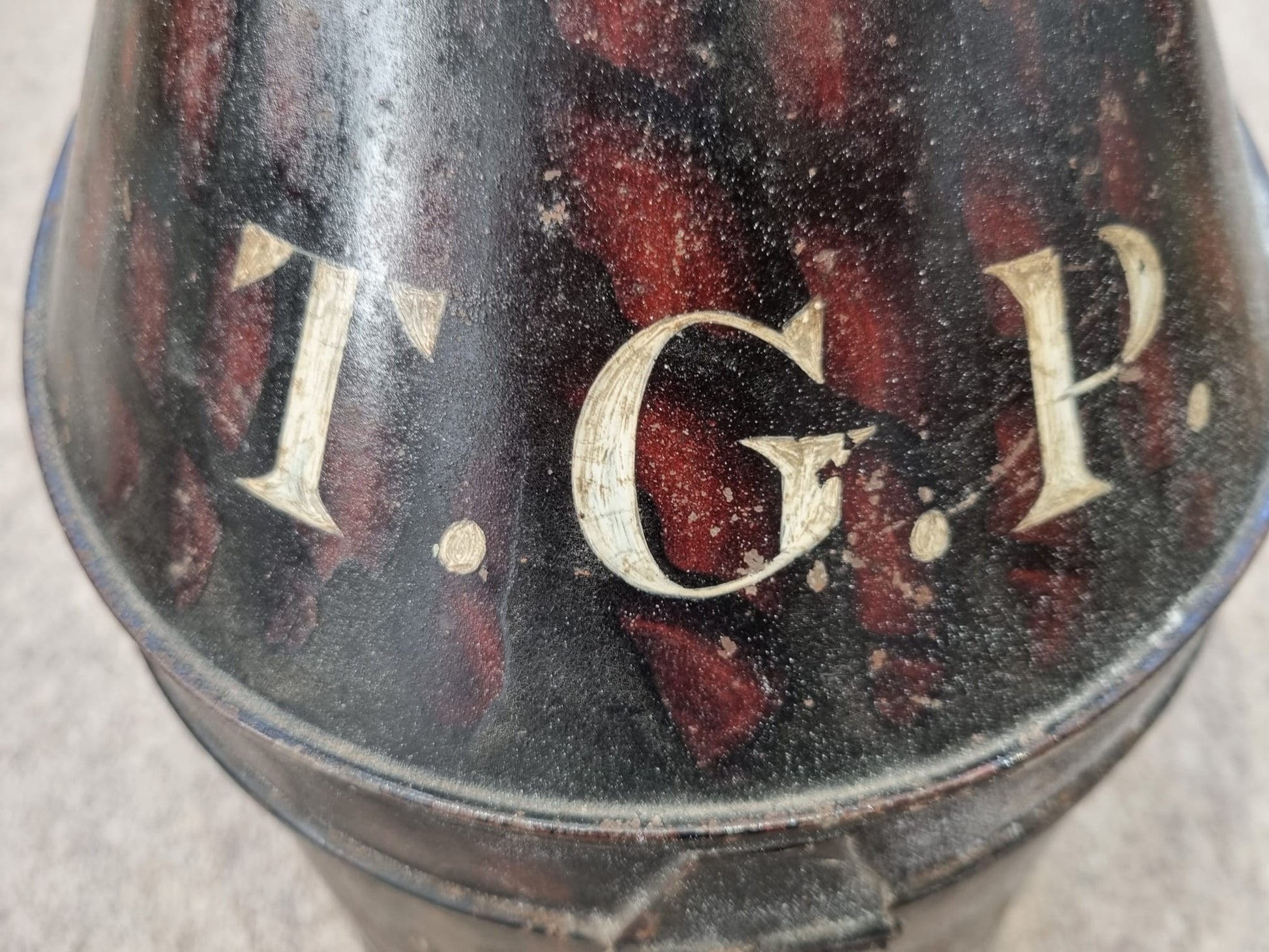 Initials T. G.P. stamped onto tin.