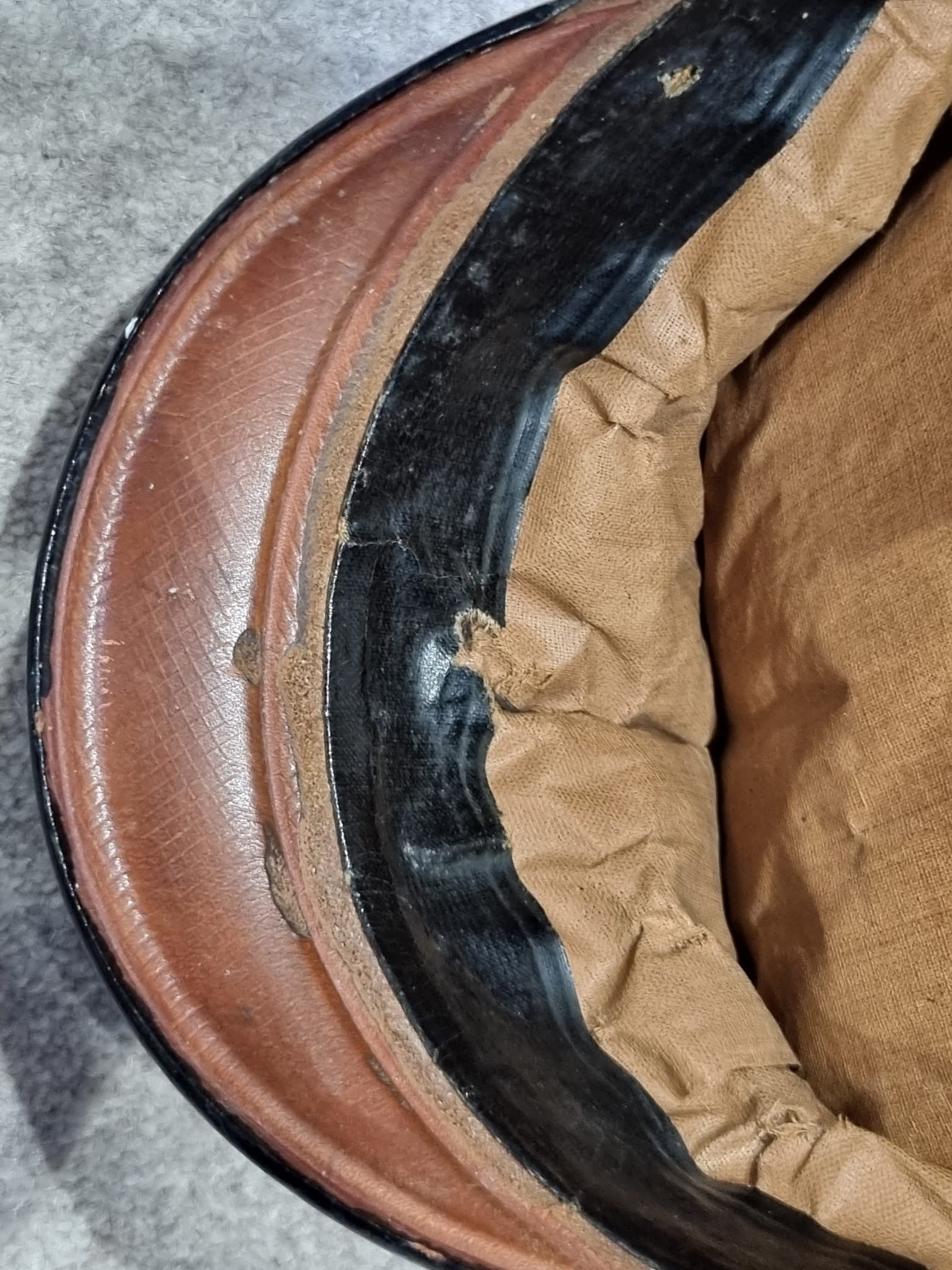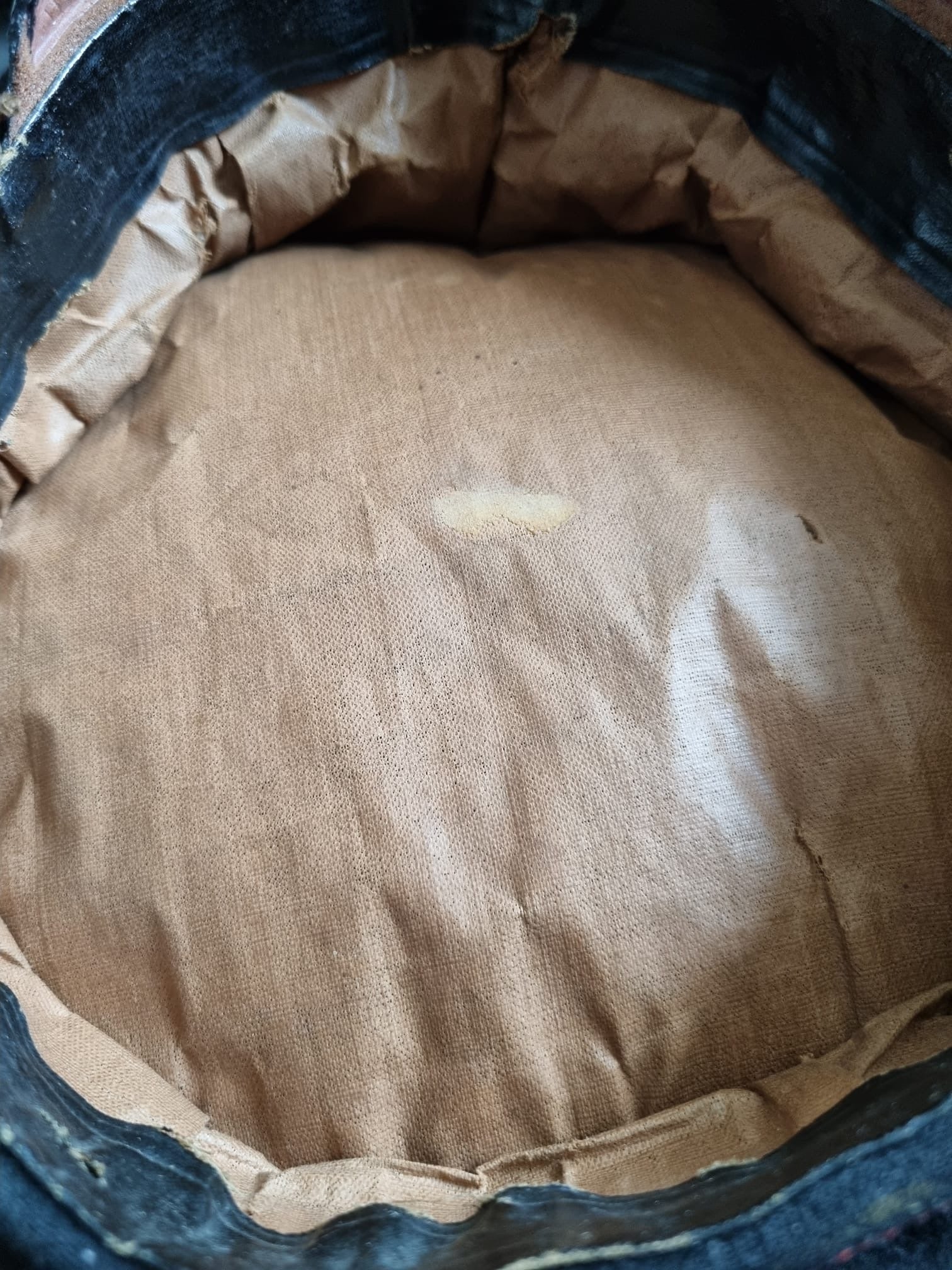 A number of moths holes under the rim / at the back. No moth damage at the front or on top. A good number of small brown stain patches on top.
