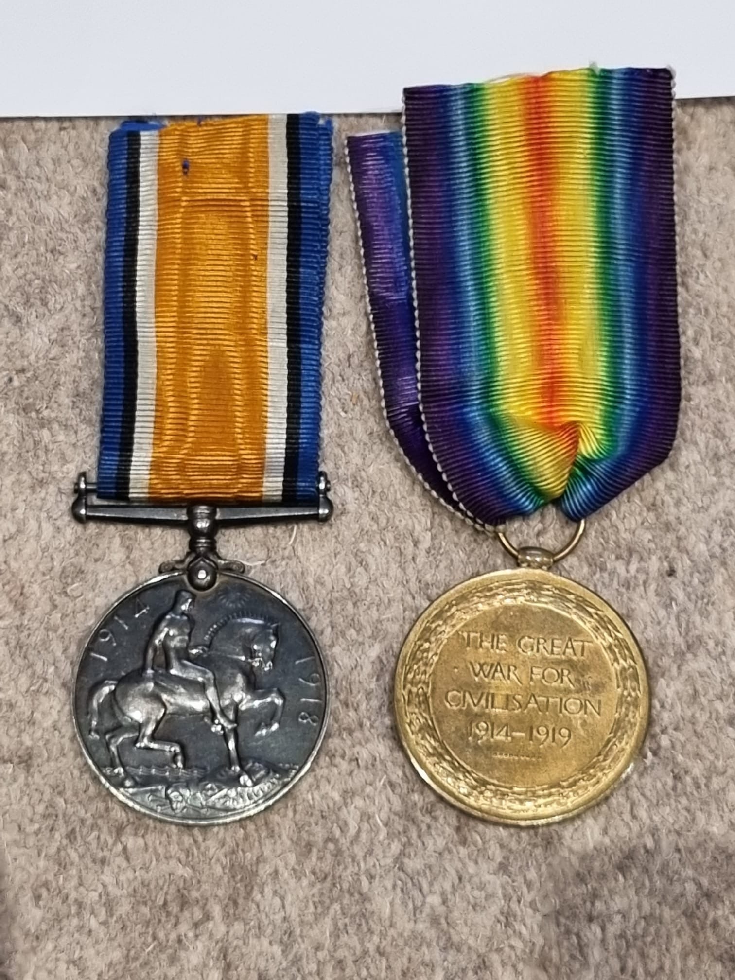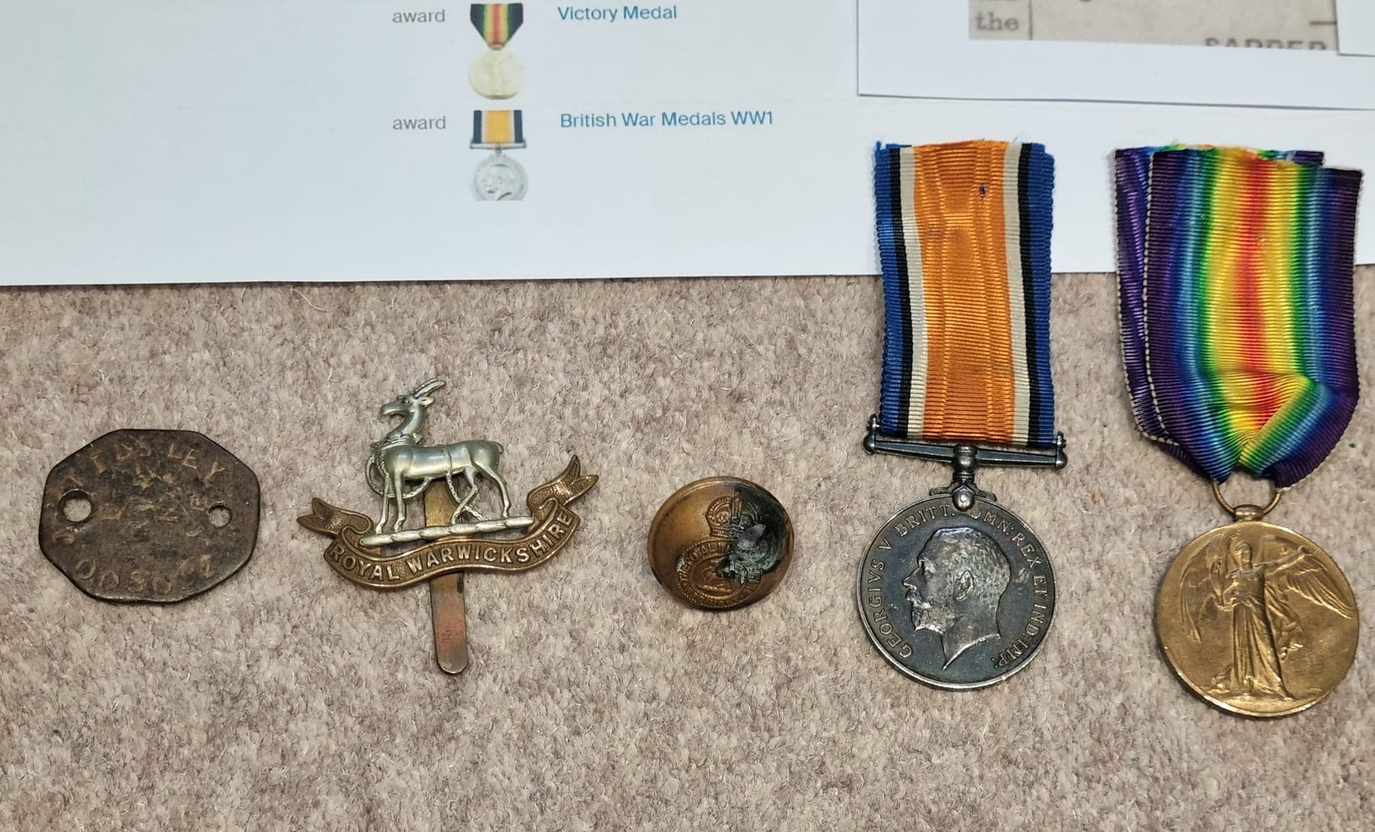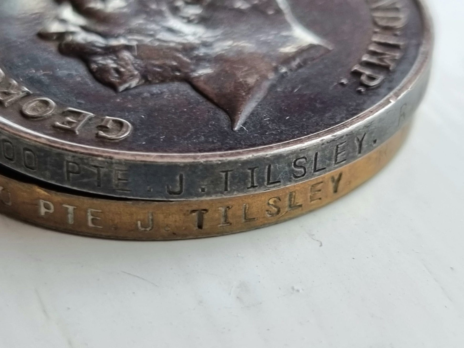 A Fascinating and highly evocative WW1 medal duo set to Private Joseph Tilsley (Royal Warwickshire Regiment), including his cap badge, dog tag and button which saved his life when he was wounded in action.
