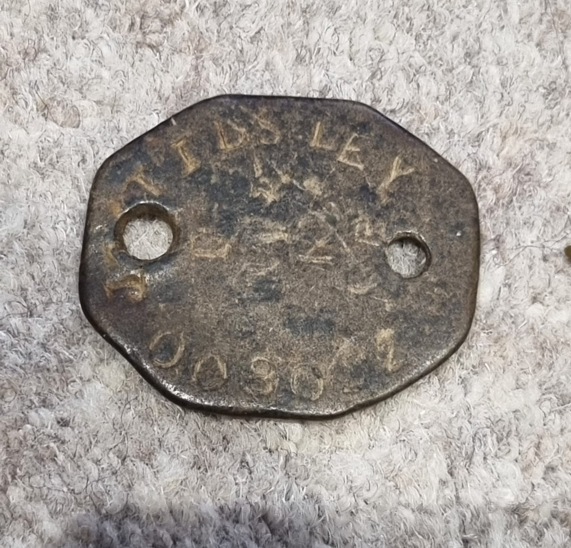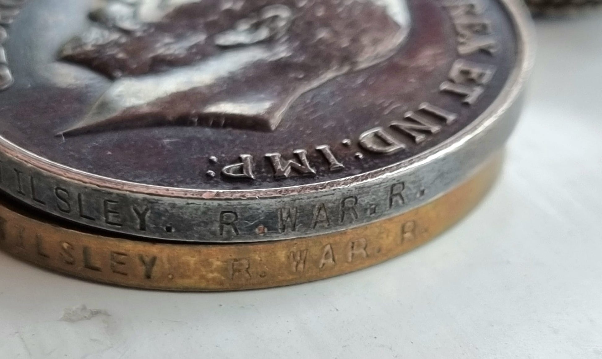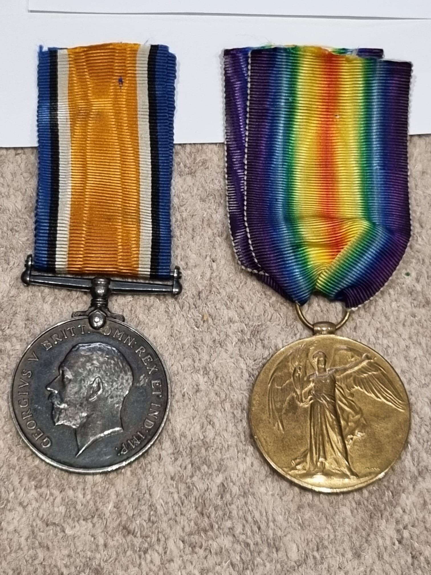 A Fascinating and highly evocative WW1 medal duo set to Private Joseph Tilsley (Royal Warwickshire Regiment), including his cap badge, dog tag and button which saved his life when he was wounded in action.