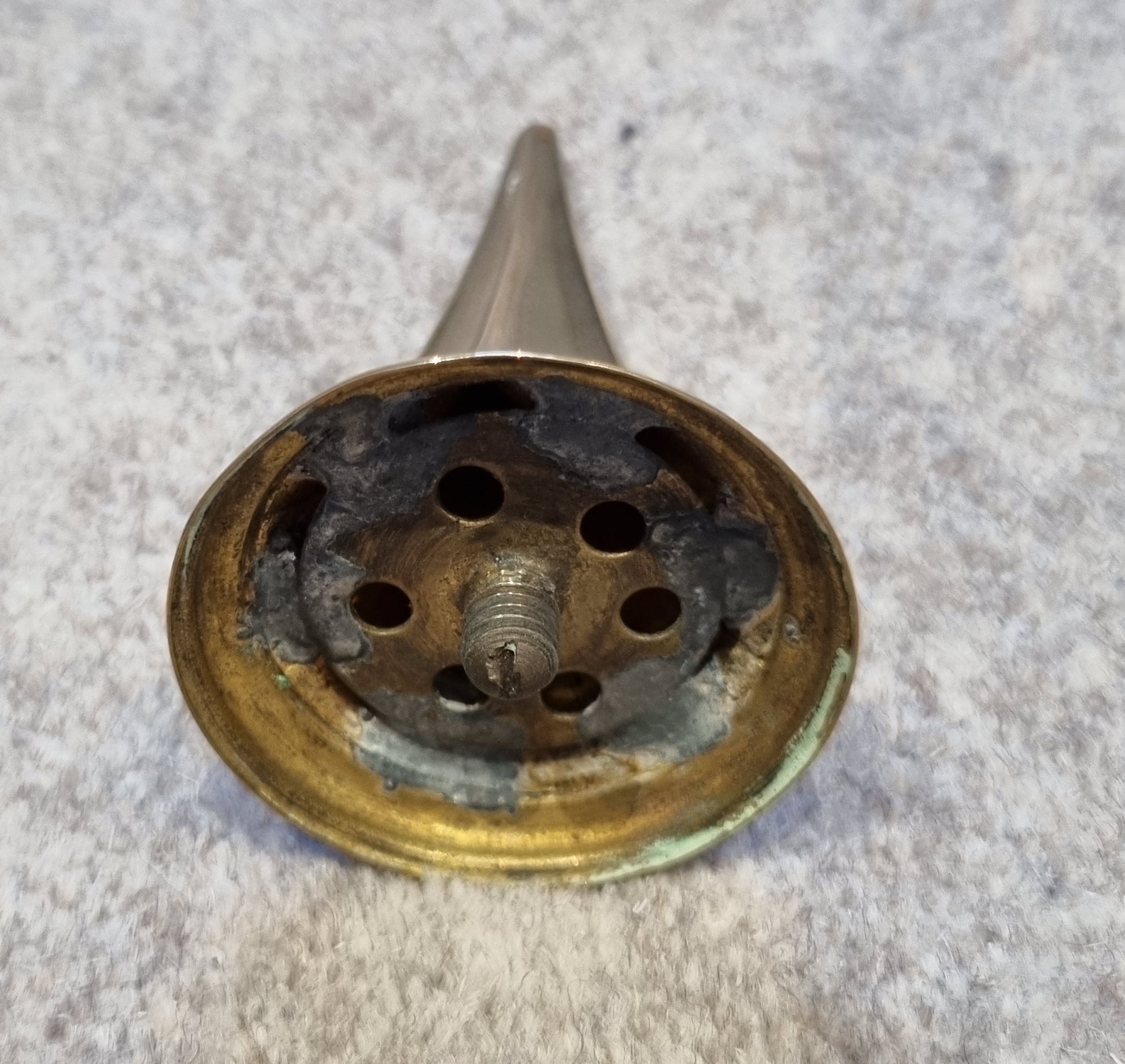 There is evidence that the spike base has been replaced some time ago with marks and holes for a round spike base - the current fixings show good age.