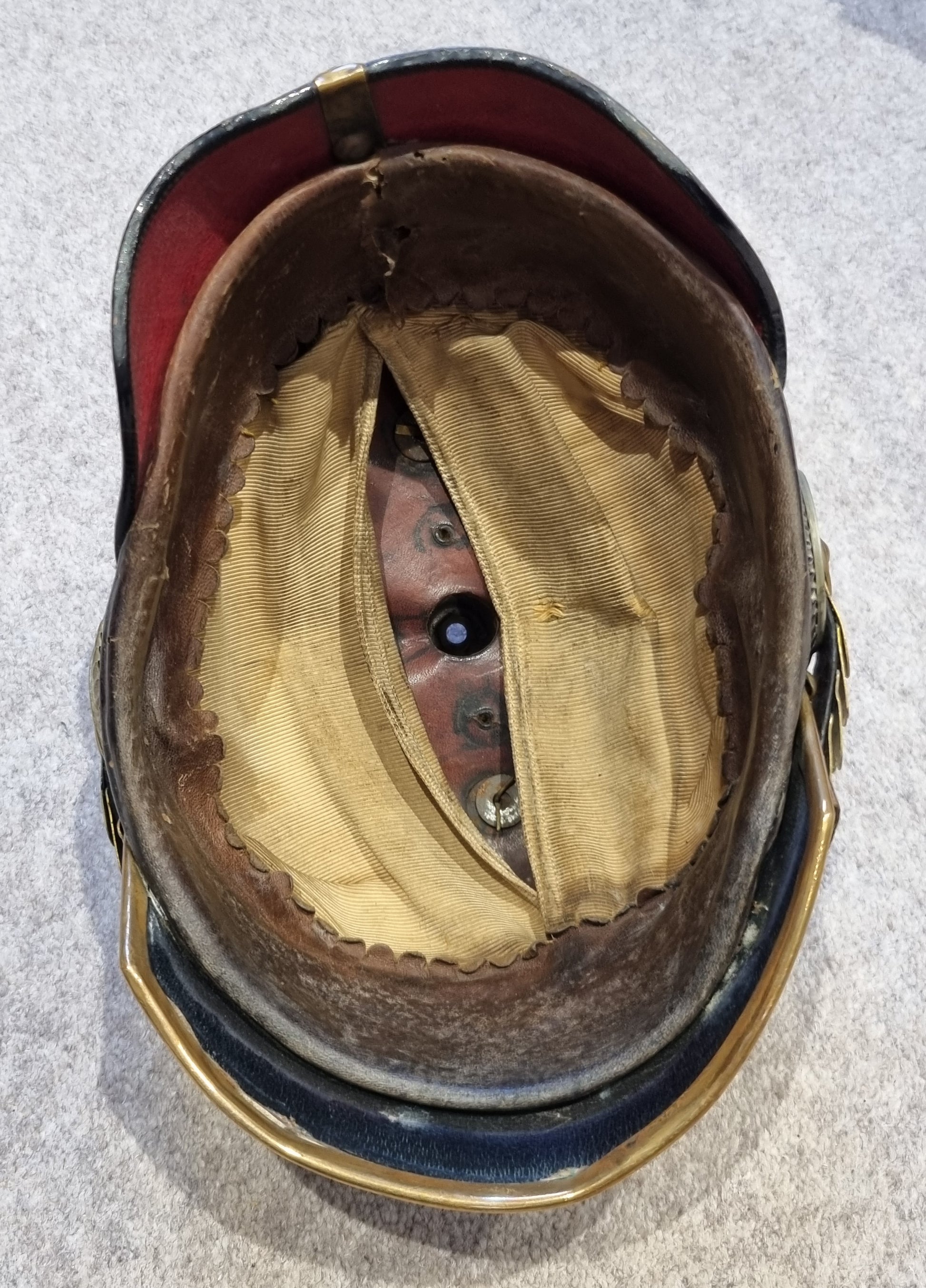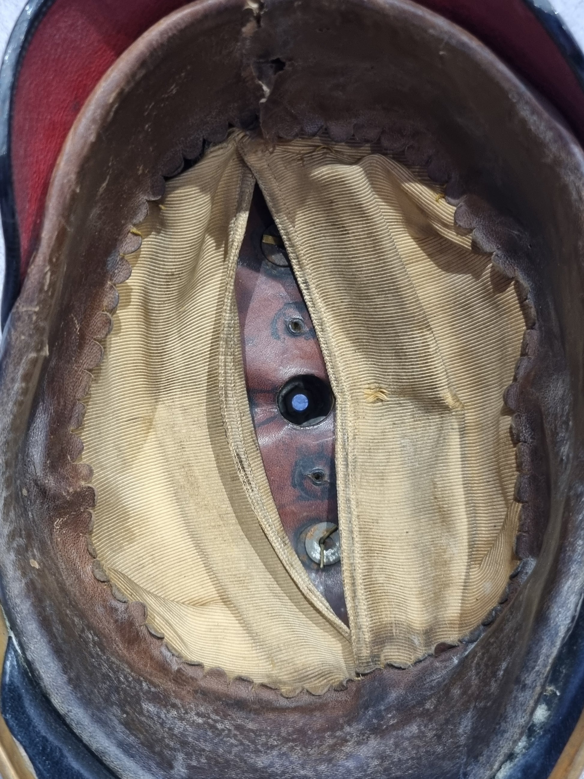Officers ribbed ochre silk fabric liner + leather sweatband liner all in place. Fabric liner is partly detached at one end.