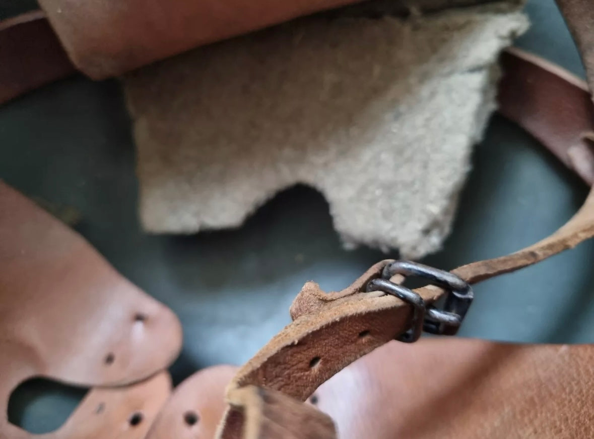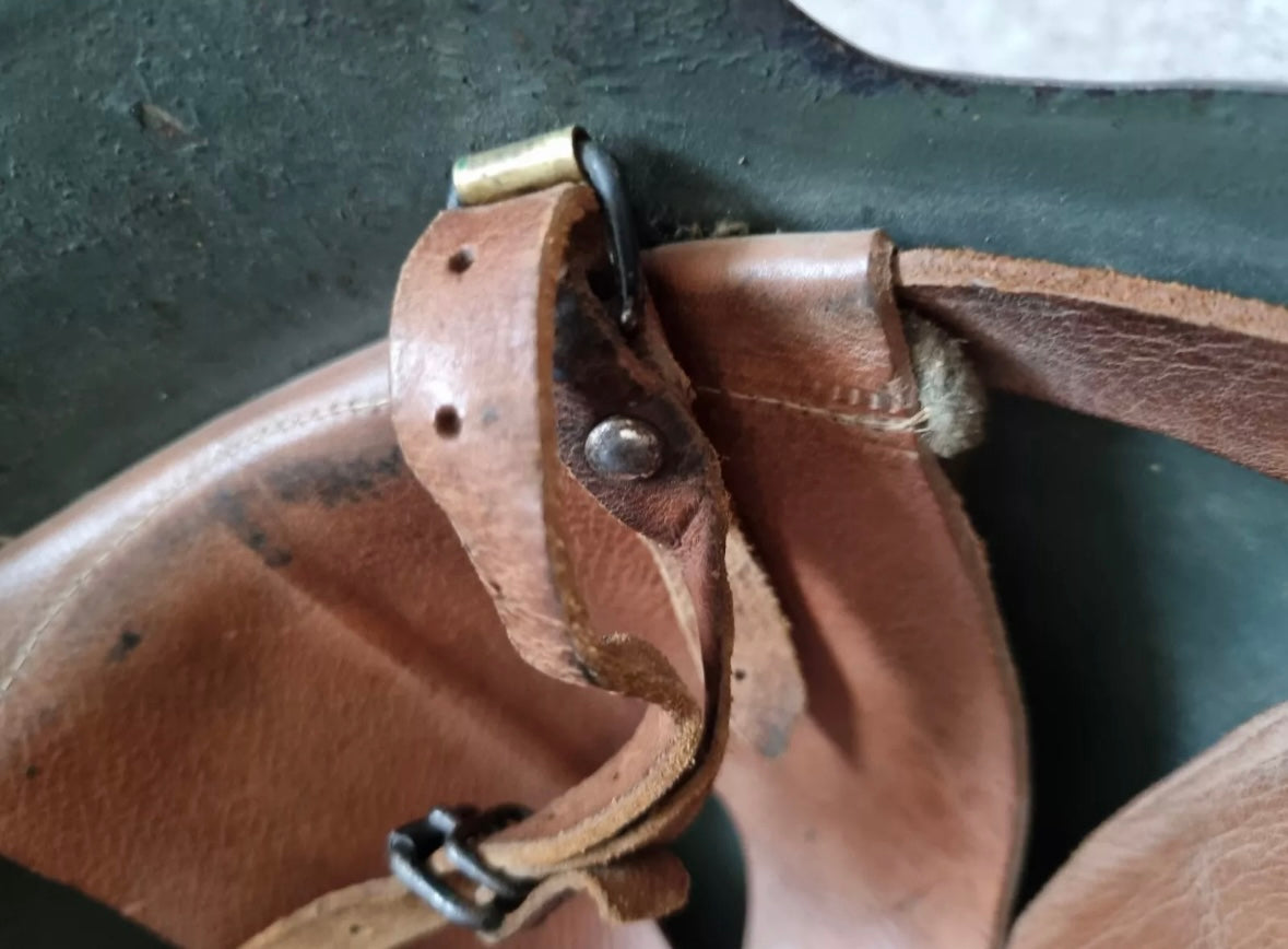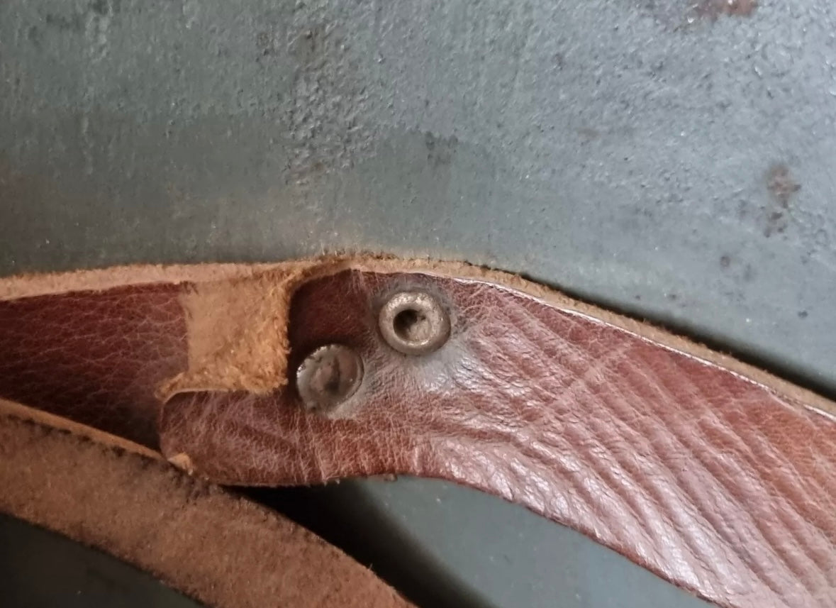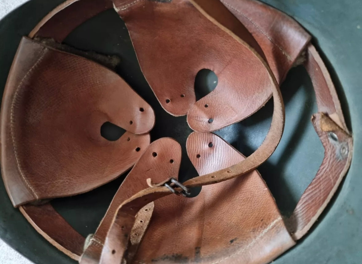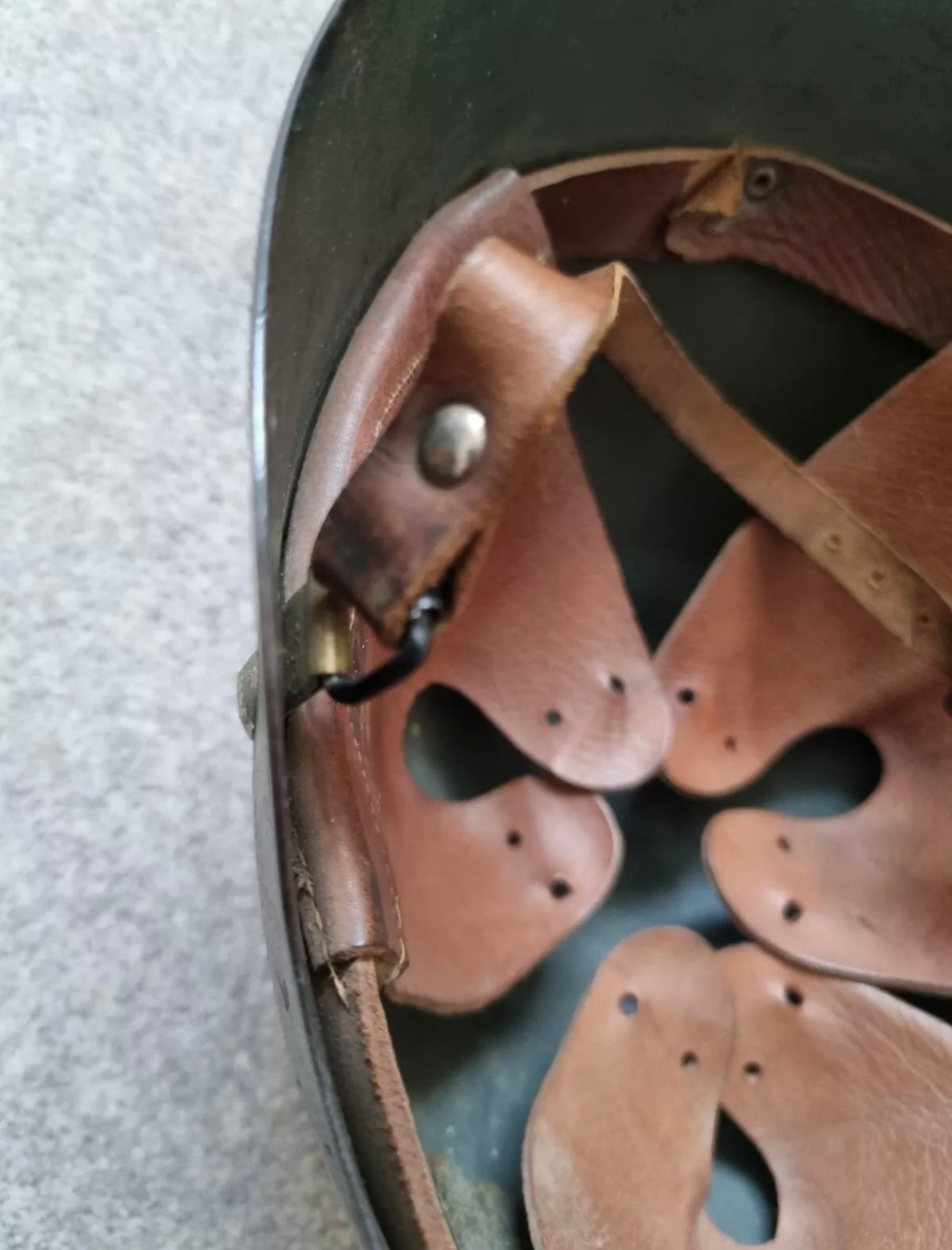 With original tan leather liner and first pattern rivets, and original chinstrap.