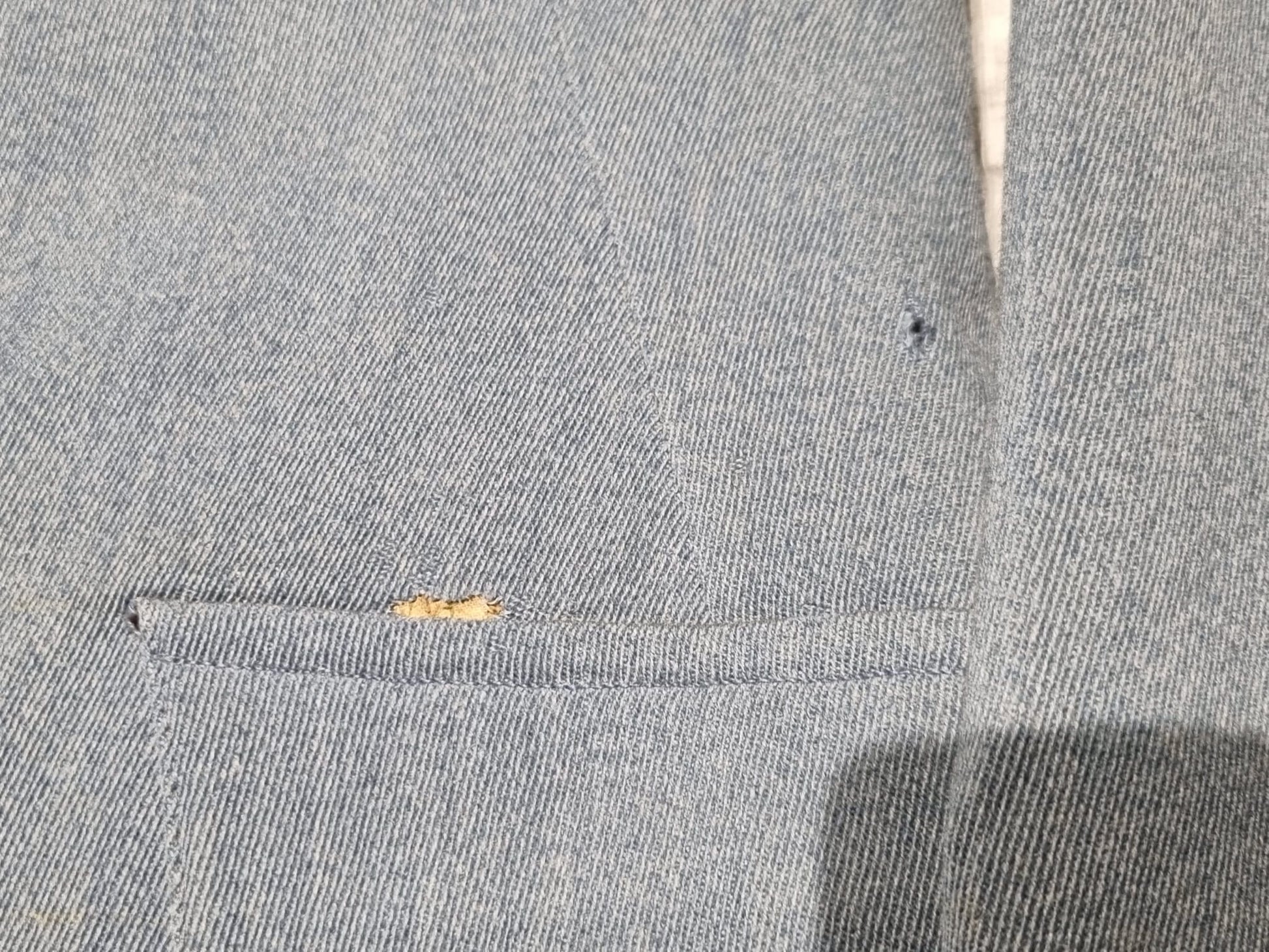 In nice condition - some light mothing, small holes as pictured. Some yellowing around the front buttons area.