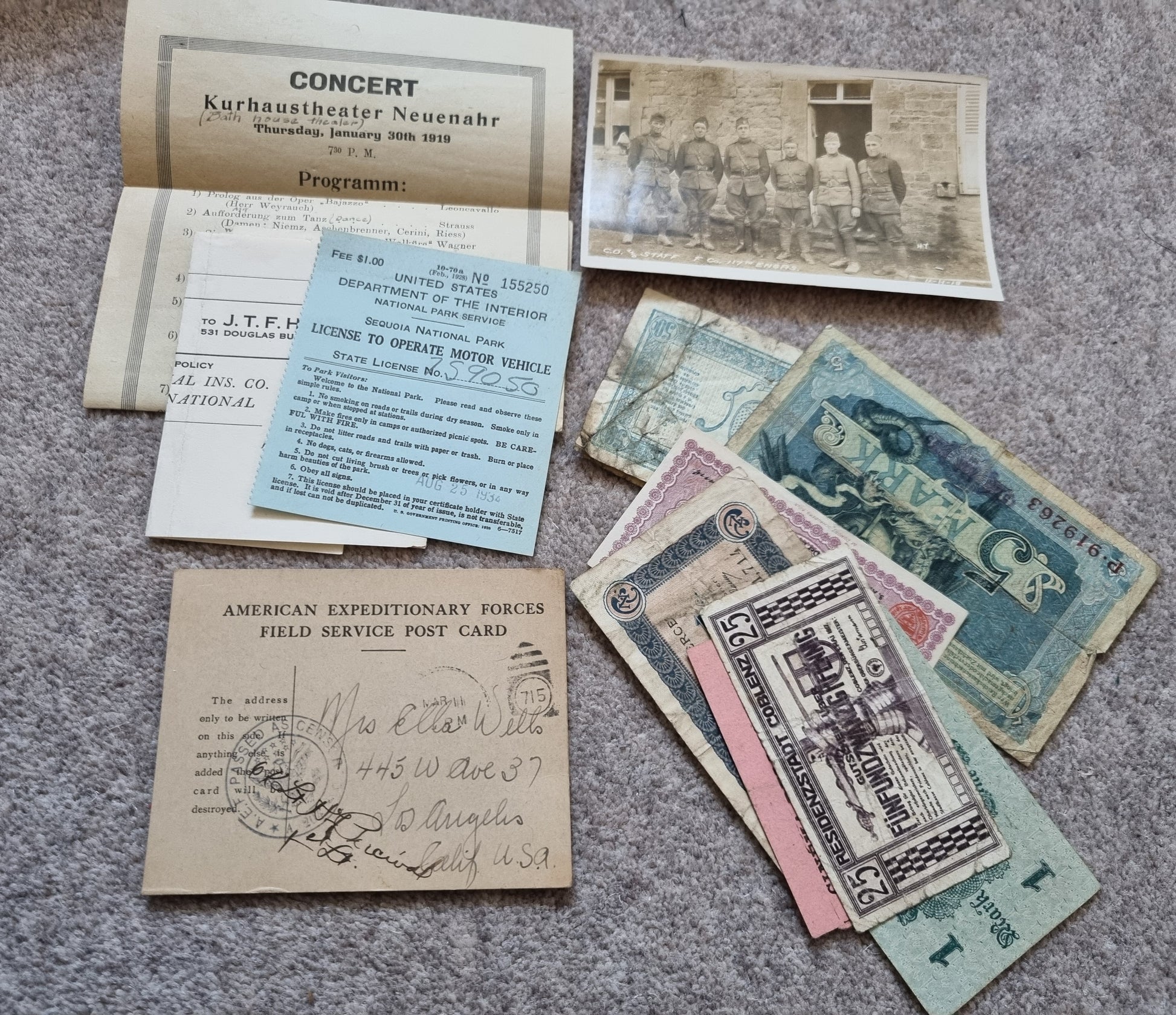 Also contains a number of WW1 French and German bank notes, some period theatre Ephemera.
