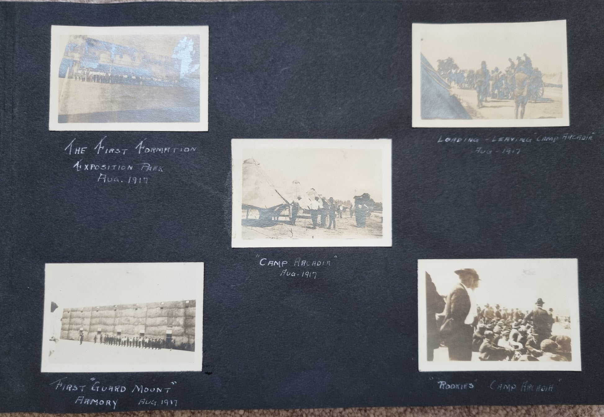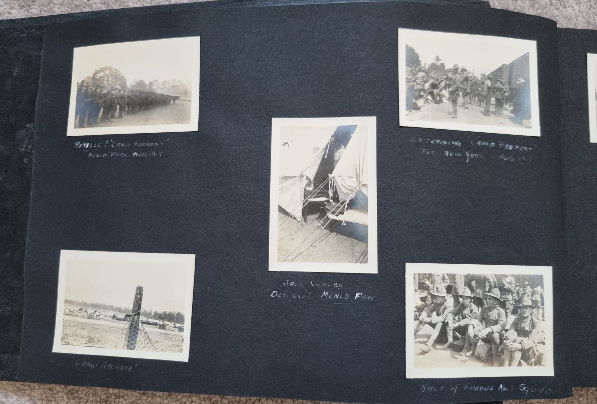 A good number of photos are annotated starting in August 1917 at "Camp Arcadia", Carlstrom Field in Arcadia, Florida and then Camp Fremont at Palo Alto.