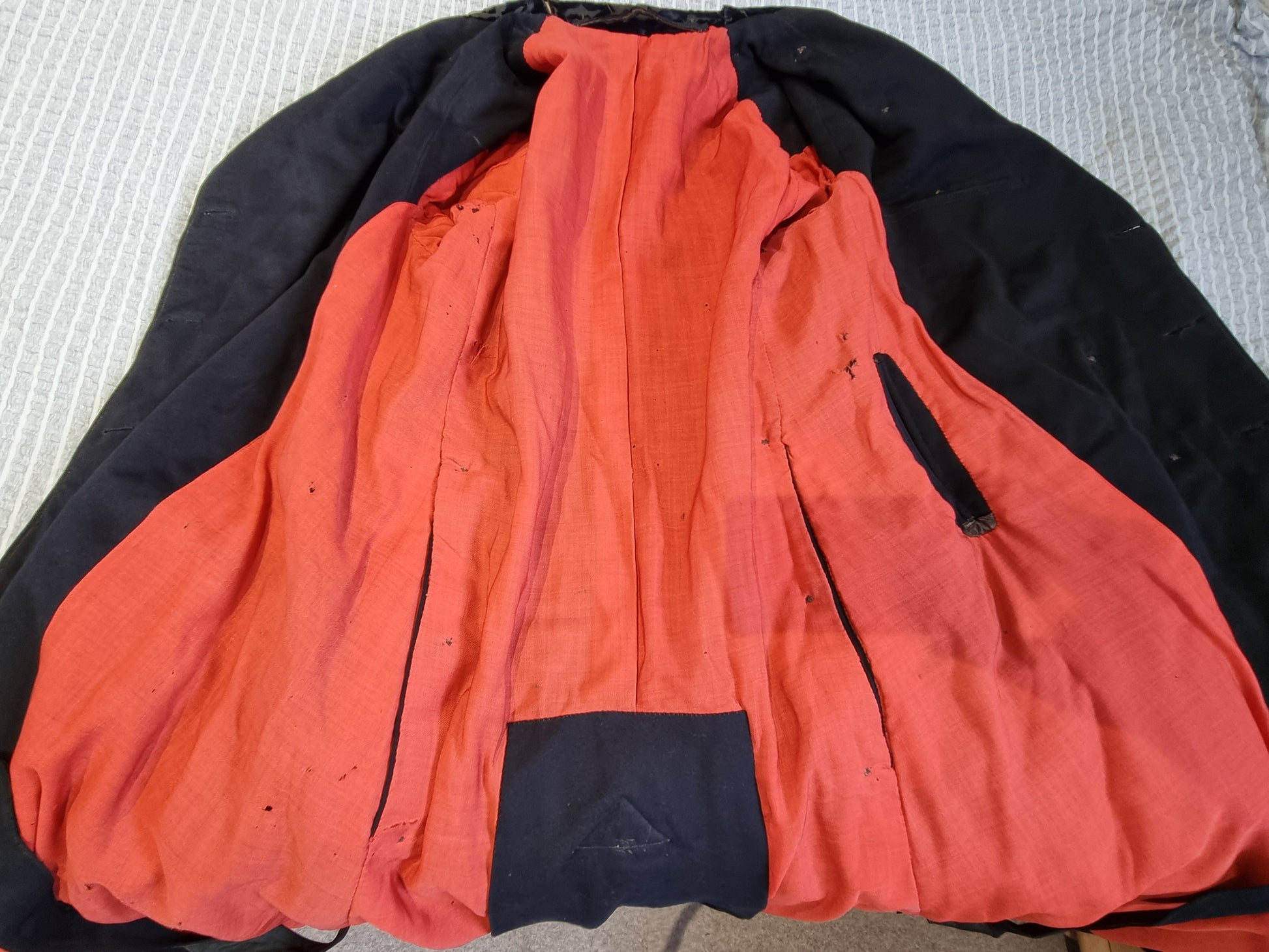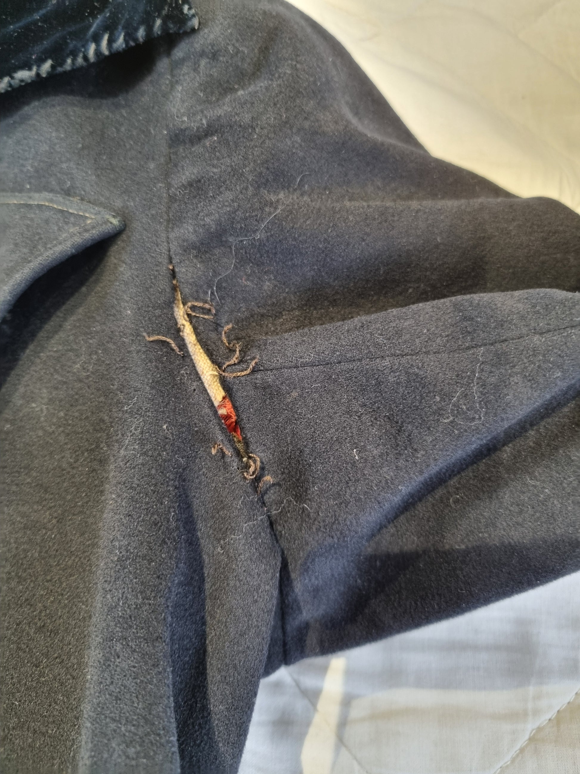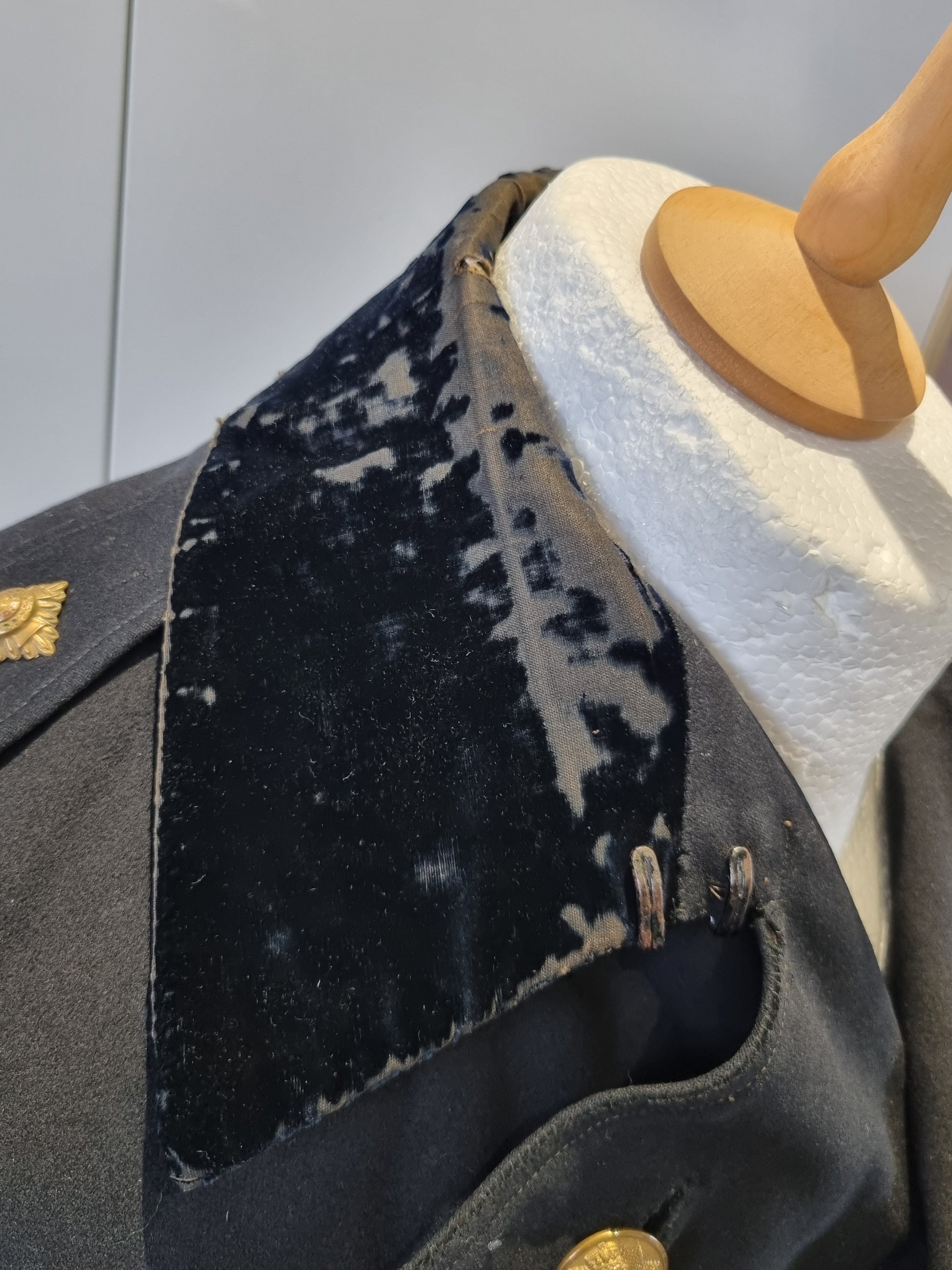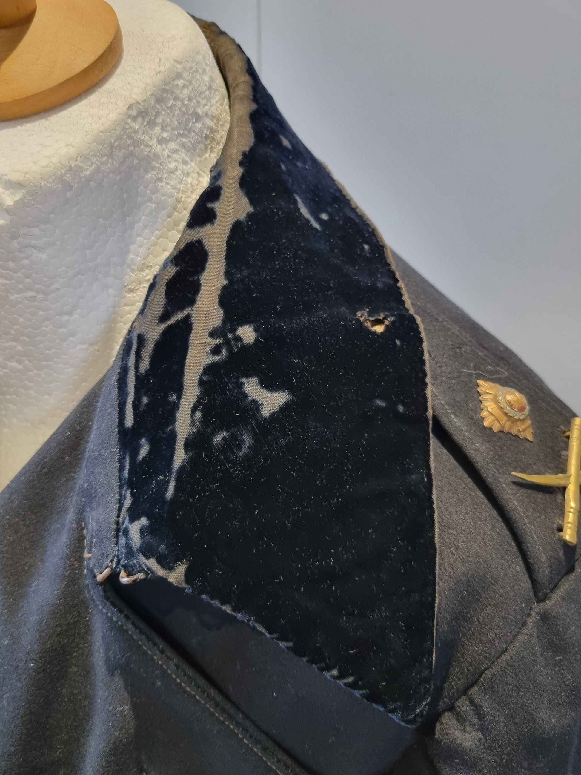Most of the coat is in very good condition - the velvet faced collar has a lot of wear / bare patches though. One of the armpit seams is unstitched for about 5 cm but could be easily restitched.