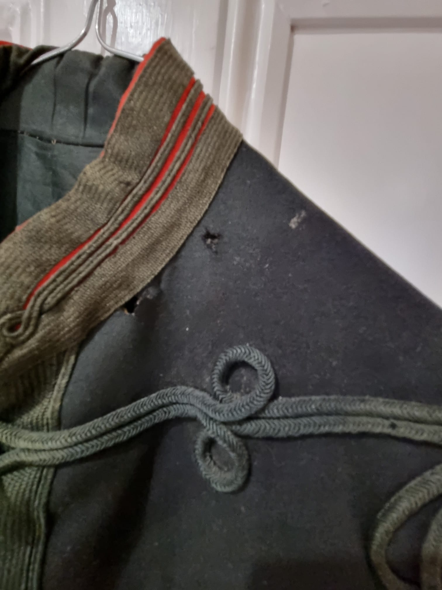Trousers/overalls are thick black wool and with broad greenish stripe. All buttons present for fly and braces.