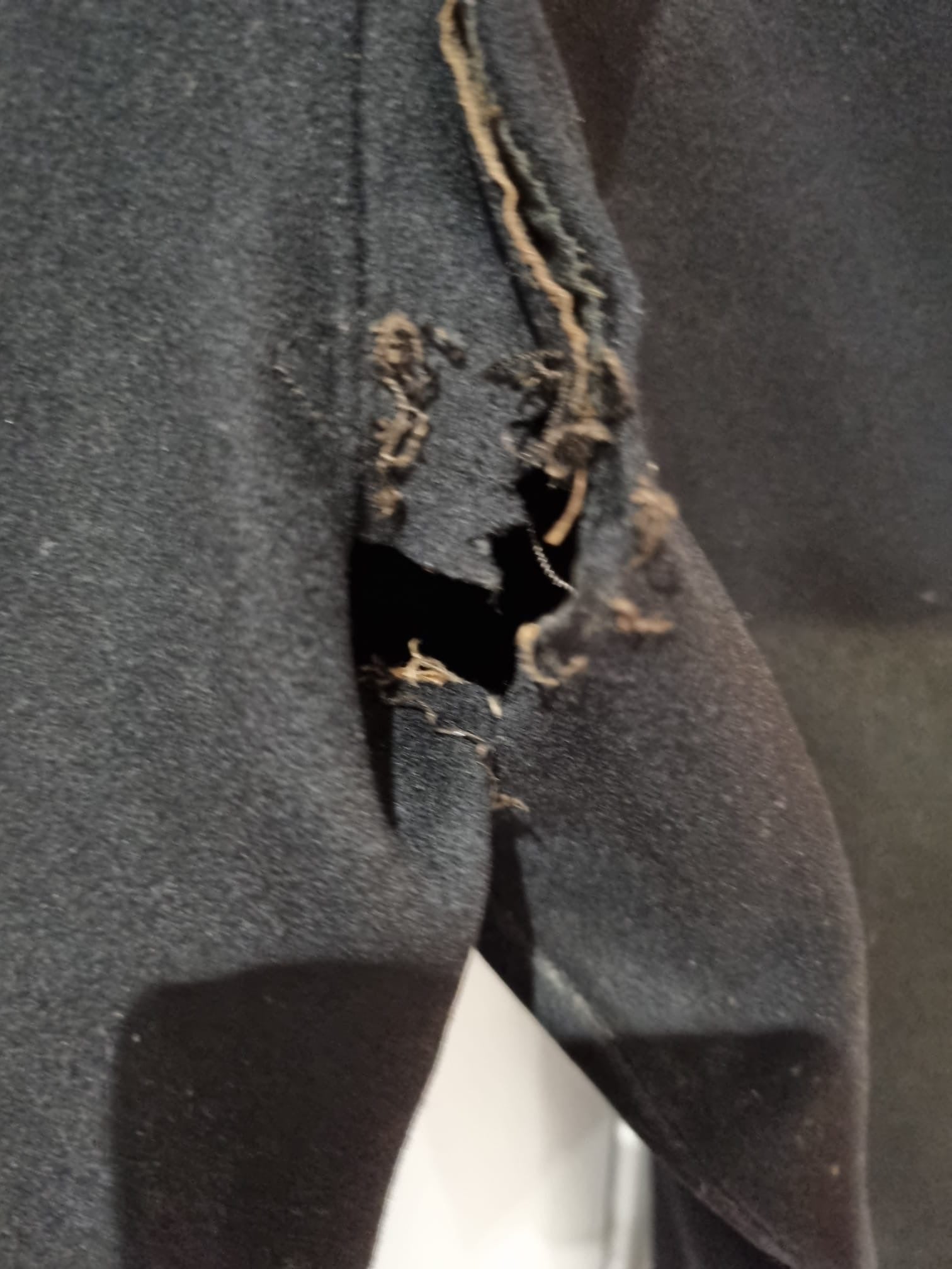 A seam requires repair just below the fly (pictured). The trousers have a distinct fade line halfway up them (shown in the pictures - this is not a shadow but fading) plus there are some hardened deposits on the leg though it should be possible to remove these with care.