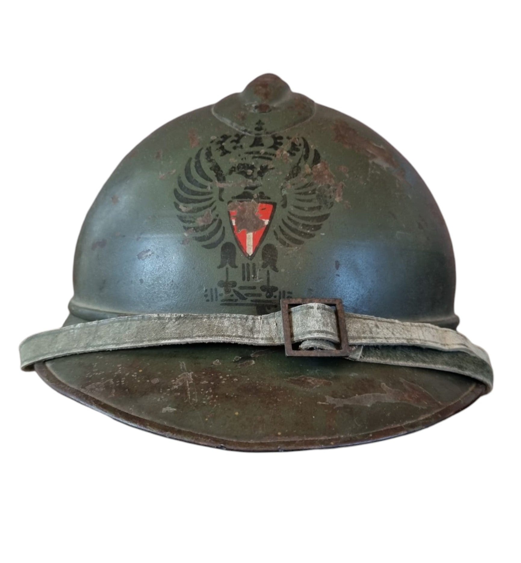 This helmet is an early WW1 example, a French made M15 'Adrian' helmet from before the introduction of the Italian made 'Lippmann' model. It has been reconditioned after 1925 (as many WW1 Italian helmets were) for use by the Corps of Public Security Agents.