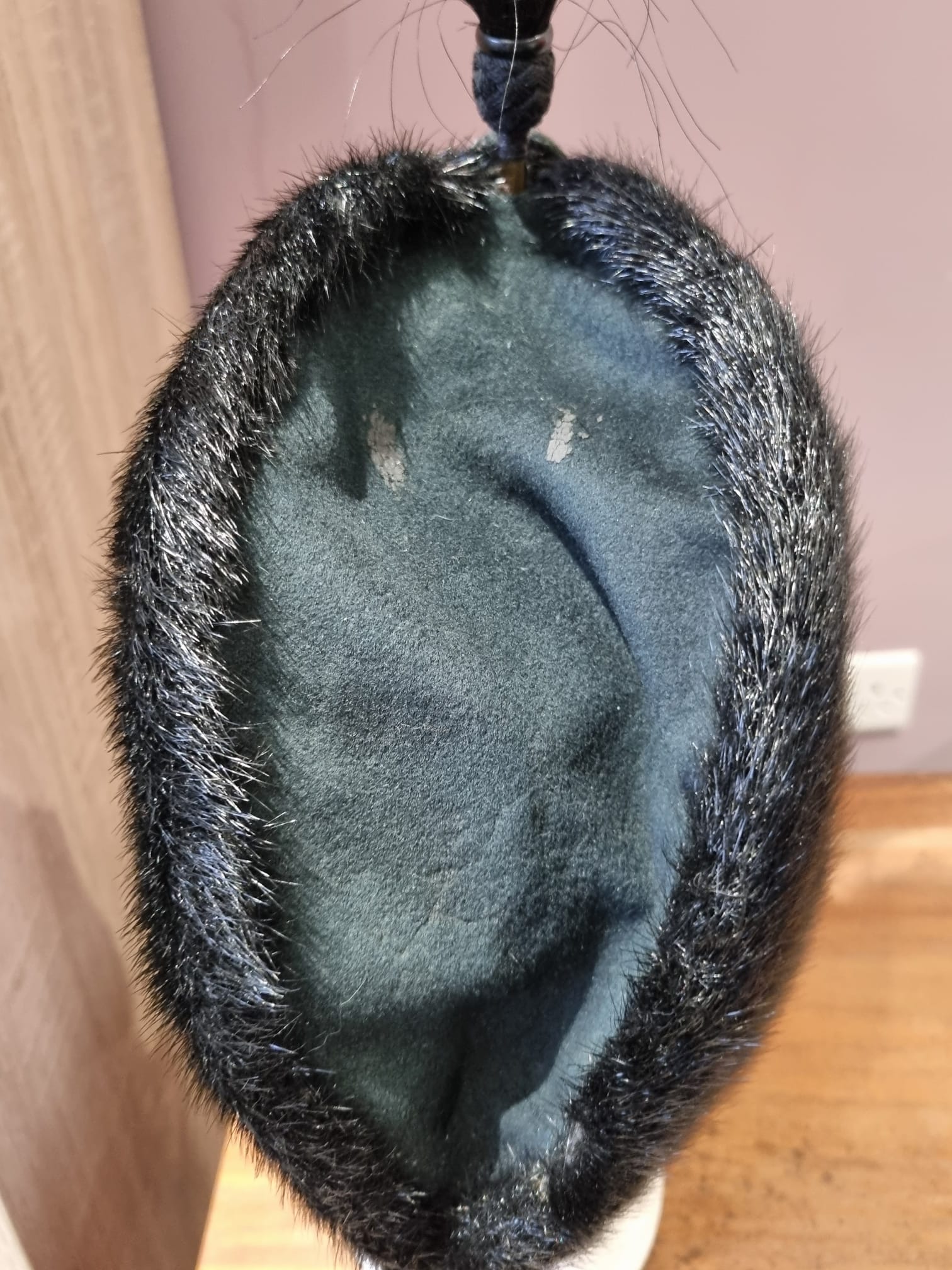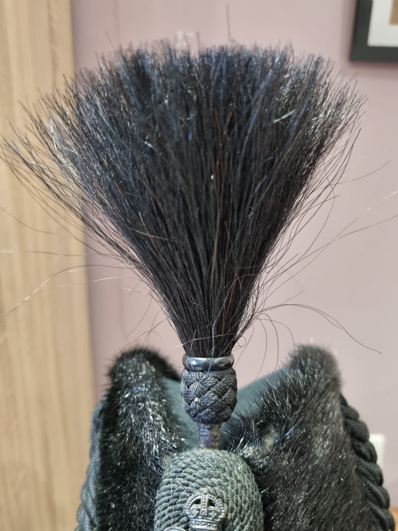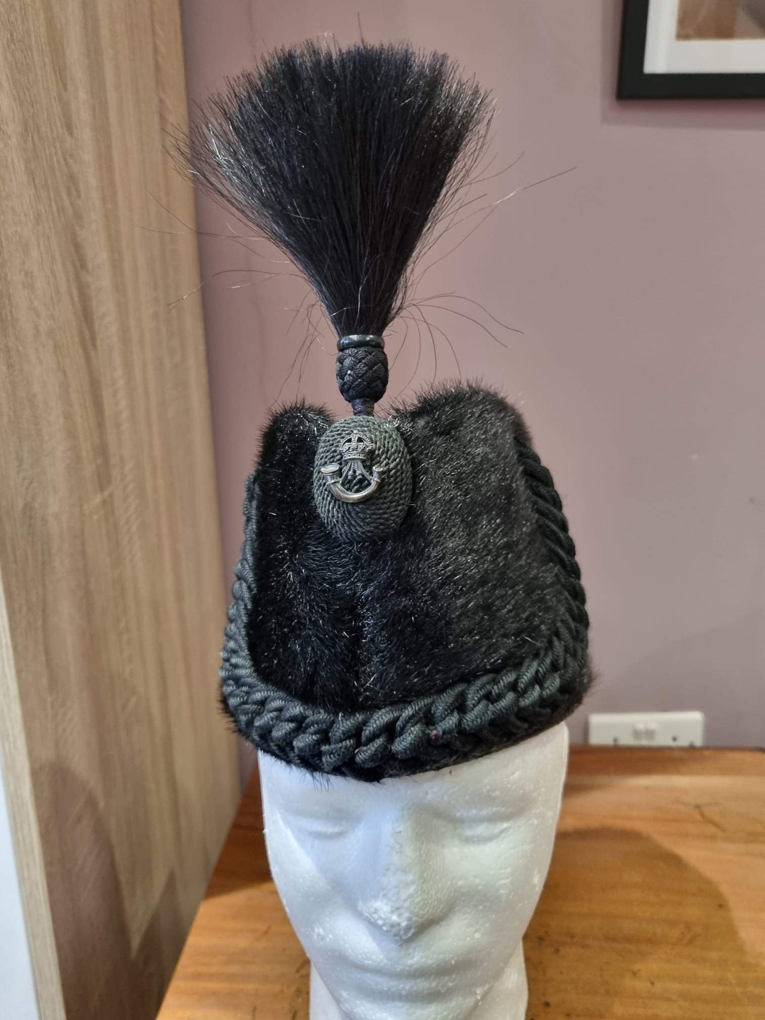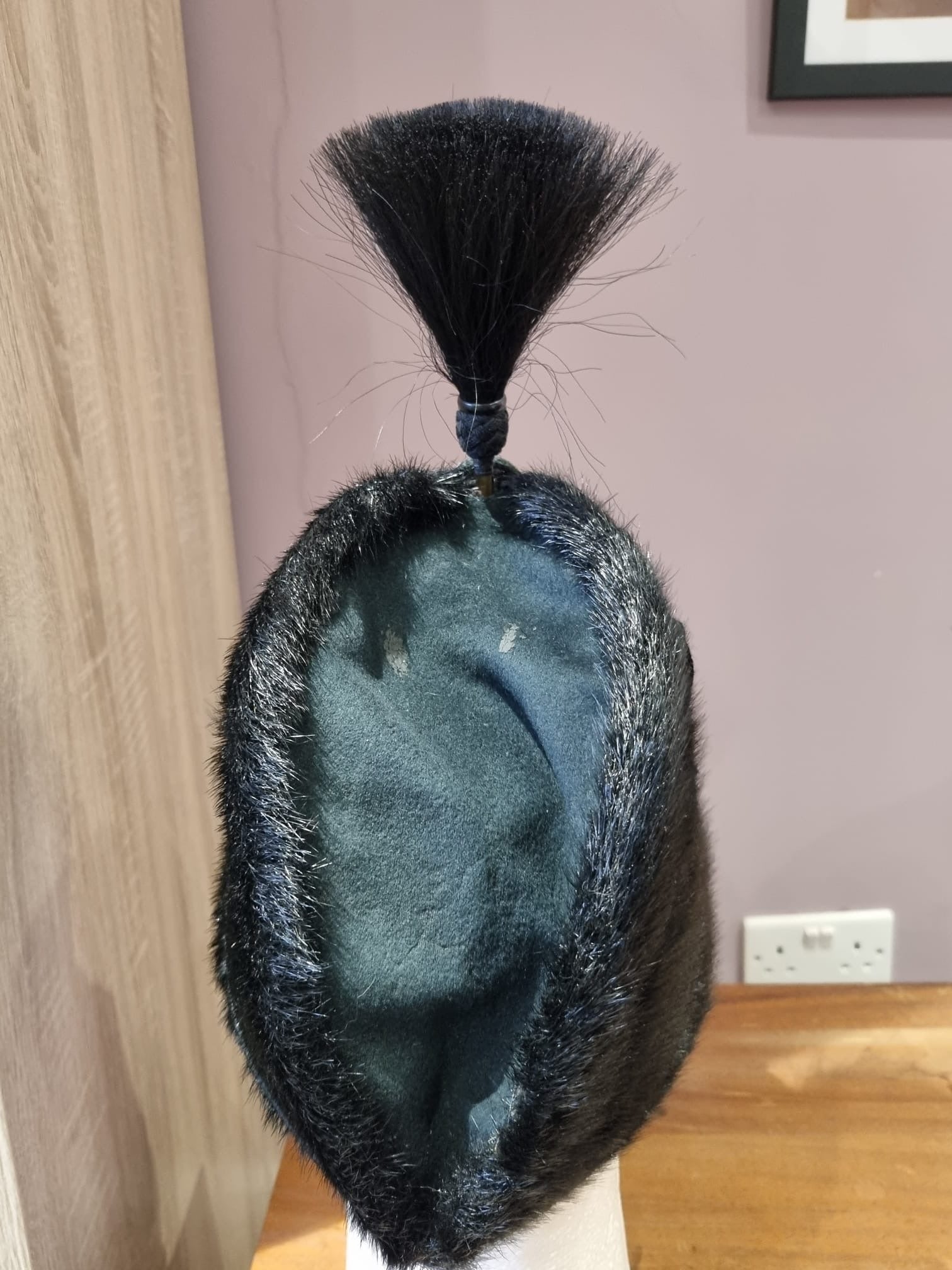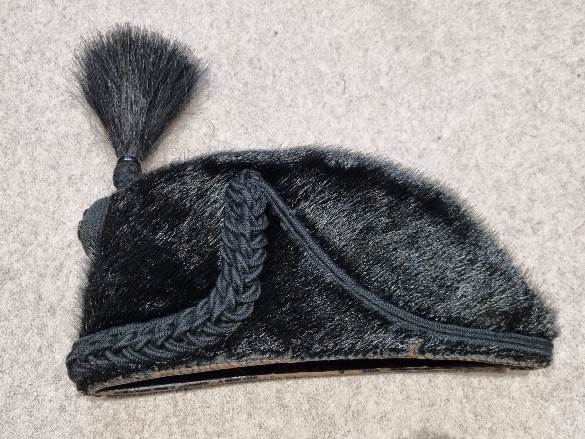 With black cotton top, corded boss set with a crowned strung bugle bagde and black horsehair plume, with black cord plaits leading up at the sides, with black patent leather sweatband.