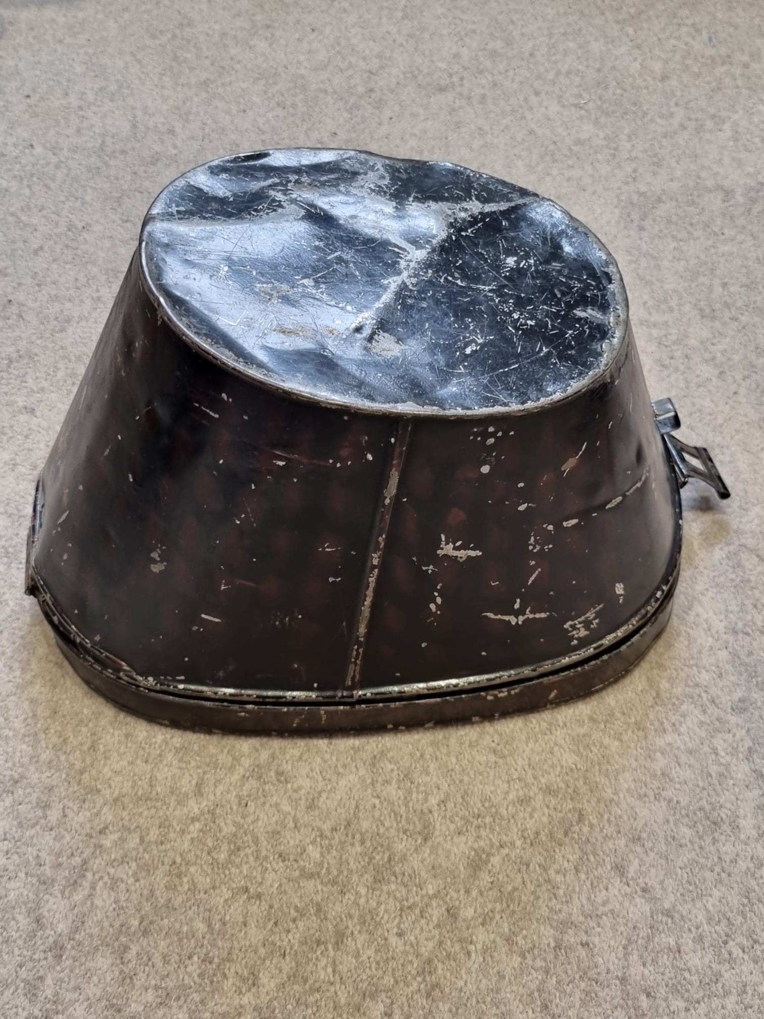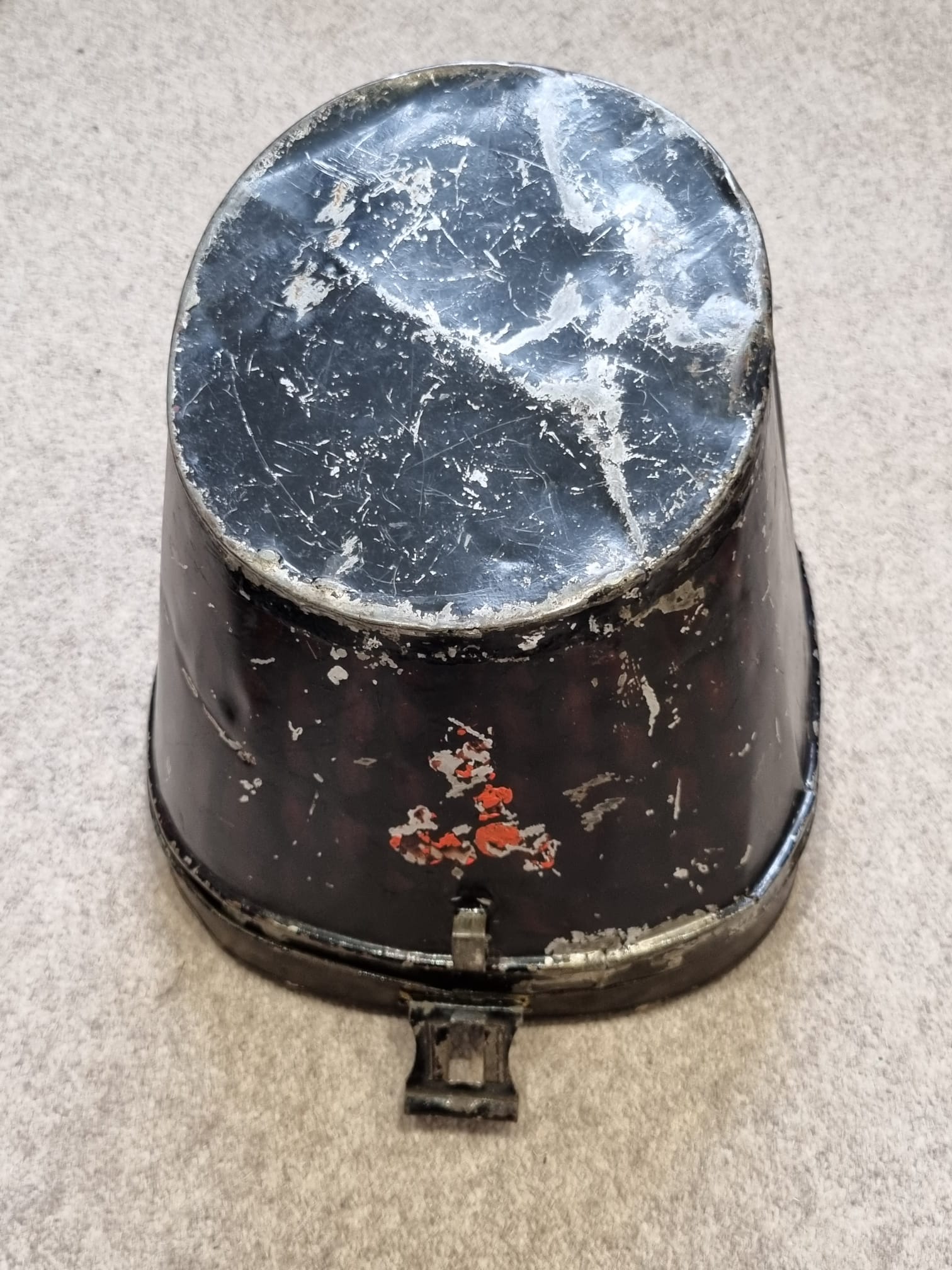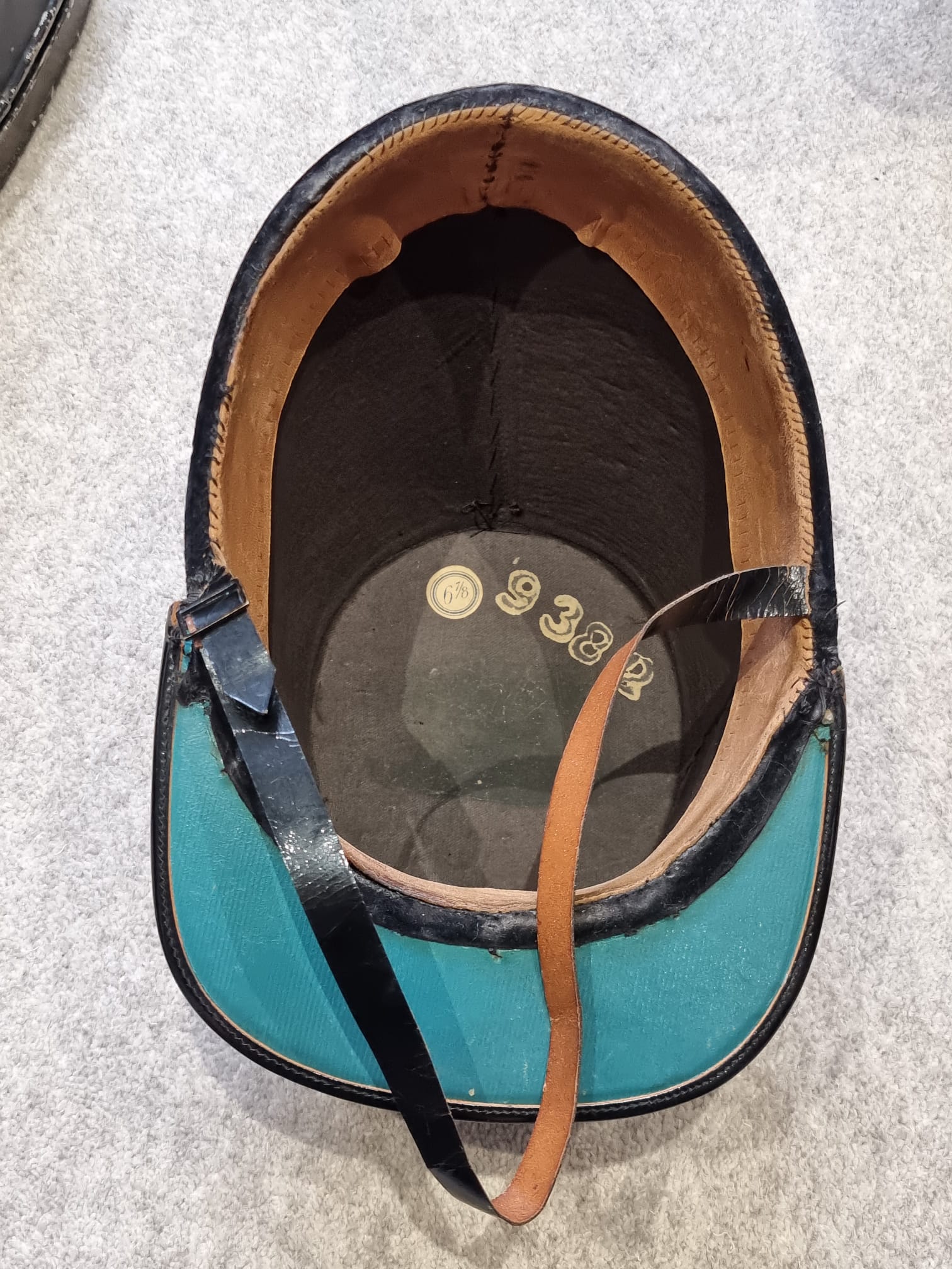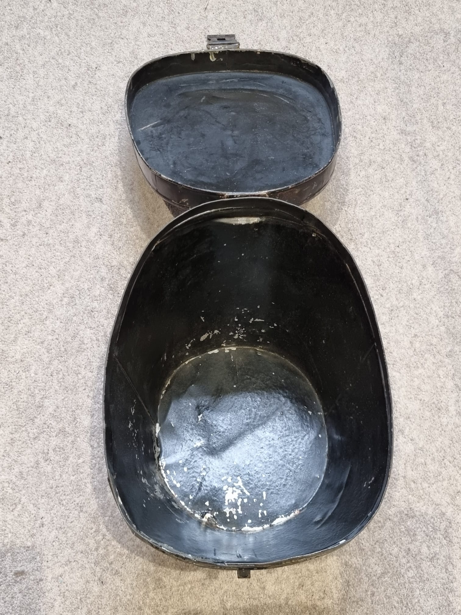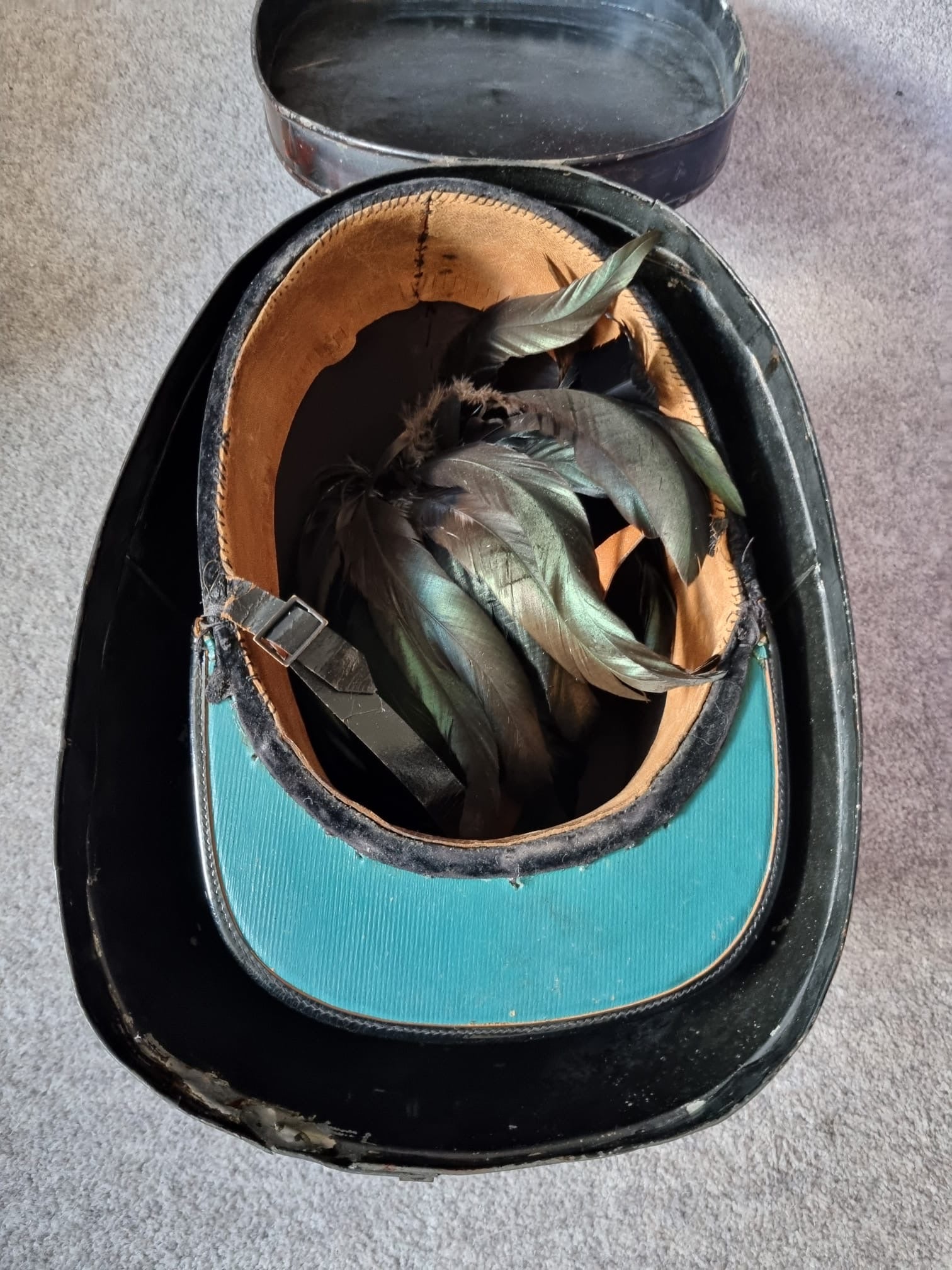 Complete with original feather plume, leather chinstrap, front plate and japanned tin.