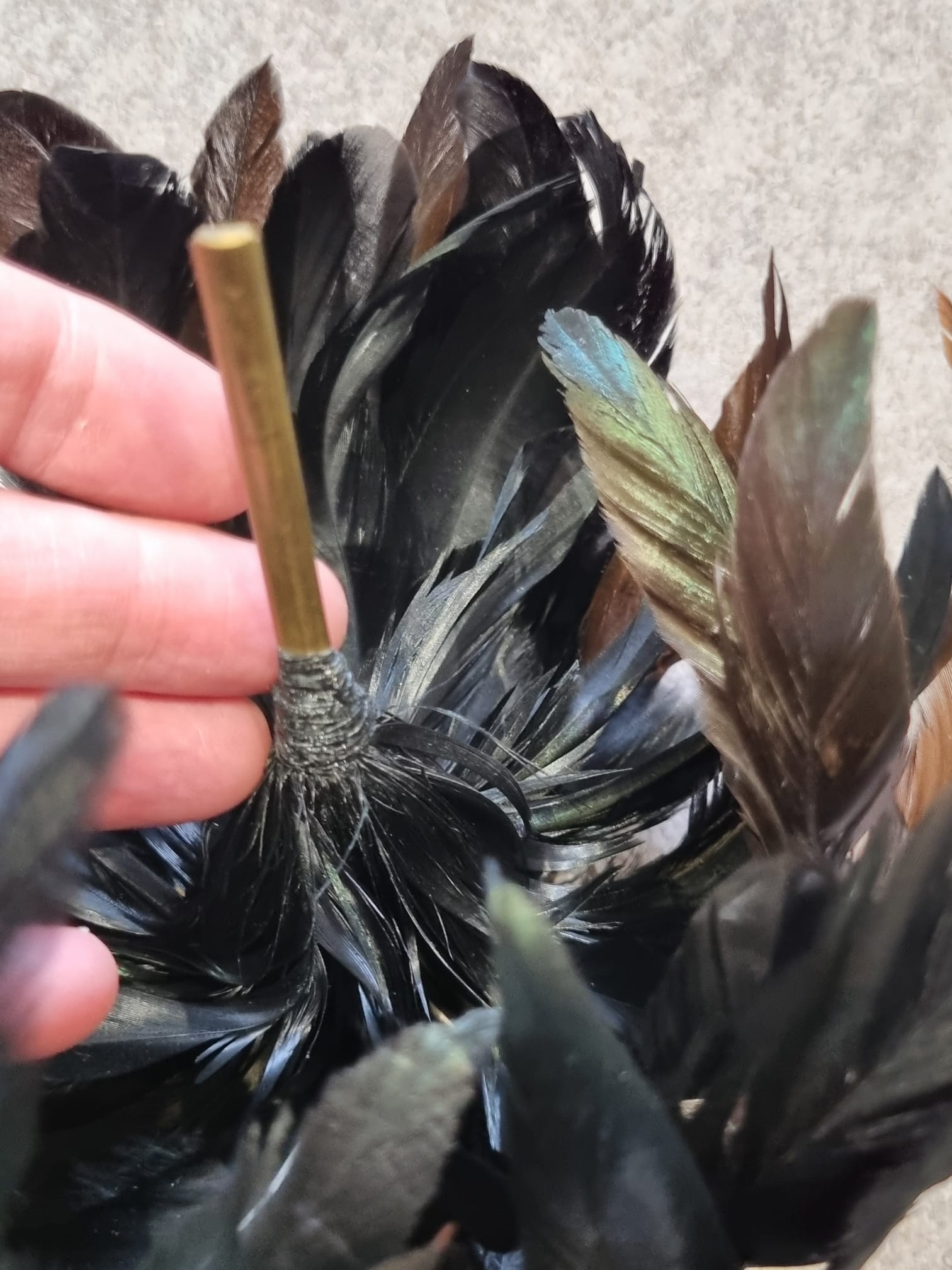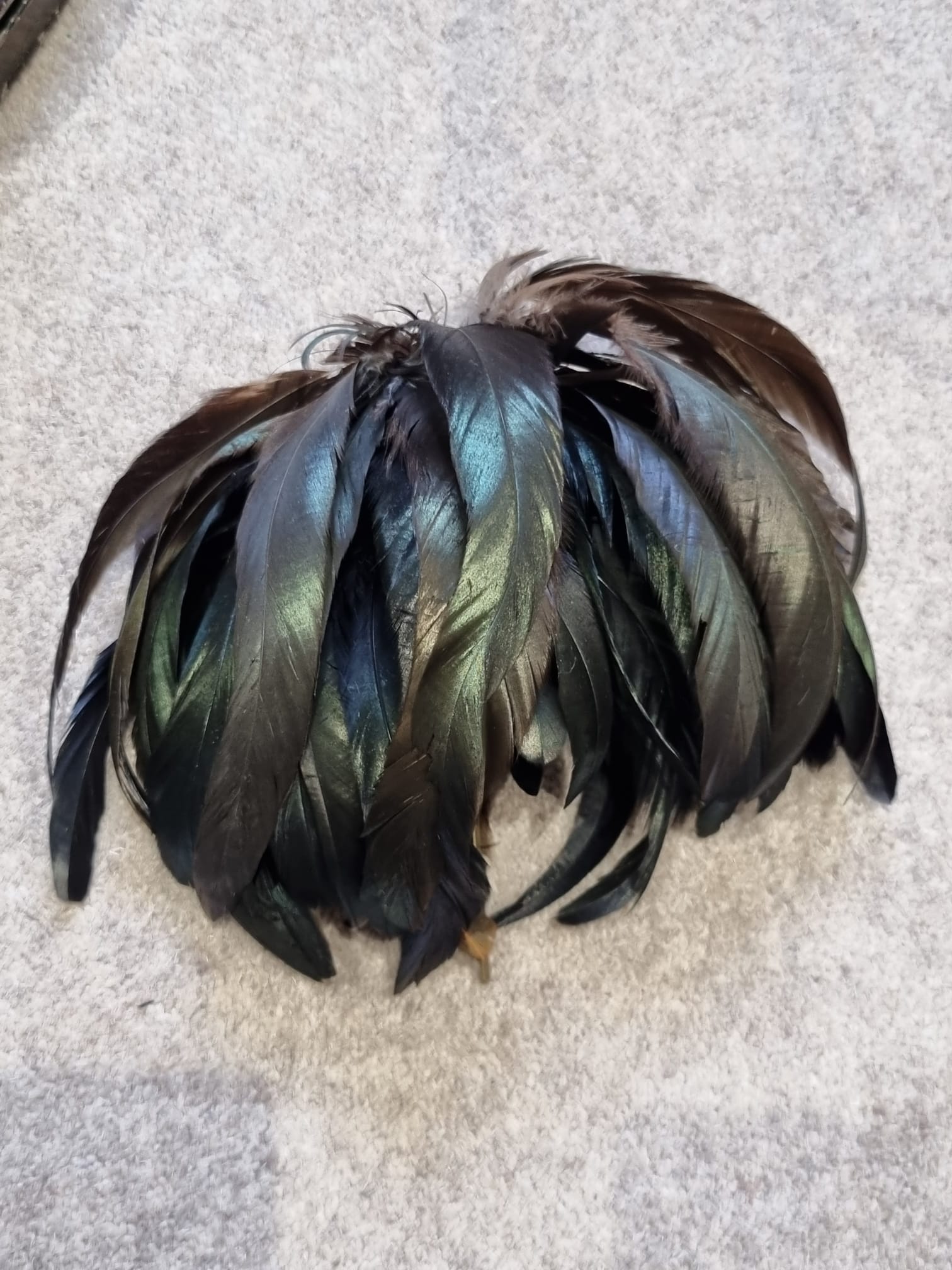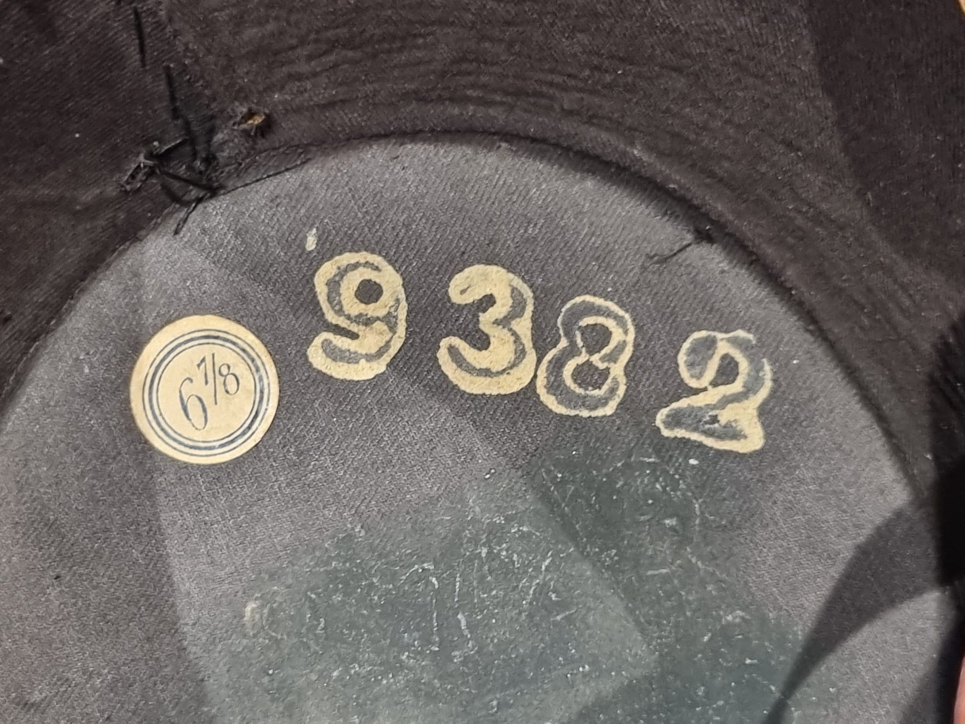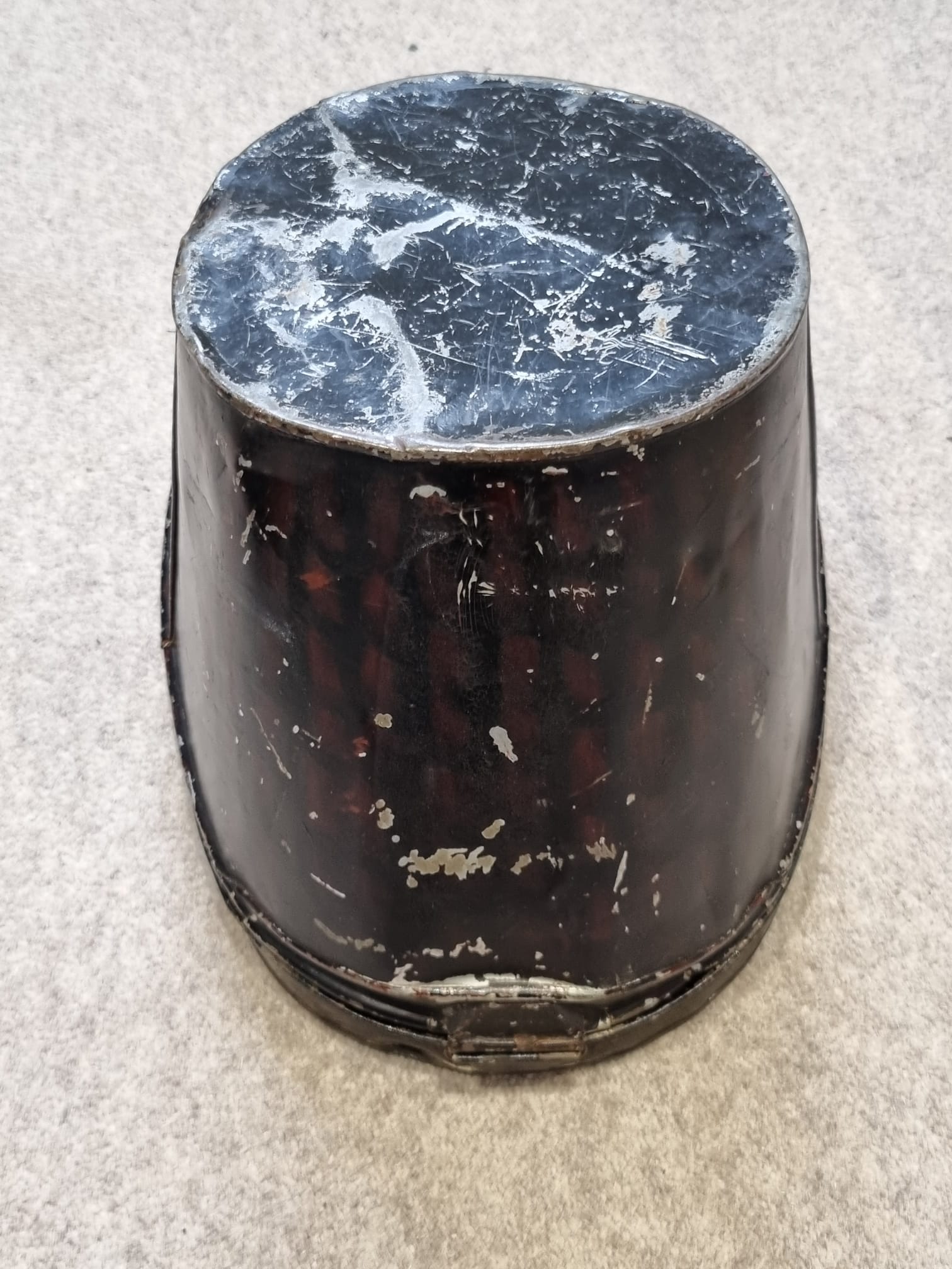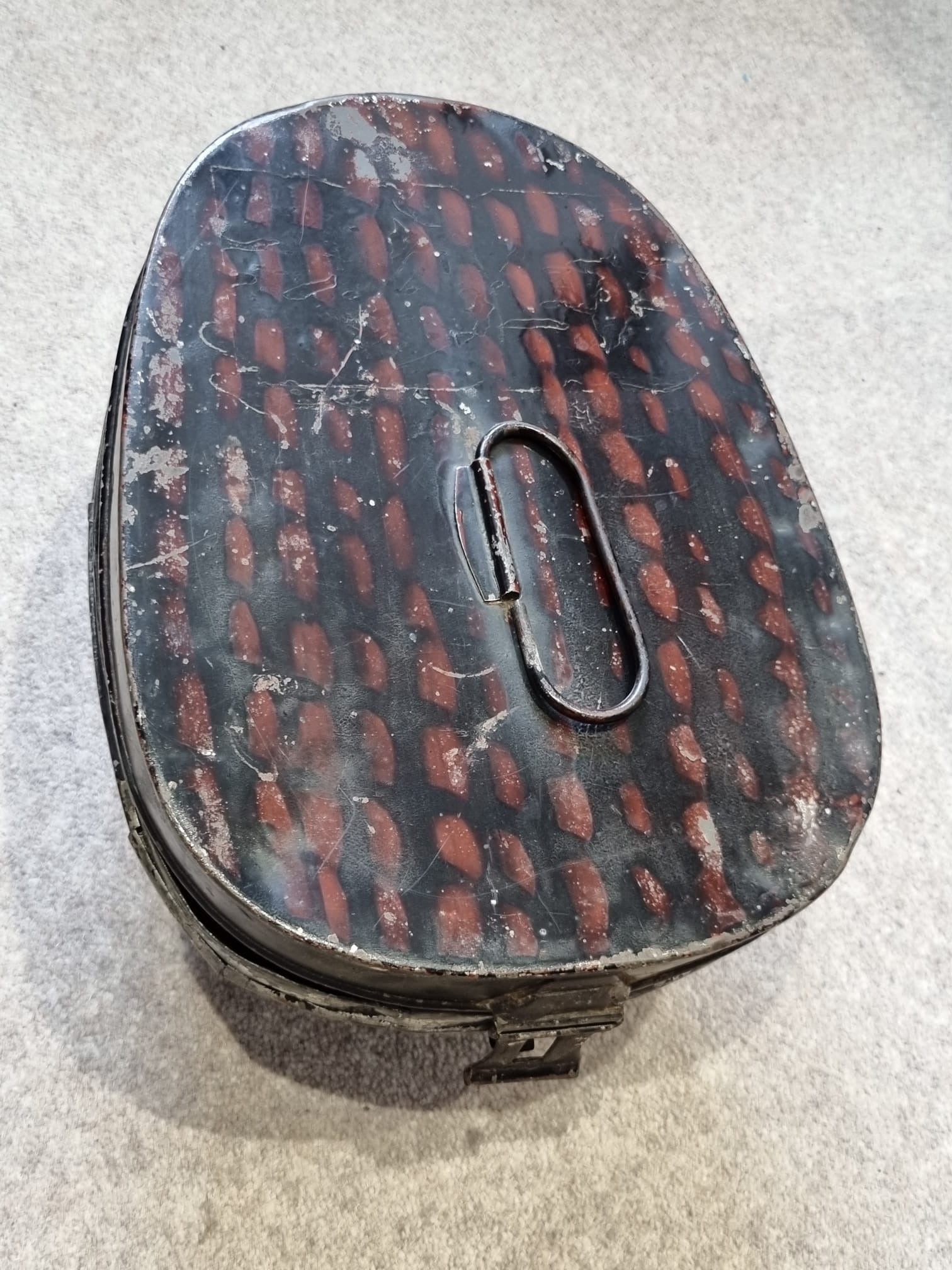 Complete with original feather plume, leather chinstrap, front plate and japanned tin.