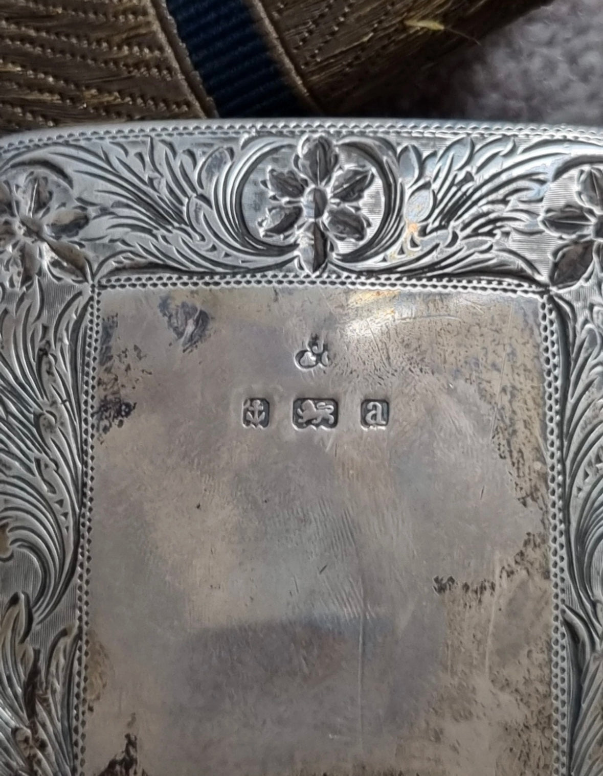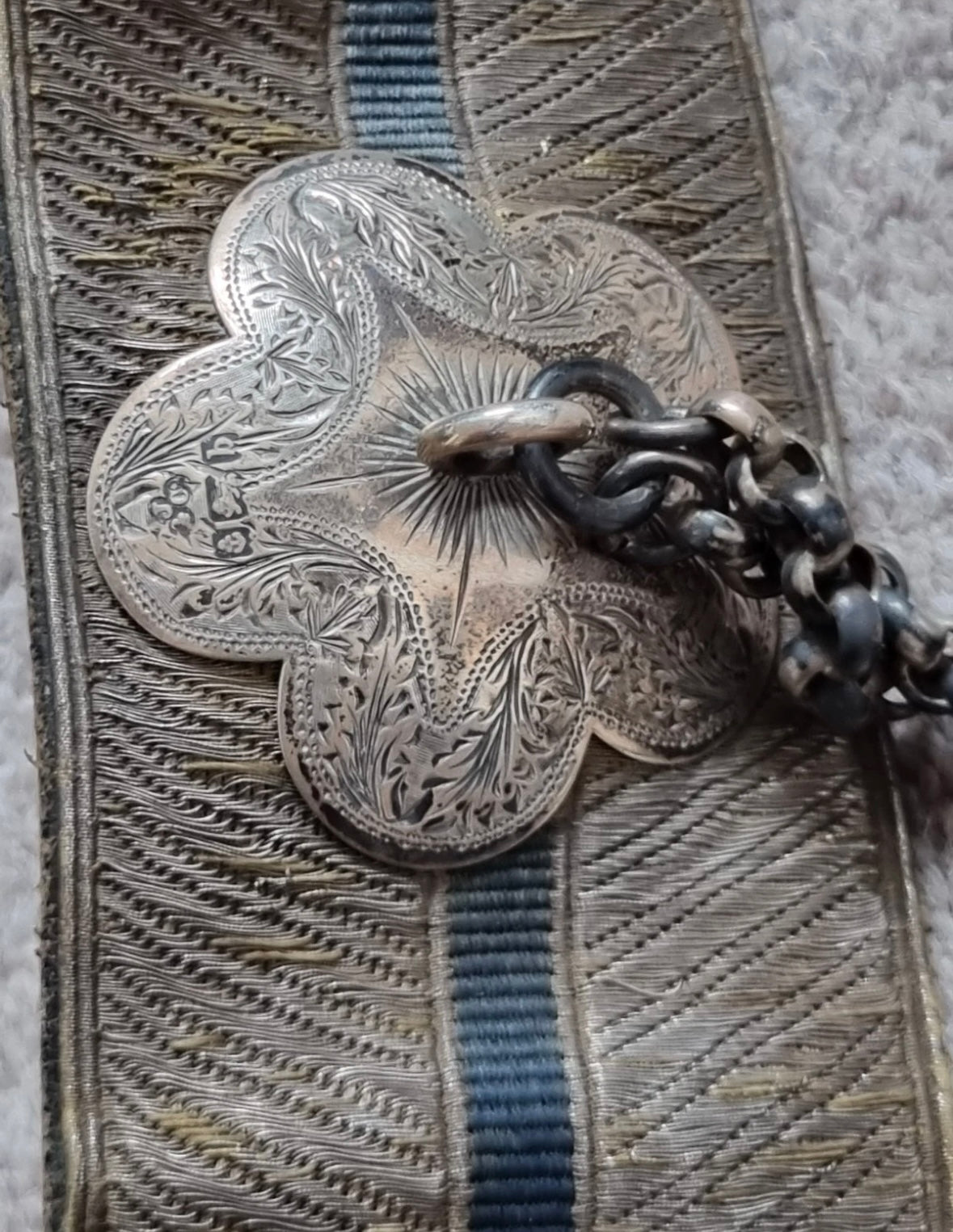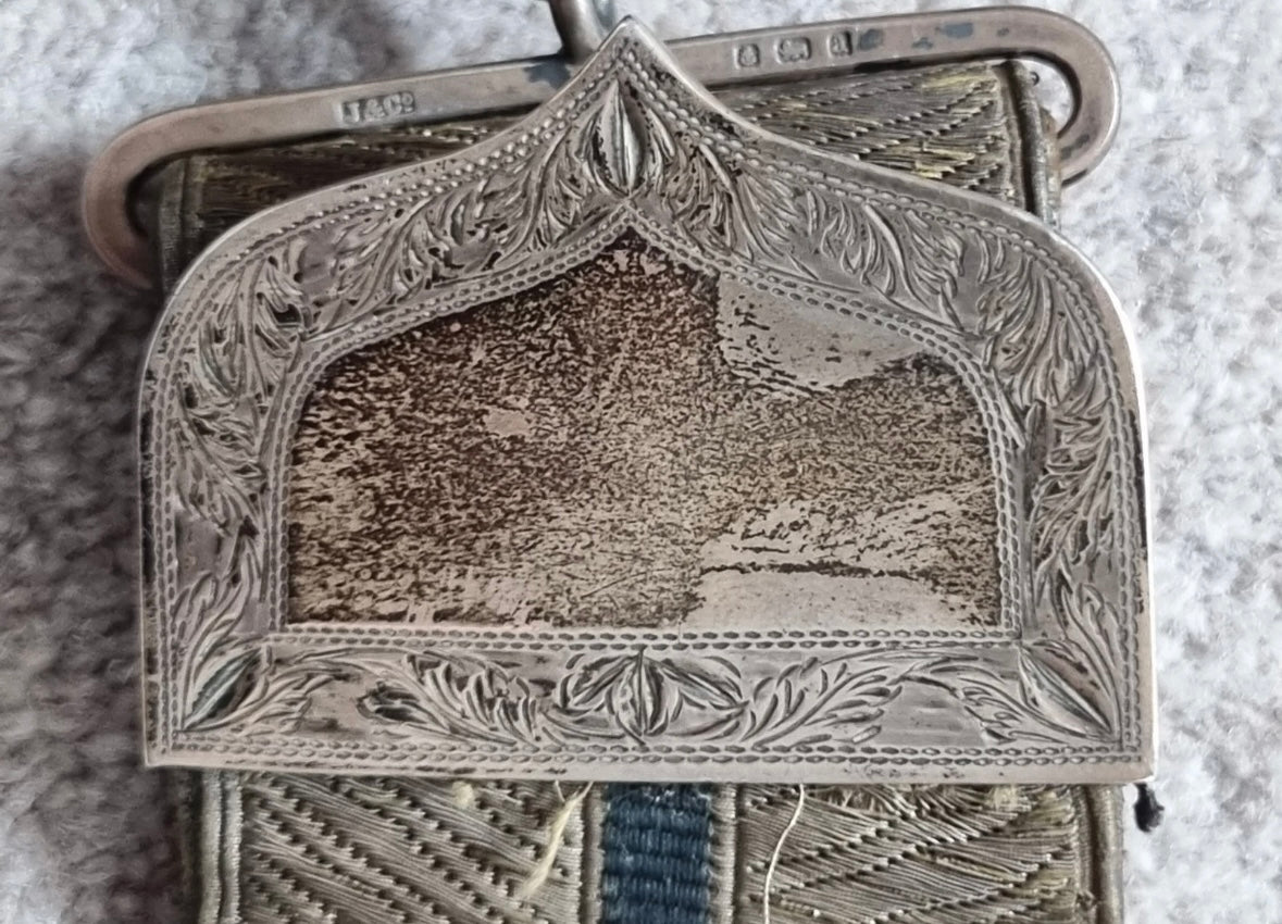 Victorian Silver Shoulder Belt Pouch, applied with brass crowned VR cypher, and with foliate engraved border, hallmarks for Birmingham 1900, with leather backed gold lace crossbelt with silver clasp, slider, prickers and chains.
