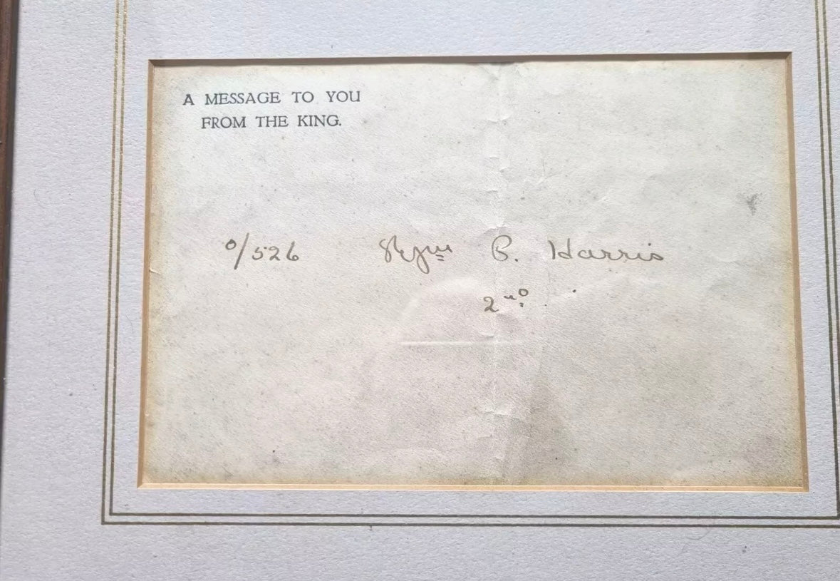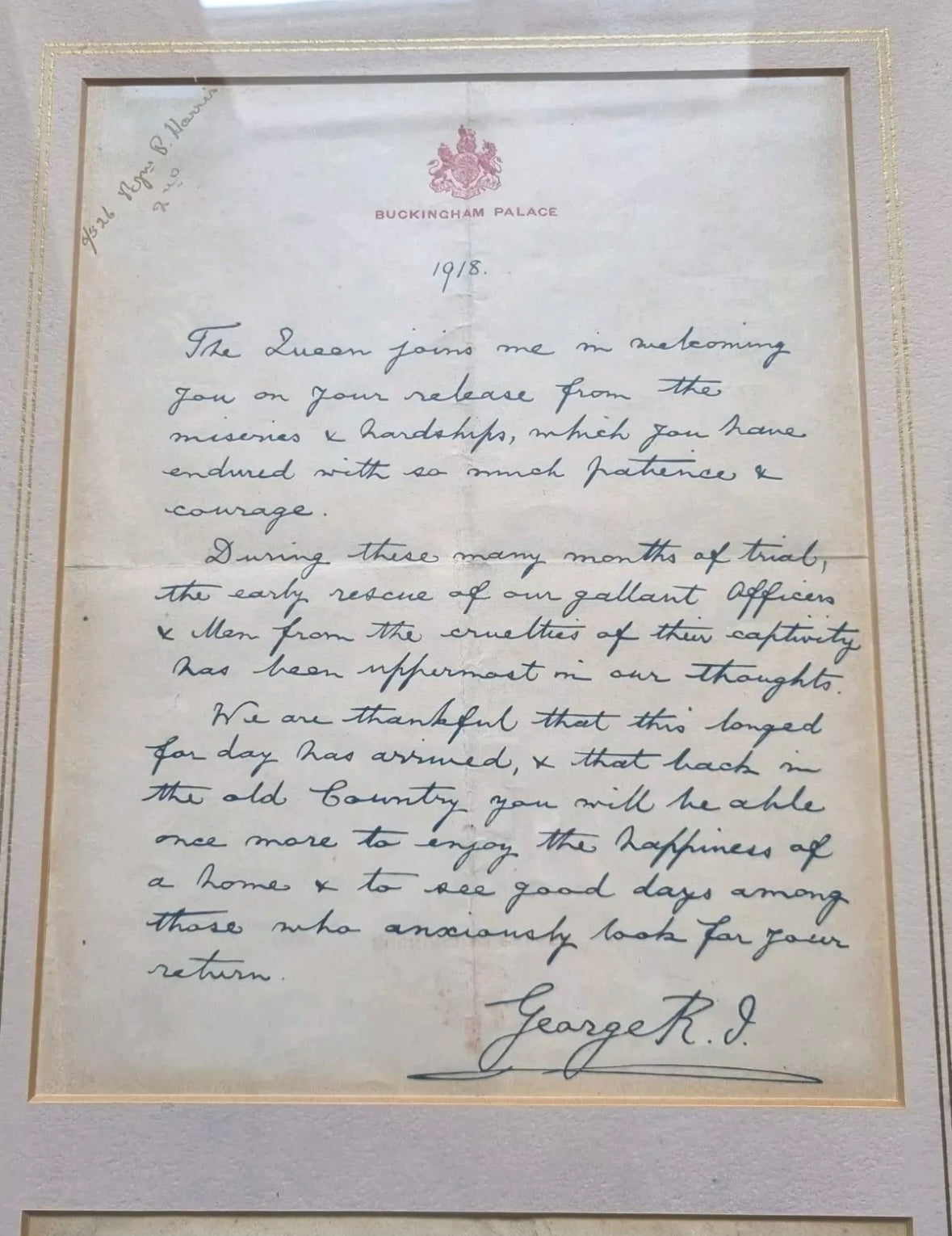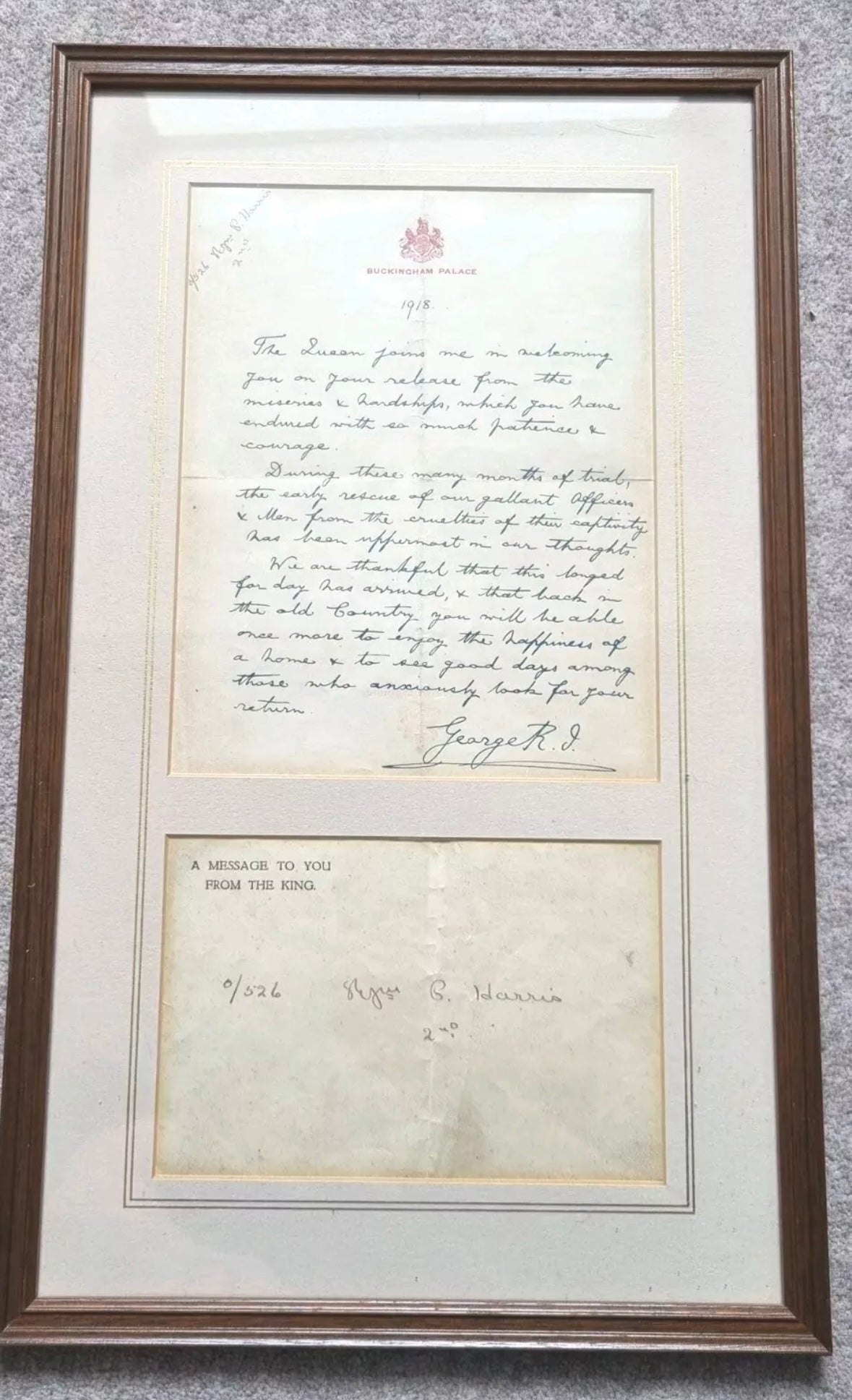 - large wooden framed WW1 Buckingham Palace lithograph letter marking his release from German PoW camp