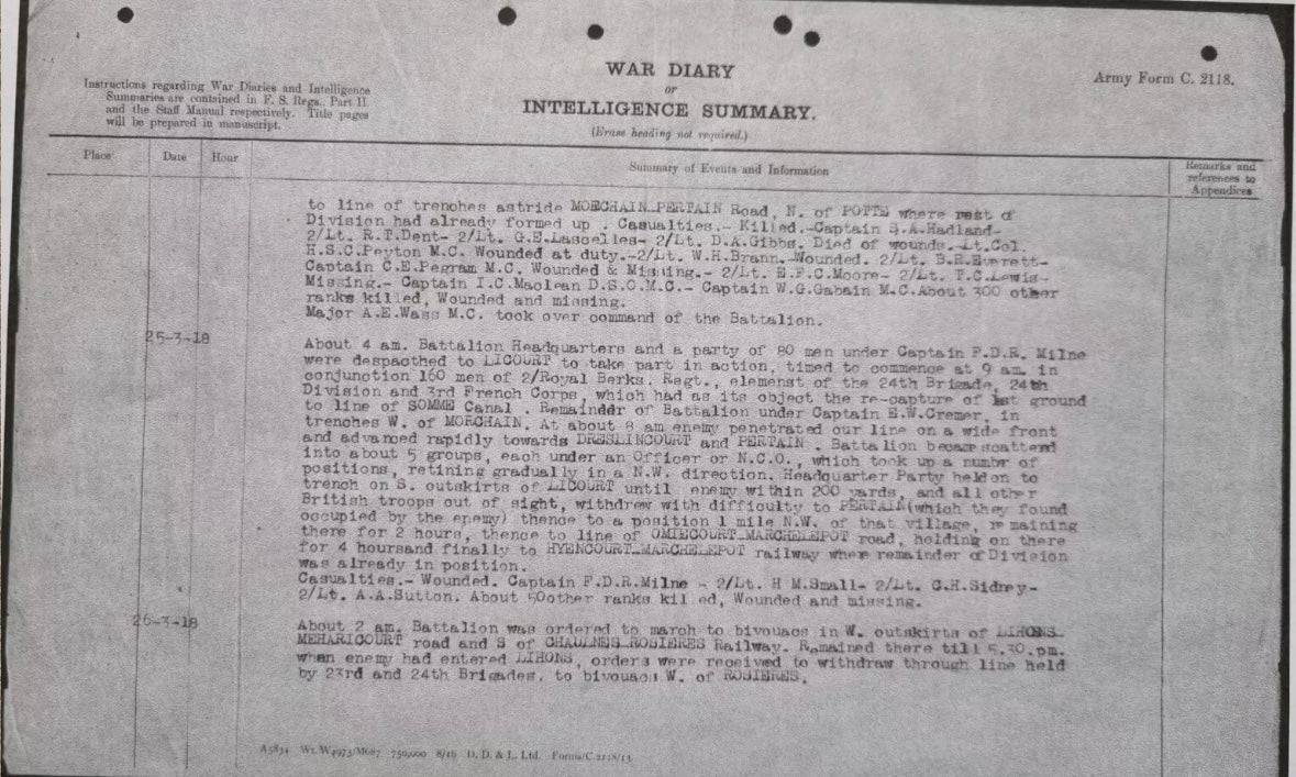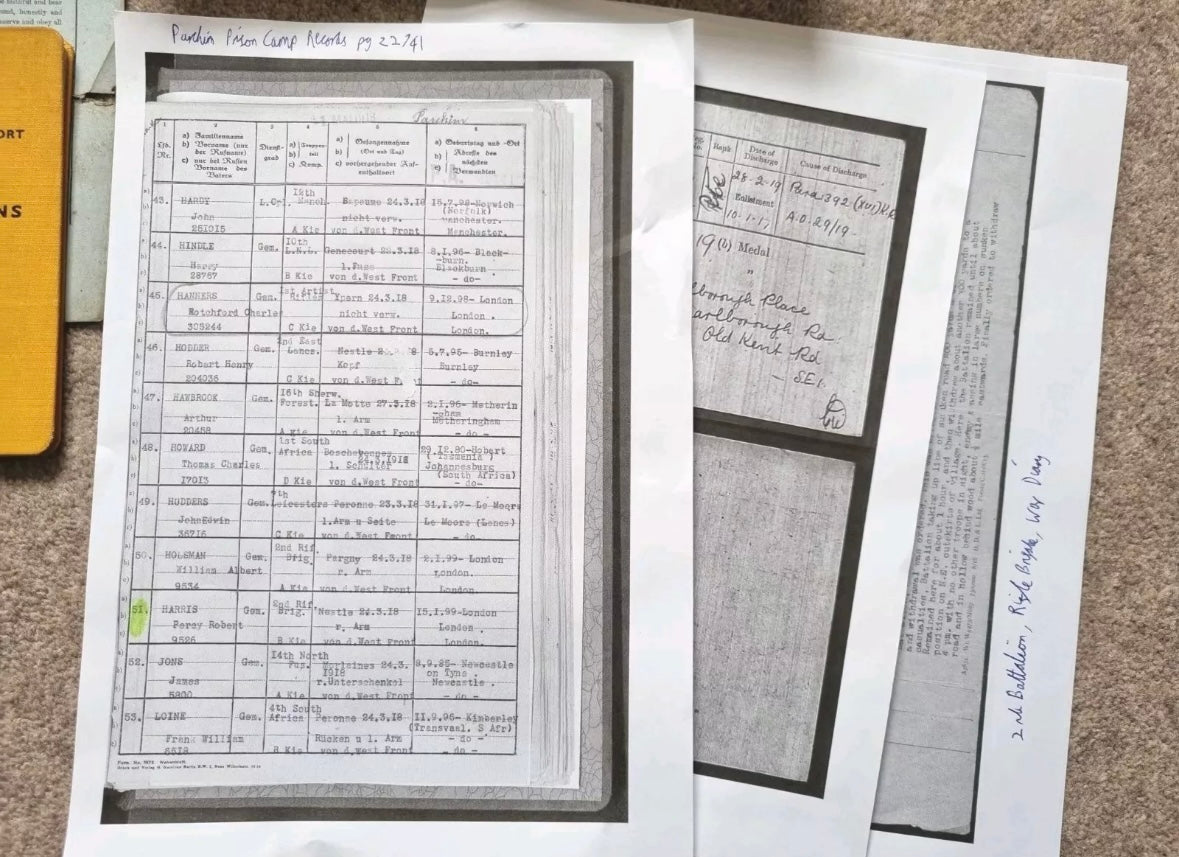 - copies of reseach materials (medal card, register from PoW camp, Btn War Diary which describes in detail the day of his capture when his unit was engaged in a large battle for a bridgehead at Morchain)