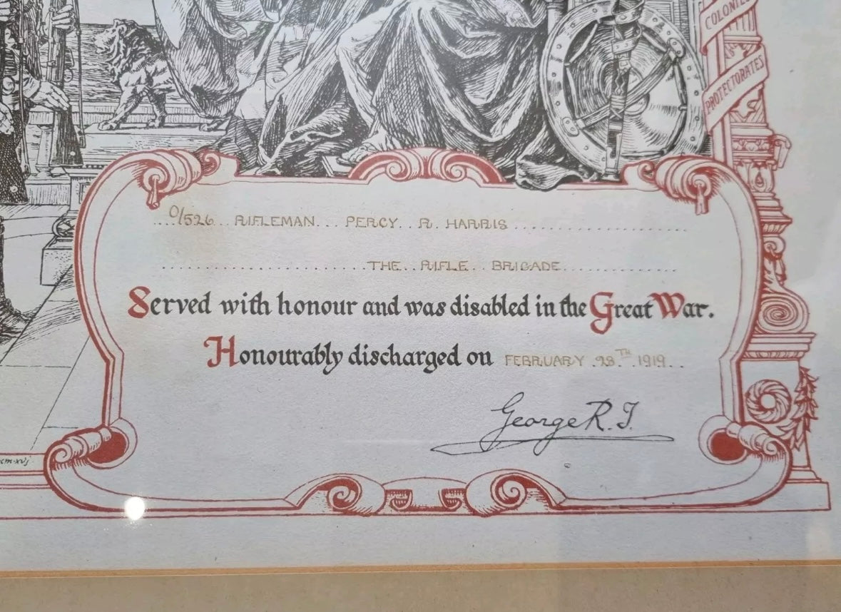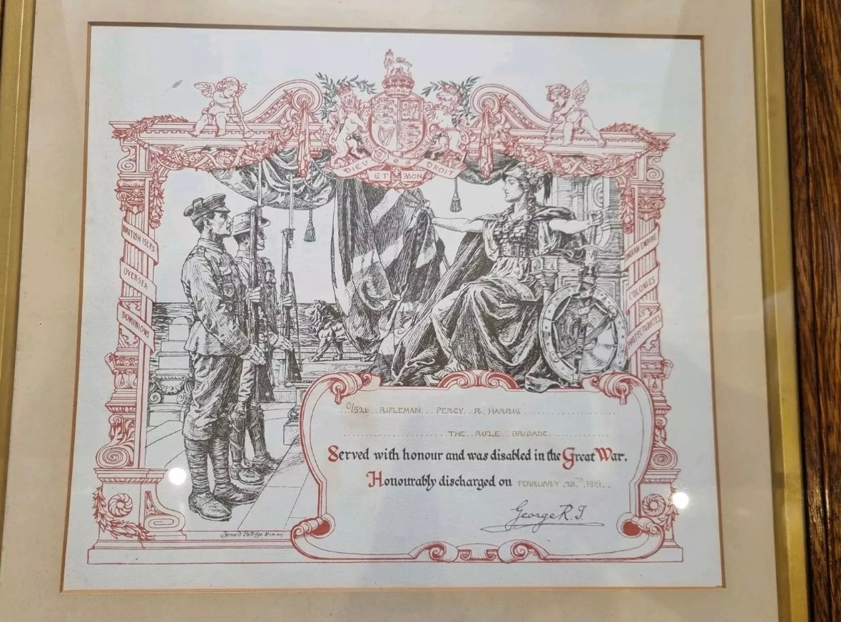 - large wooden framed WW1 honourable discharge and wound certificate