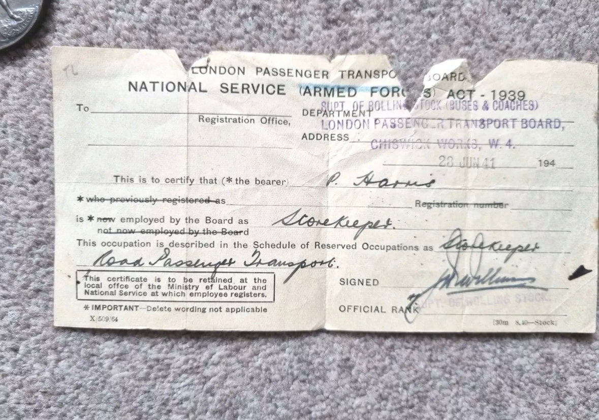 He later served in the Home Guard in WW2 and worked in London Transport as a storekeeper and during which time he also had ARP duties.