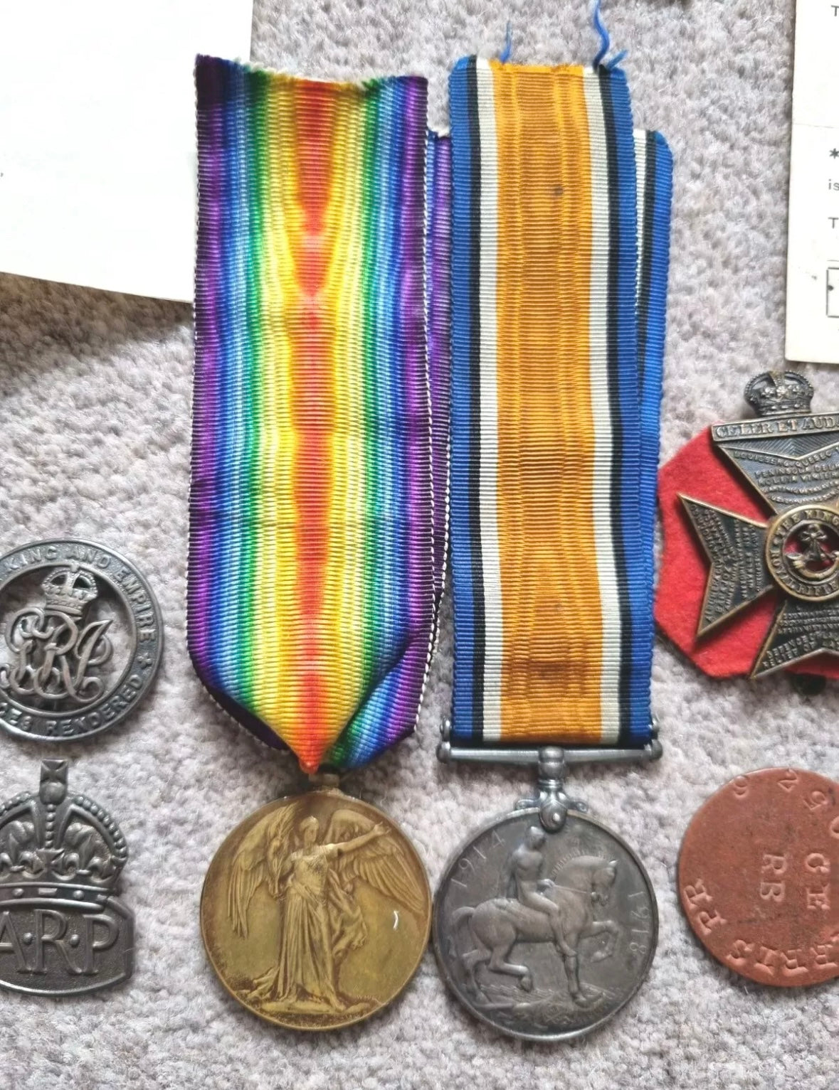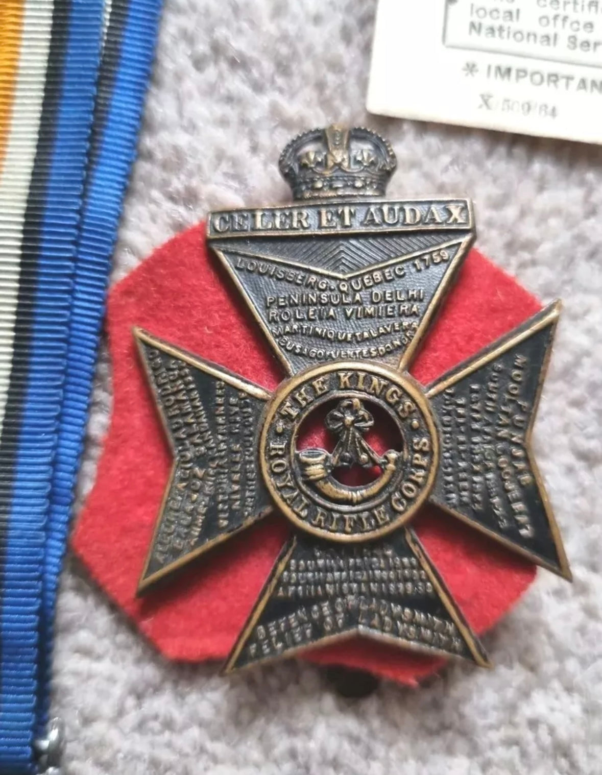 - his WW1 Kings Rifle Brigade cap badge