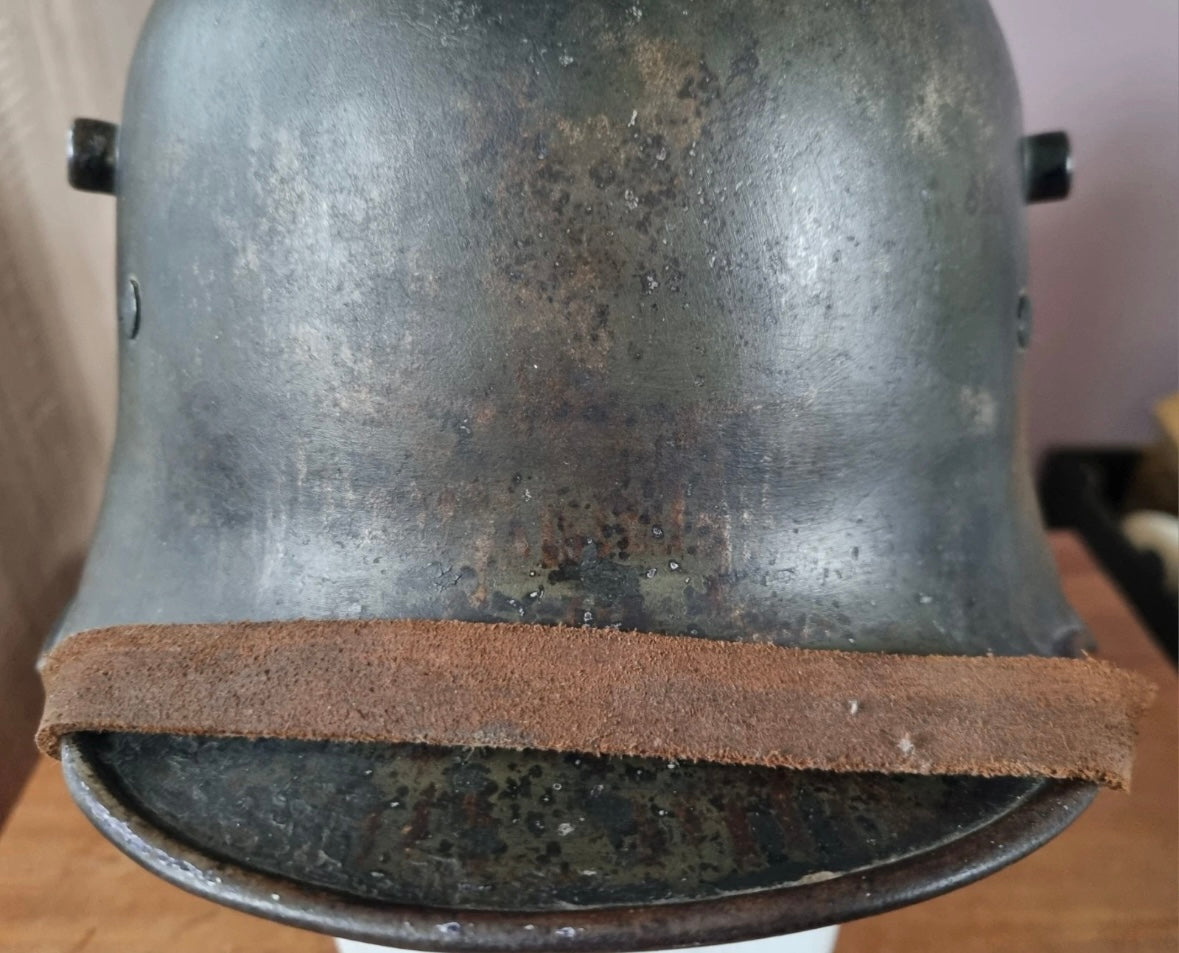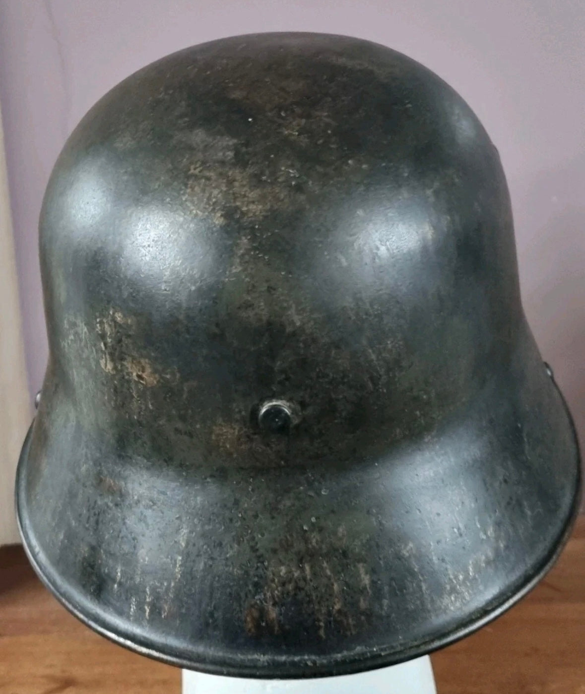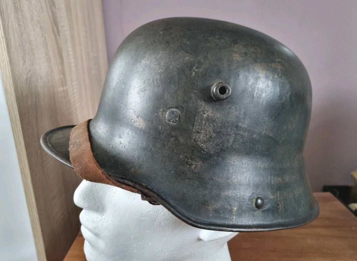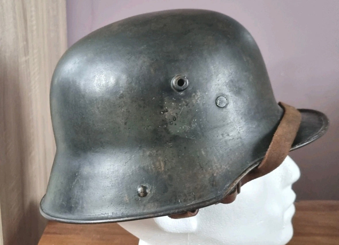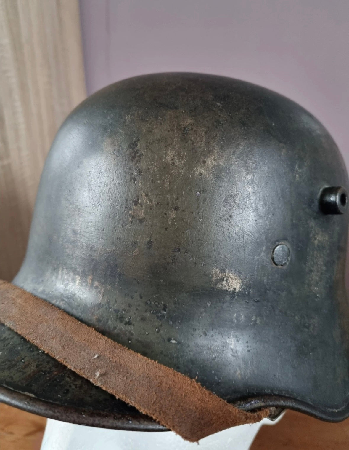 A WW1 German M16 transitional helmet, with 1930s-WW2 period remnant double decals and camo paint residue with a modern Repro Liner chinstrap.