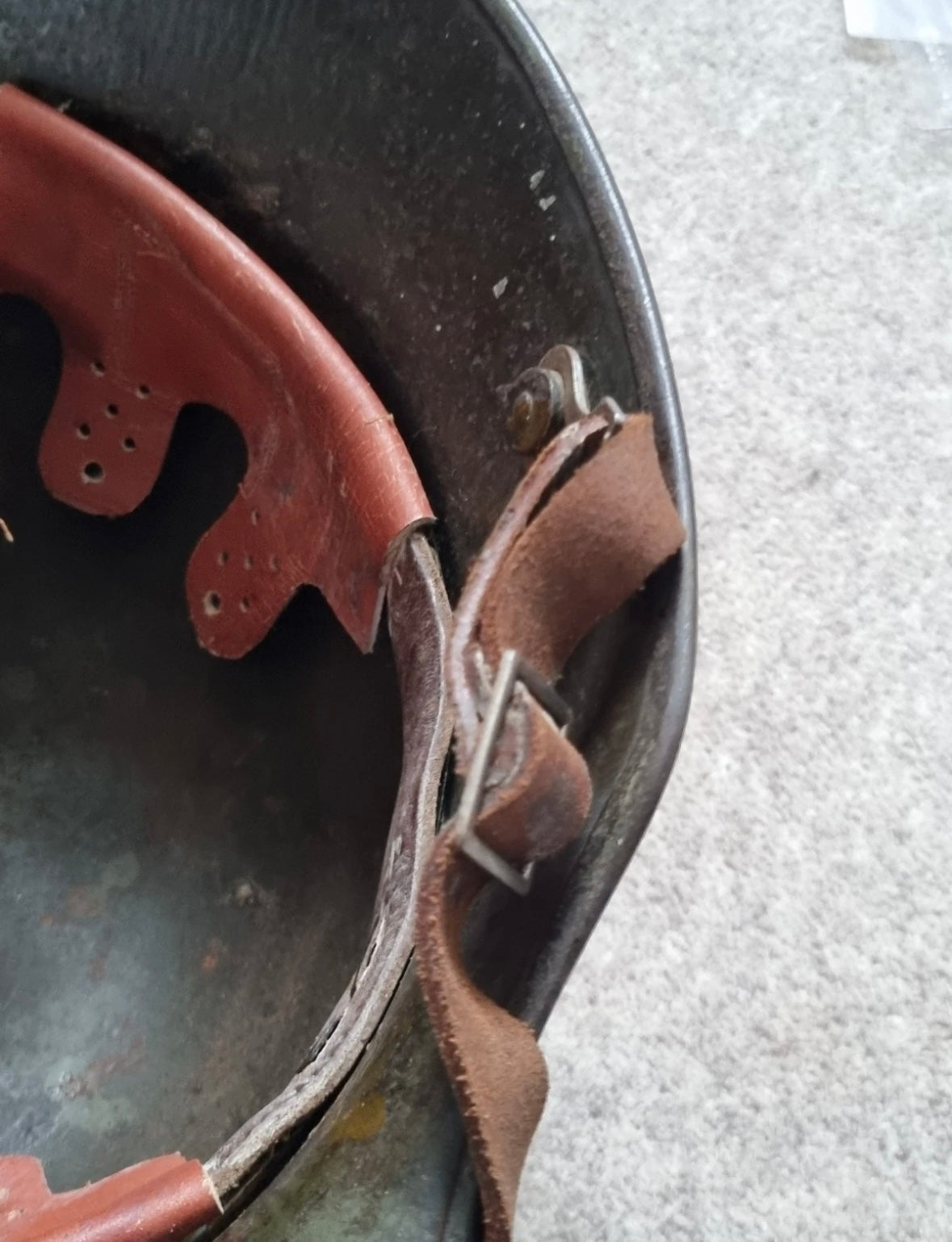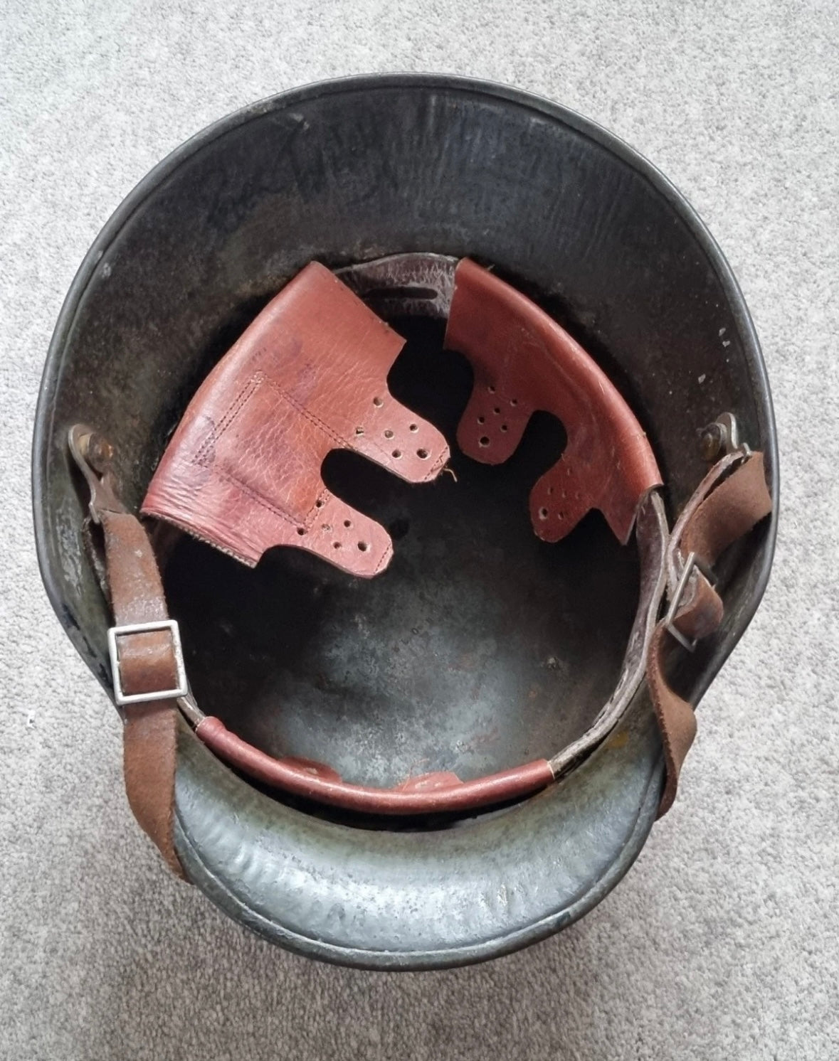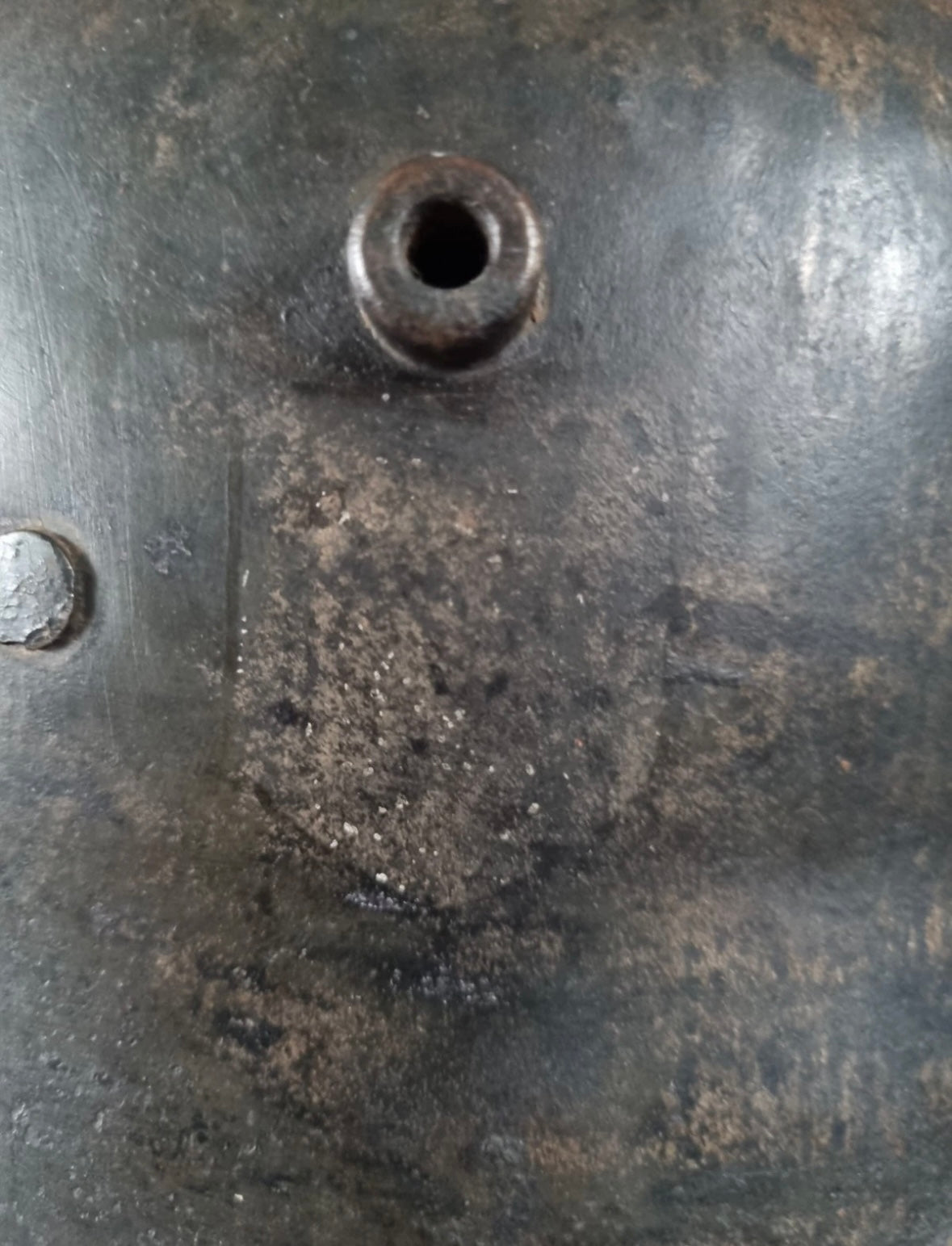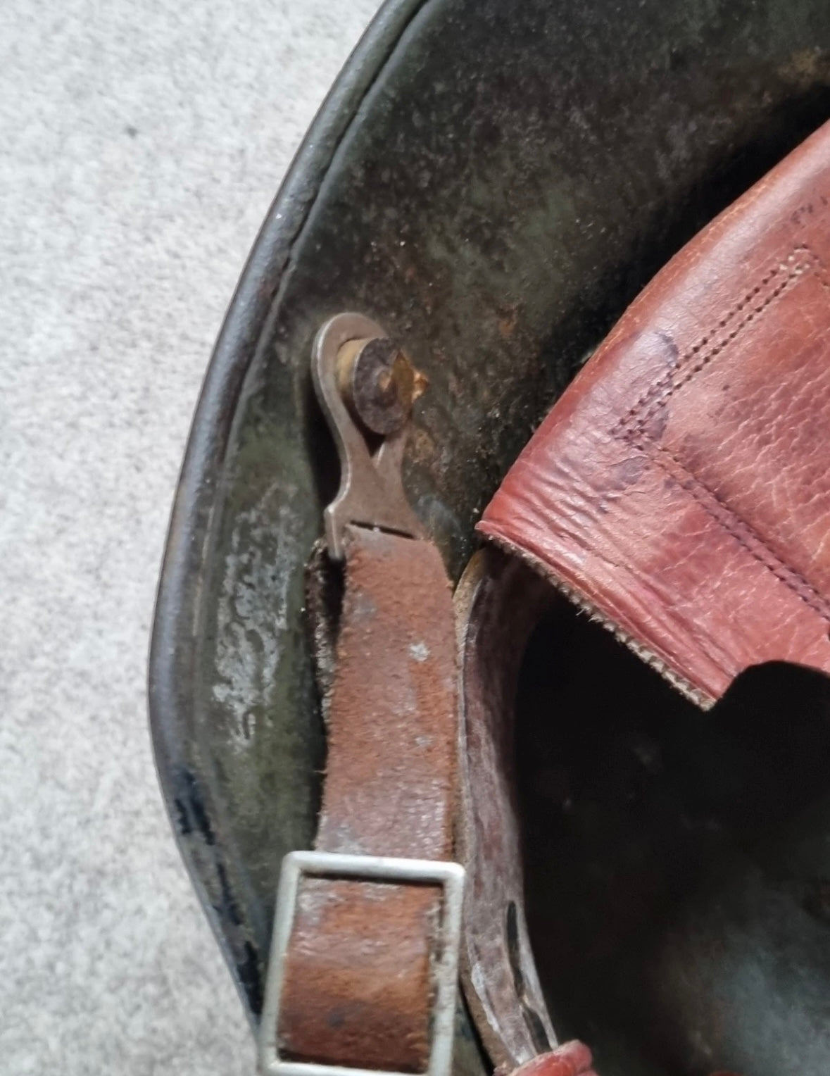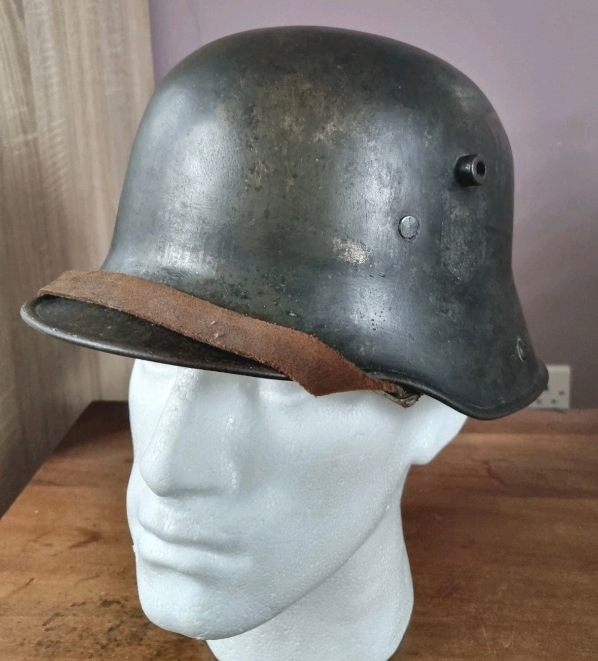 A WW1 German M16 transitional helmet, with 1930s-WW2 period remnant double decals and camo paint residue with a modern Repro Liner chinstrap.