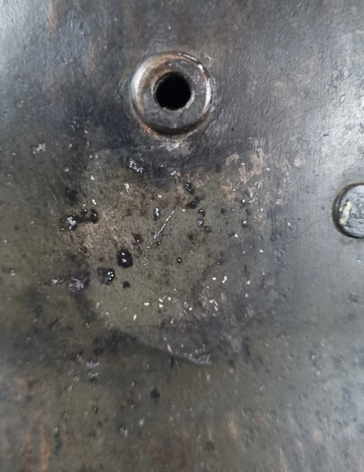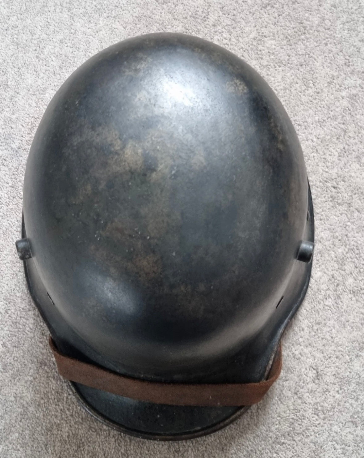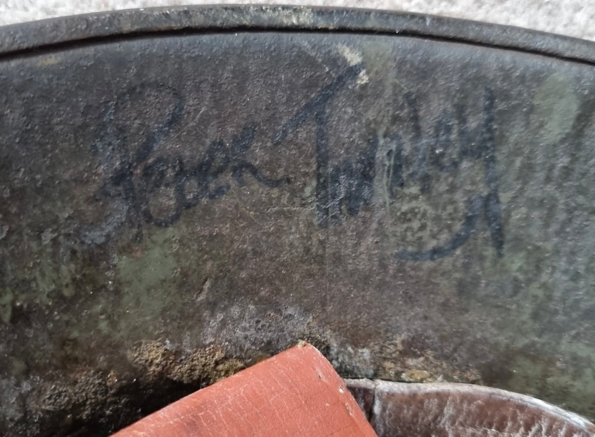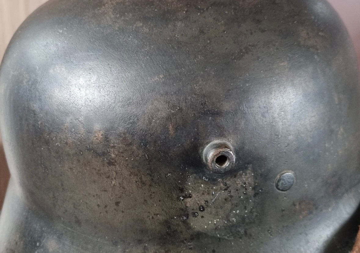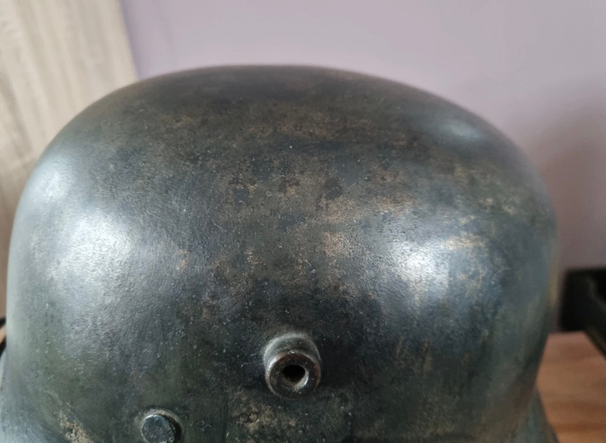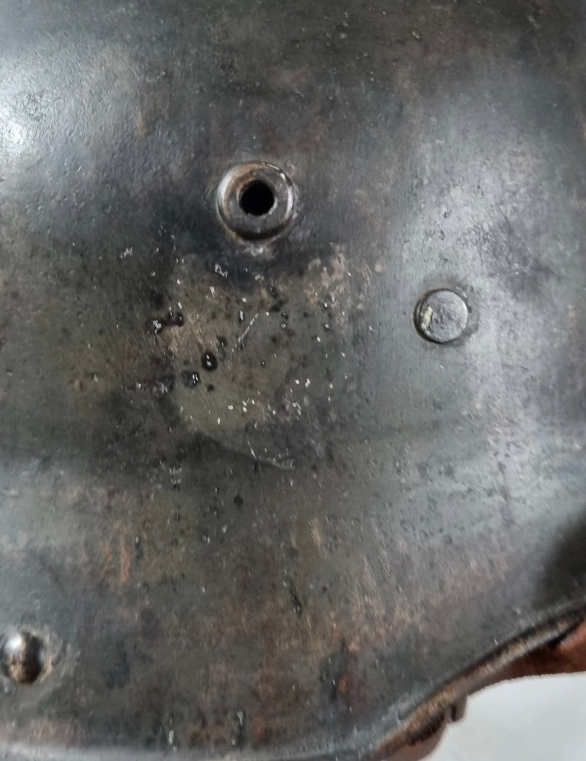 A WW1 German M16 transitional helmet, with 1930s-WW2 period remnant double decals and camo paint residue with a modern Repro Liner chinstrap.