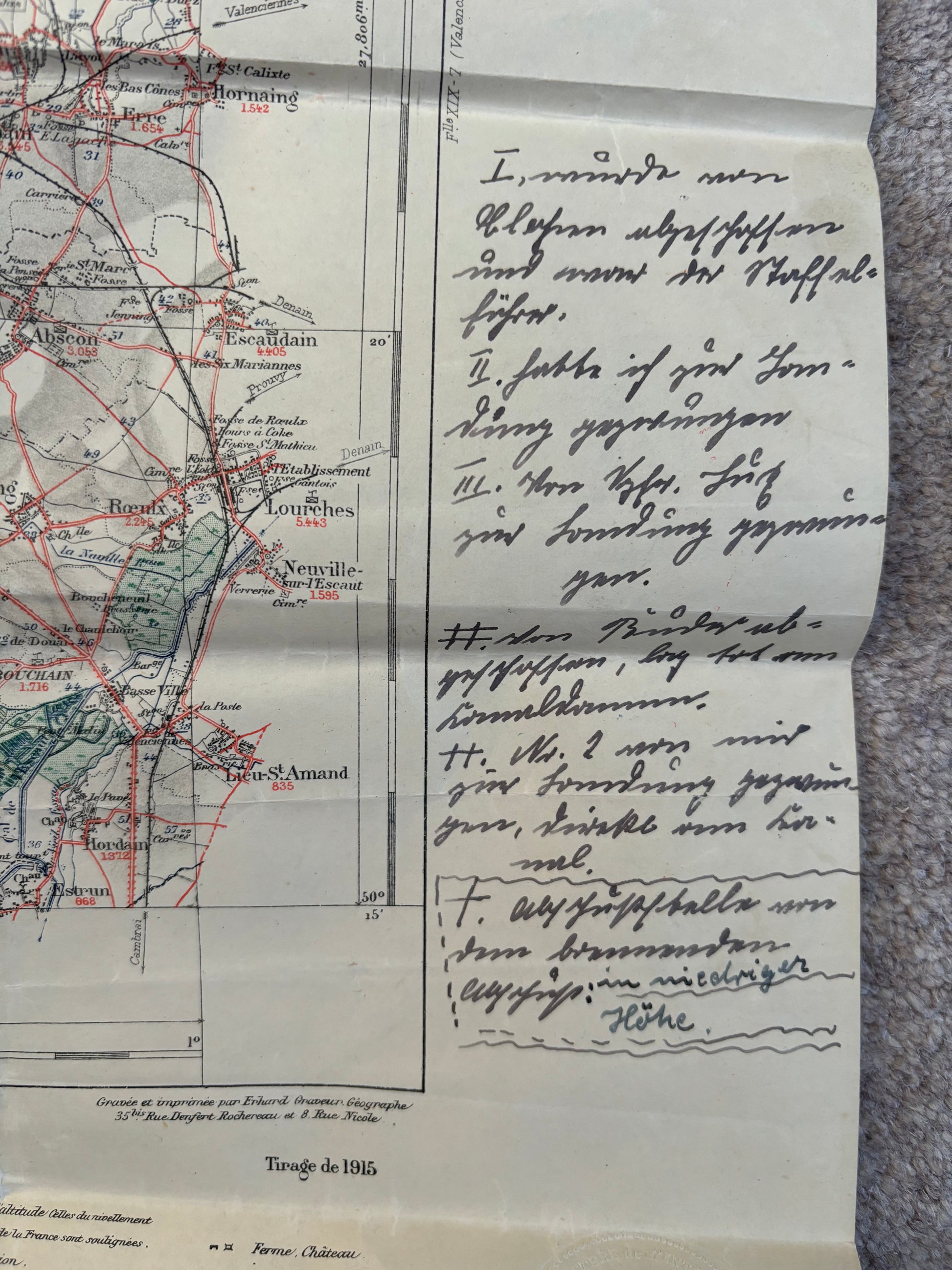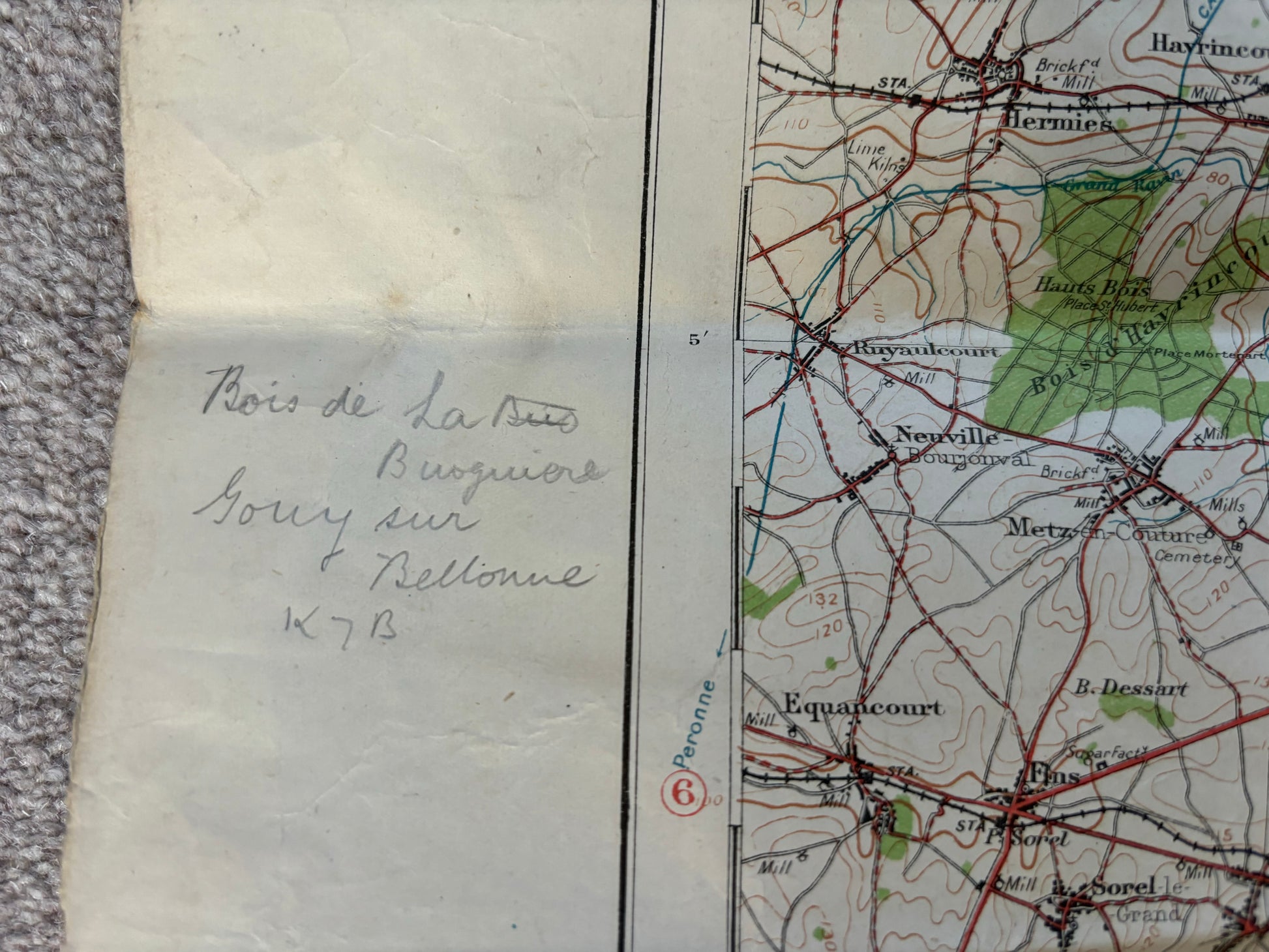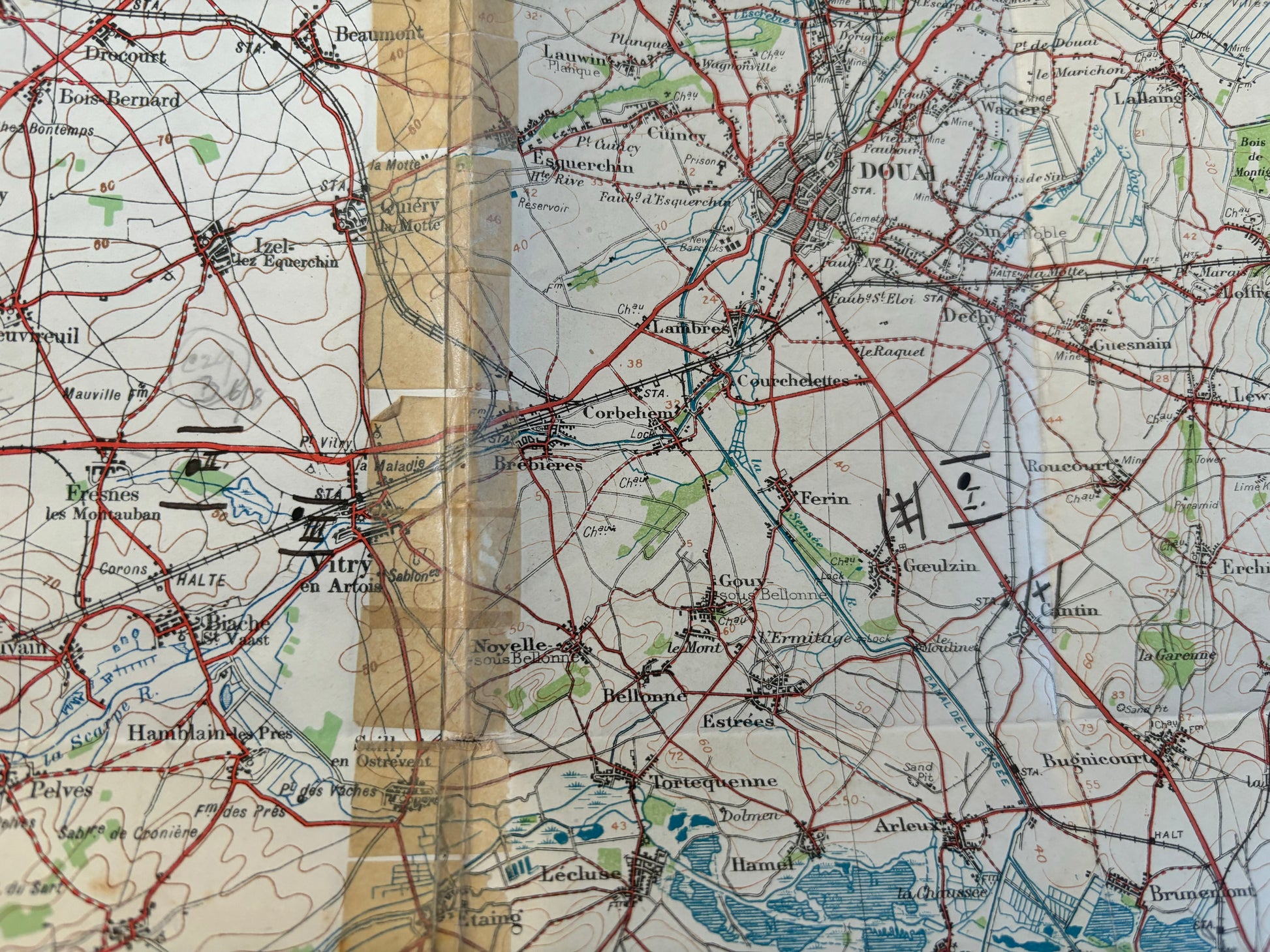 · Three WW1 period maps of the area Jack crashed in including one French map with annotations in German added to it marking the crash locations, supposedly done by a German AA gunner who claimed to have shot Spilhaus down. Spilhaus's parents tracked him down after the war when they were searching for him and made him mark out on the map the various crash positions.
