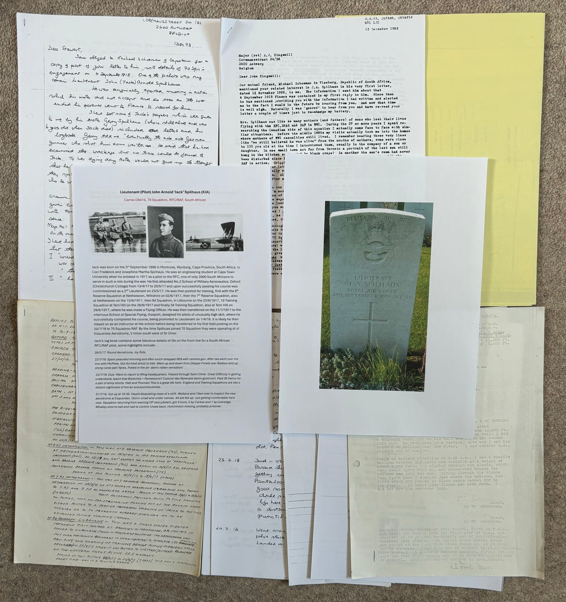Jack was born on the 3rd September 1898 in Montrose, Wynberg, Cape Province, South Africa, to Carl Frederick and Josephine Martha Spilhaus. He was an engineering student at Cape Town University when he enlisted in 1917 as a pilot to the RFC, one of only 2000 South Africans to serve in such a role during the war. He first attended No.2 School of Military Aeronautics, Oxford (Christchurch College) from 13/4/17 to 25/5/17 and upon successfully passing his course was commissioned as a 2nd Lieutenant on 23/5/17. He was then posted for training, first with the 8th Reserve Squadron at Netheravon, Wiltshire on 02/6/1917, then the 7th Reserve Squadron, also at Netheravon on the 15/6/1917, then 84 Squadron, in Lilbourne on the 22/6/1917, 10 Training Squadron at Tern Hill on the 26/6/1917 and finally 34 Training Squadron, also at Tern Hill on 29/6/1917, where he was made a Flying Officer. He was then transferred on the 11/7/1917 to the infamous School of Special Flying, Gosport, designed for pilots of unusually high skill, where he successfully completed his course, being promoted to Lieutenant on 1/4/18. It is likely he then stayed on as an instructor at the school before being transferred to his first field posting on the 20/7/18 to 70 Squadron RAF. By the time Spilhuas joined 70 Squadron they were operating at of Esquerdes Aerodrome, 5 miles south west of St Omer.