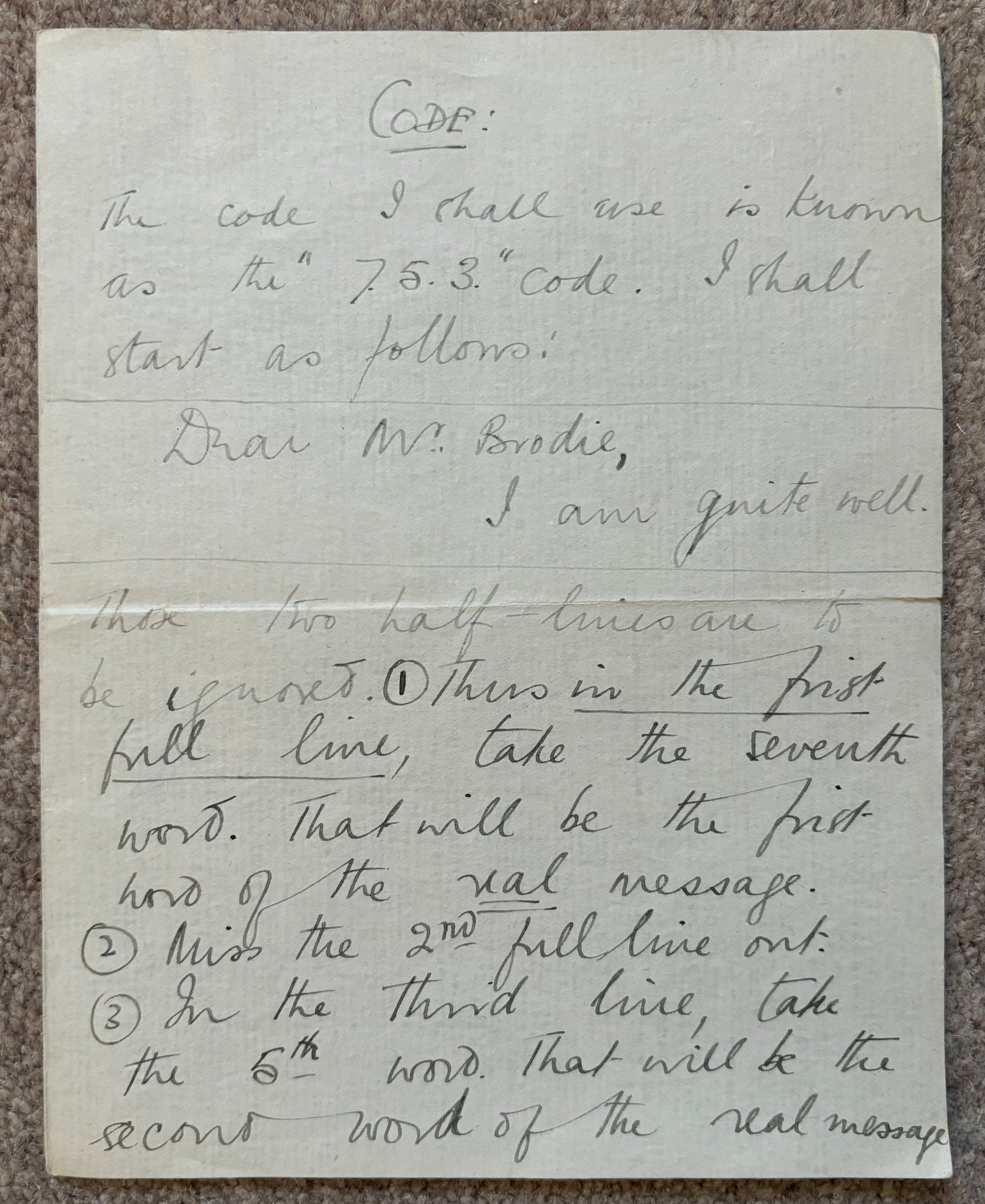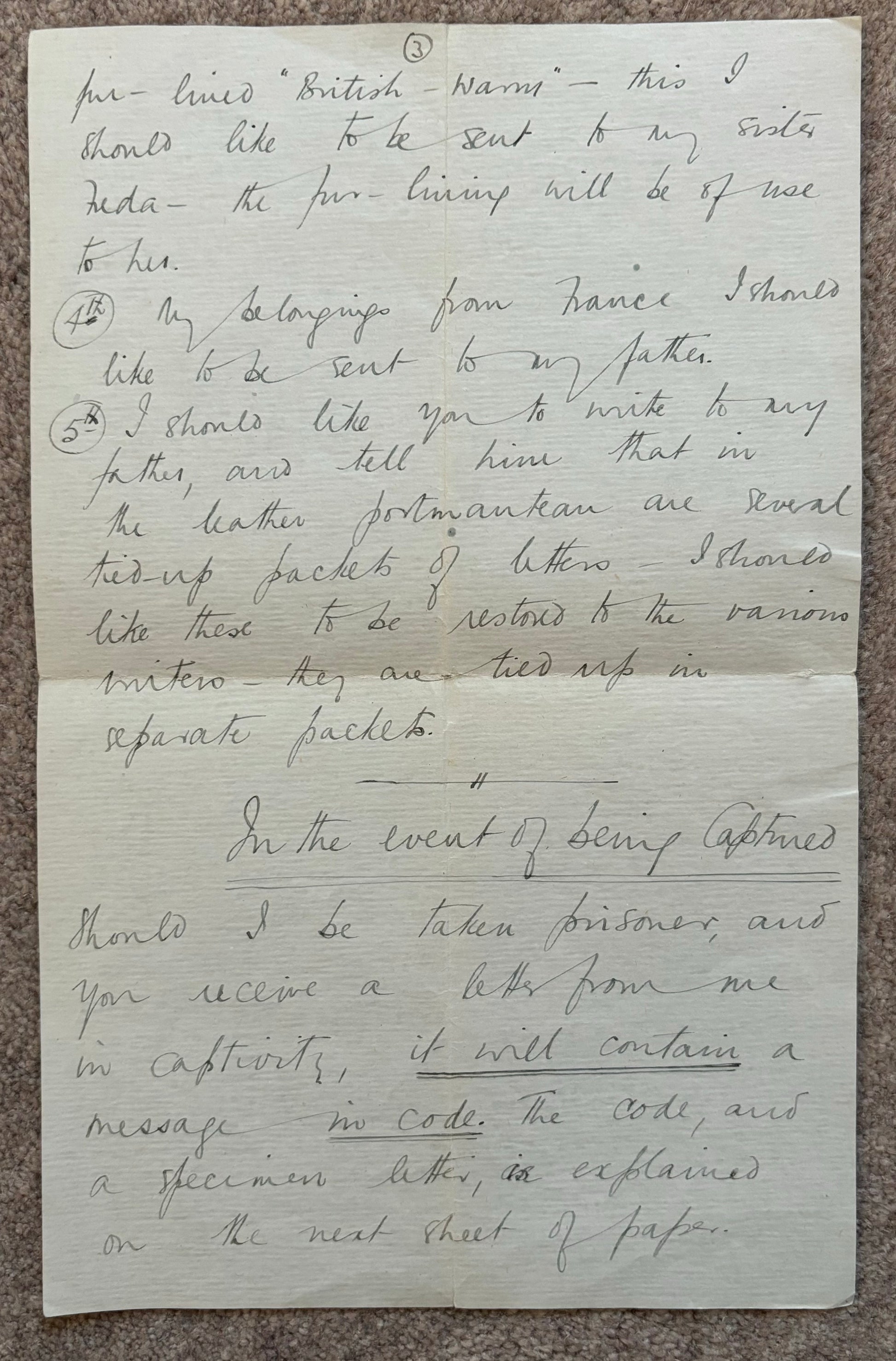 · 12 lengthy letters back home, dating mostly from the last two months of his life, including a particularly moving one in which he details what to do in the event of his capture or death, for which he appears to have but together a meticulous plan, including sending POW packages, escape equipment, and details of his code: “Dear Mr Brodie. You will receive this letter should anything happen to me. It is just to tell you where my various belongings are and what to do with them. 1st you have a packet of papers in your safe. They are my various examination certificates etc and should be sent to my father. 2nd at the Langham Hotel are two portmanteaus, stored in my name. The one marked J SPILHAUS contains some military clothing and my most treasured trifles. The key of that trunk is attached to this letter…I would like all these articles to be sent untouched to my father. In the event of being captured: Should I be taken prisoner and you receive a letter from me in captivity, it will contain a message in code. The code and specimen letter is explained on the next sheet of paper. The code I shall use is known as the ‘753’ code. I shall start as follows: (HERE FOLLOWS A VERY DETAILED EXPLANATION OF HIS PERSONAL CODE).