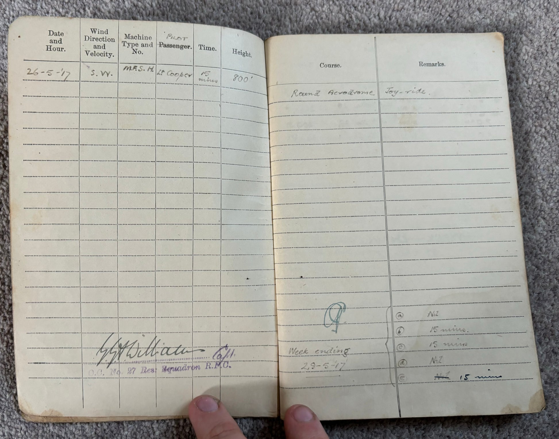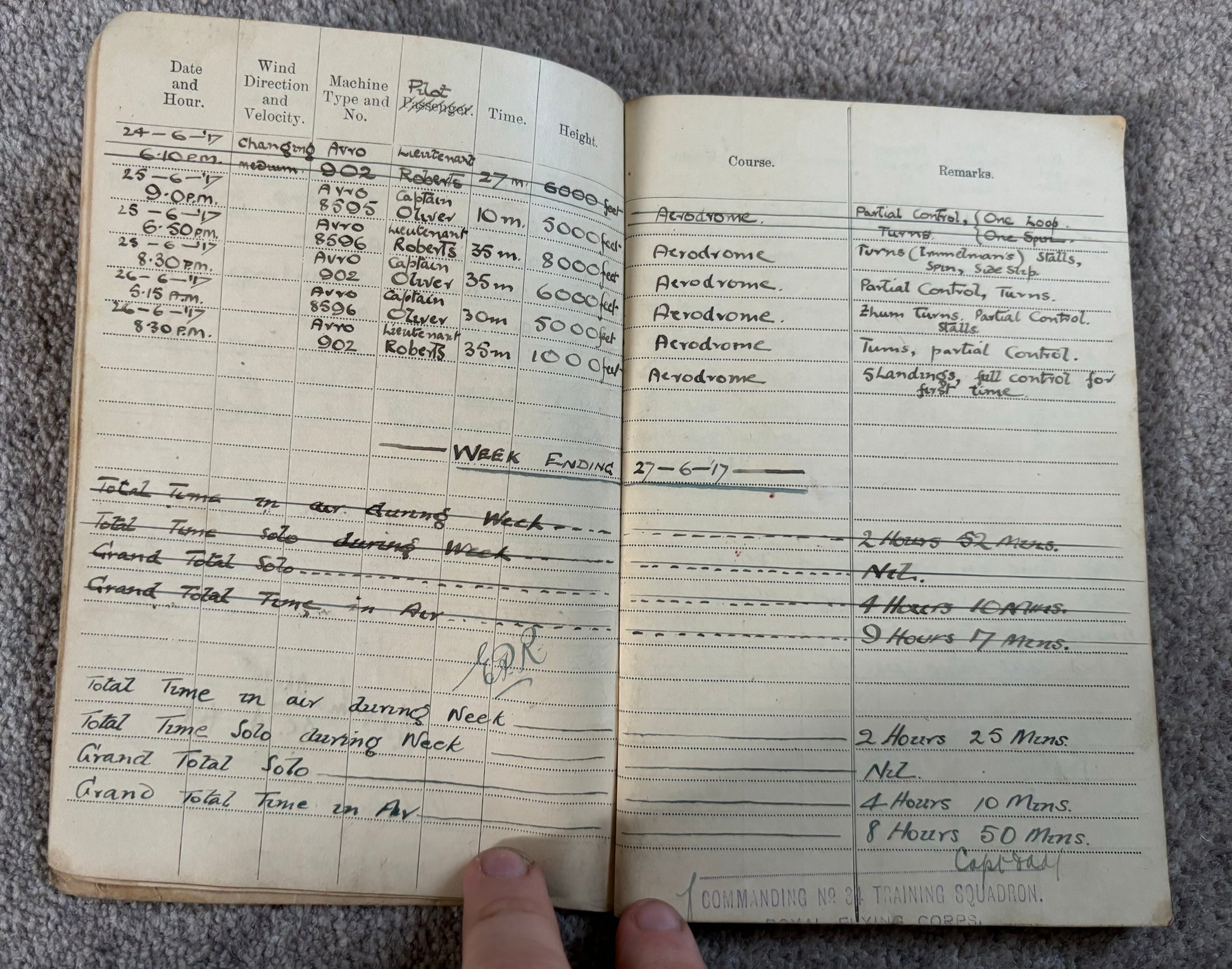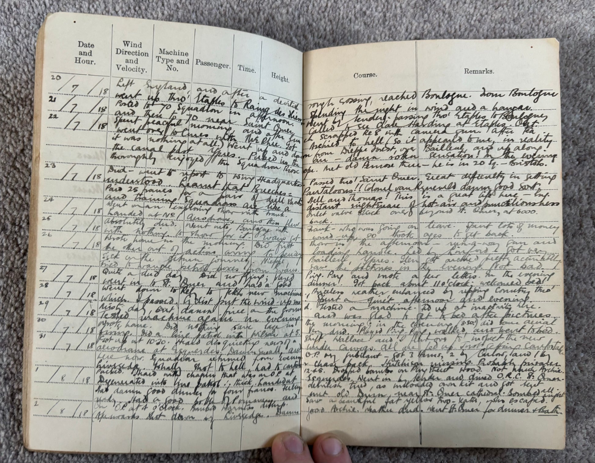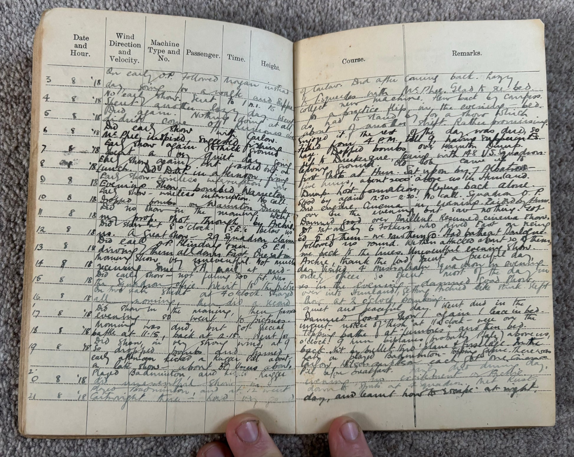 Jack’s log book contains some fabulous details of life on the front line for a South African RFC/RAF pilot, some highlights include: