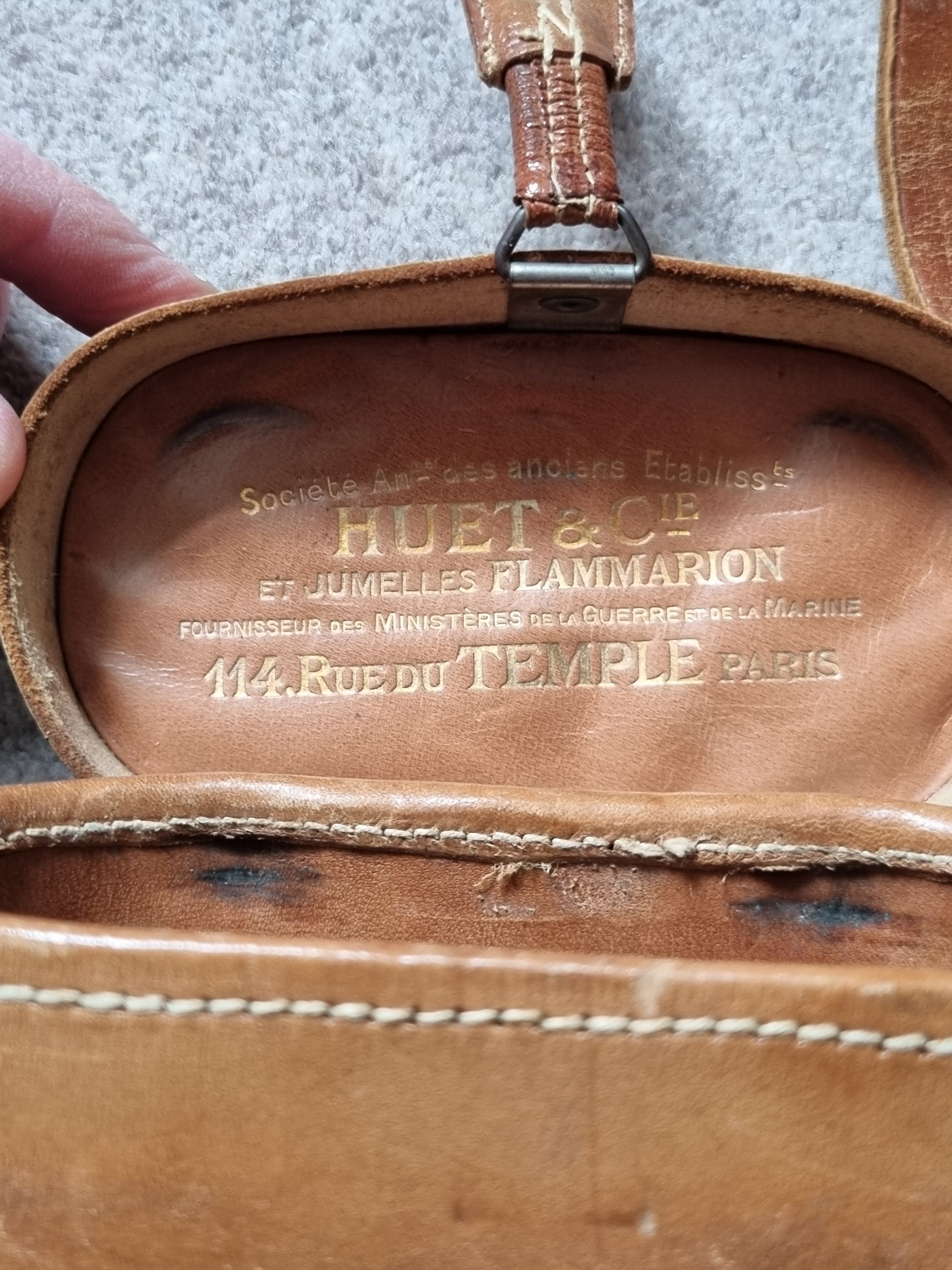 Binoculars case is empty, with makers label for Huet & Cie of Paris