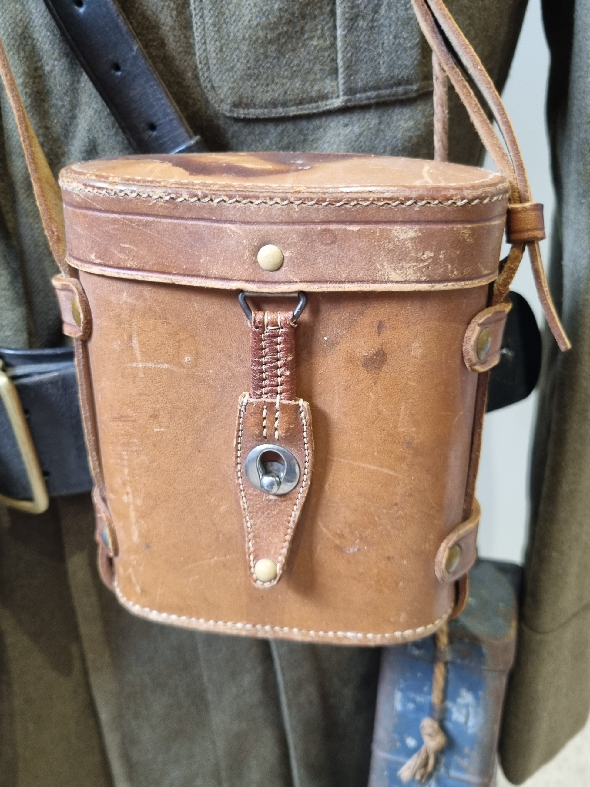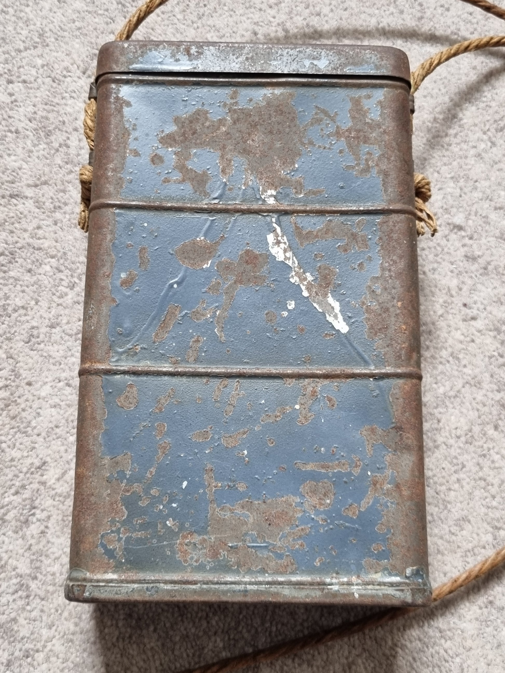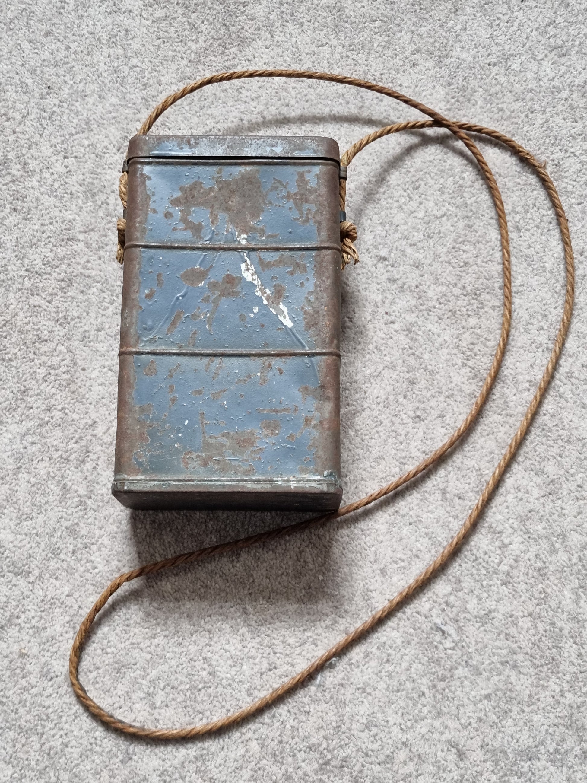 M2 gas mask carry tin is painted a dark horizon blue and with thick string cord carry loop.