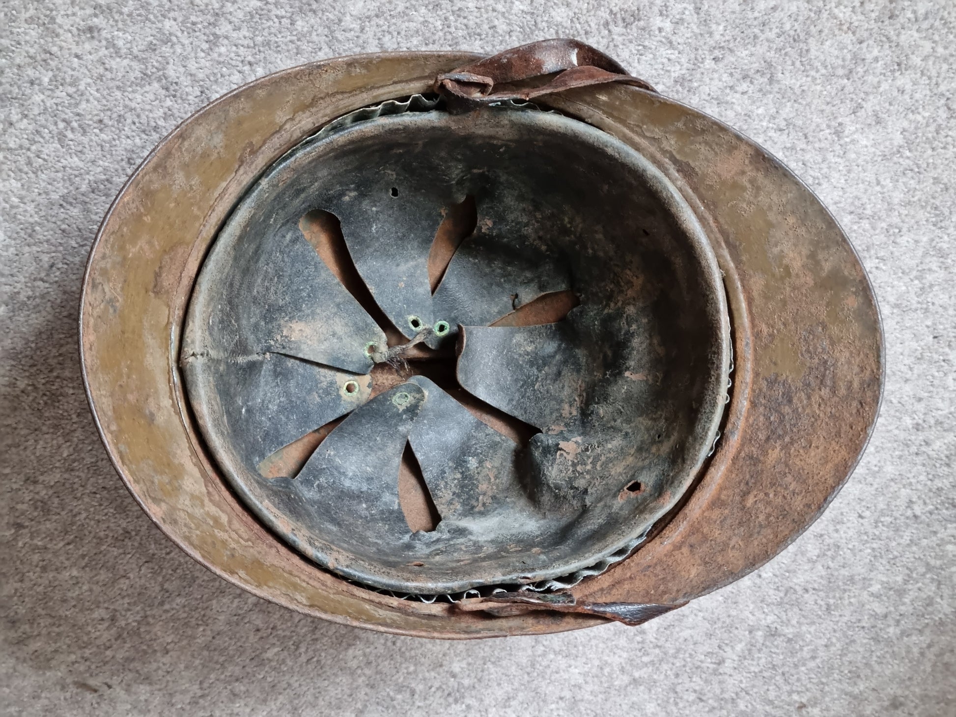 Helmet has original leather chinstrap and liner + with upturned cresent Colonial badge. Size is approx 54-55.
