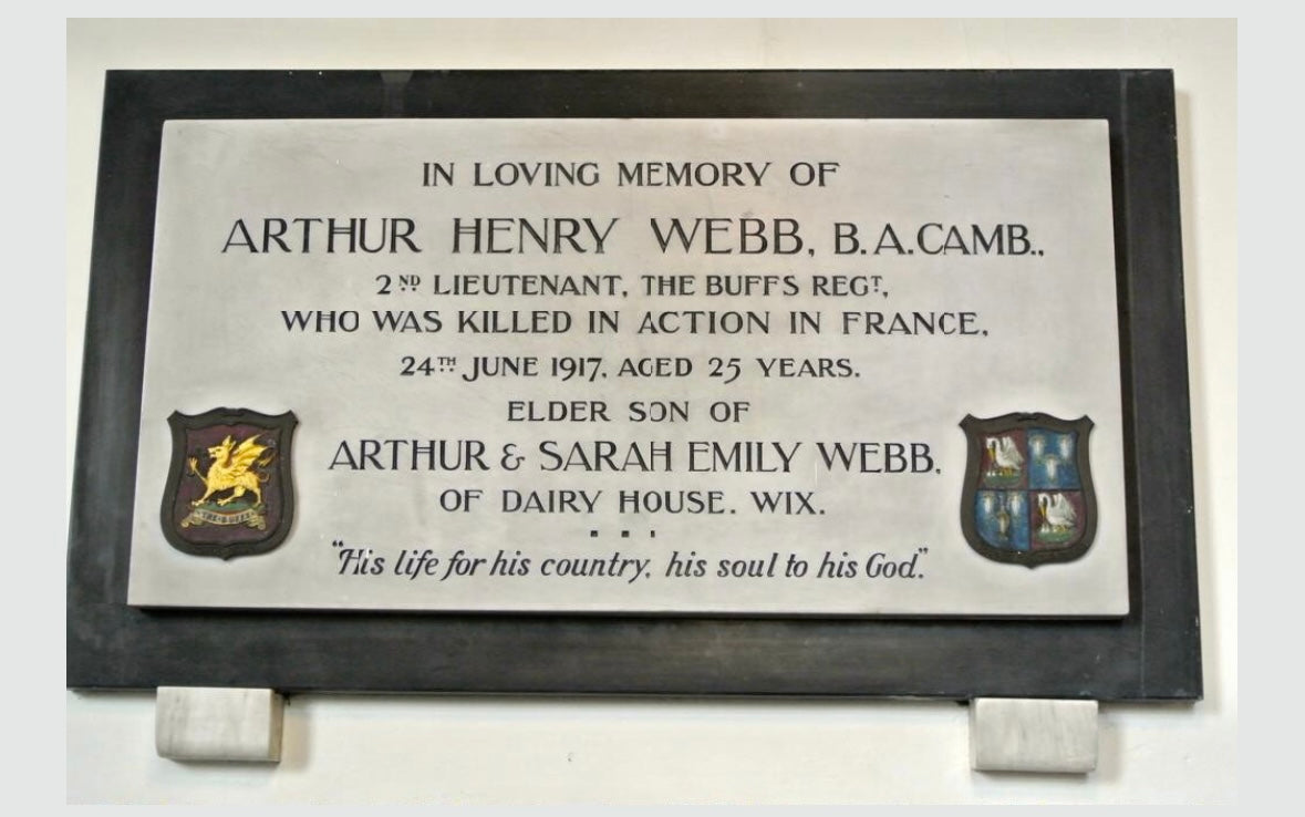 Arthur was killed in action at the age of 25 in the early hours of the 24th June 1917 in the aftermath of the Battle of Messines, Hill 60. On the evening of 23 June 1917 the battalion moved from Dickebusch to relieve the 3rd Rifle Brigade NW of Battle Wood and Image Trench. Heavy shelling around Shrapnel Corner forced a last-minute route change via Chester Farm; two companies became detached and B Company “lost 2/Lt A. H. Webb” (with two ORs wounded). The regimental history clarifies that during the relief, they were under abnormally heavy shell fire, targeting the rear working parties, in which Webb was killed. He was buried where he fell, being remembered on the Menin Gate as well as by a plaque in his local church, St Mary’s, Wix, with the inscription ‘His life for his country, his soul to his God’.