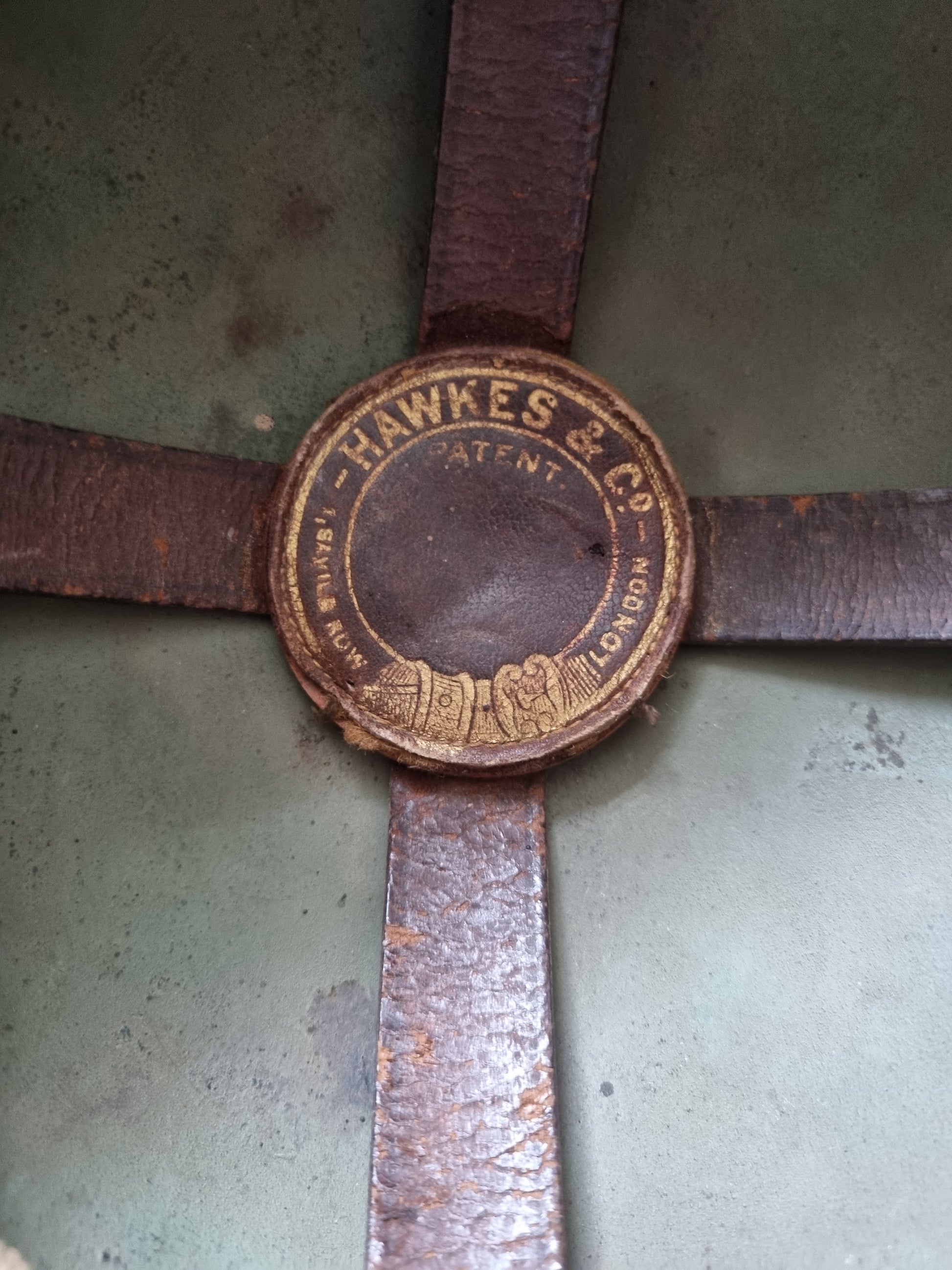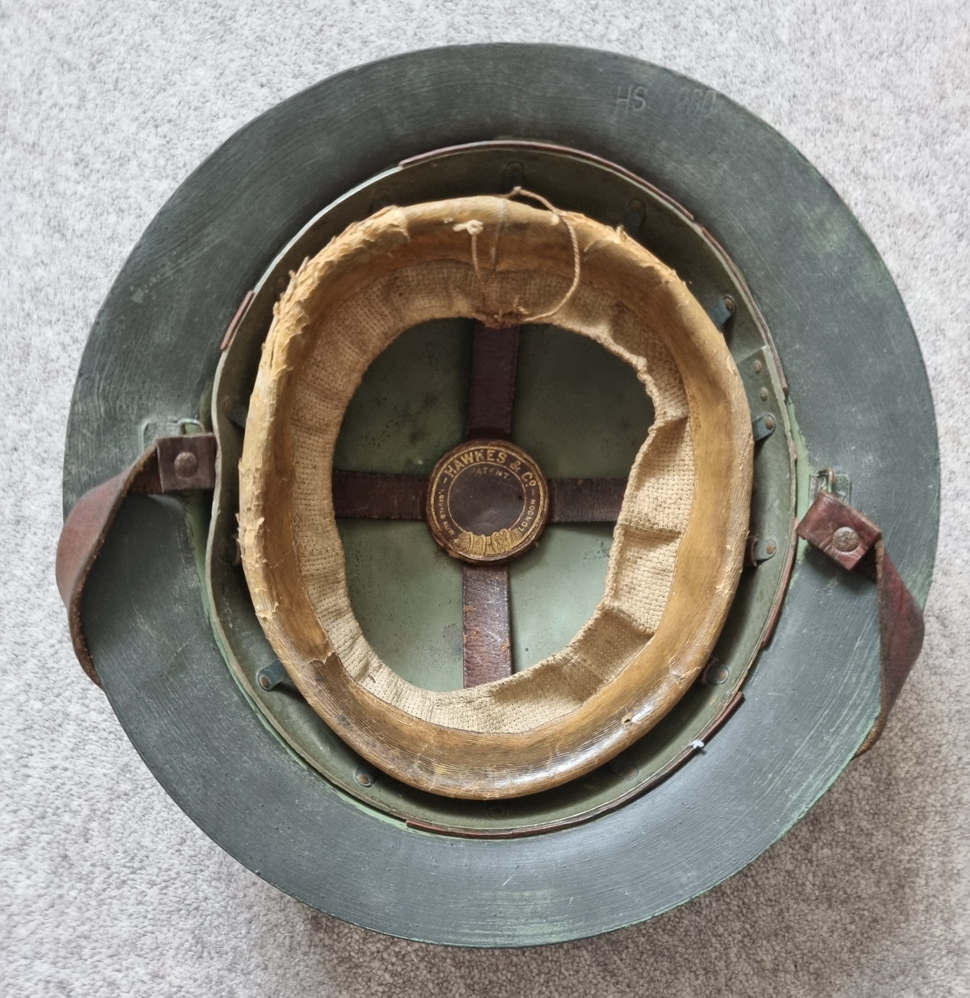 The officers brodie is a very rare combination of being raw edged, private purchase with an ultra hard to find Hawkes liner and badged to the Royal East Kent Regt. Liner size is approx 56. The helmet shell is stamped HS 260.