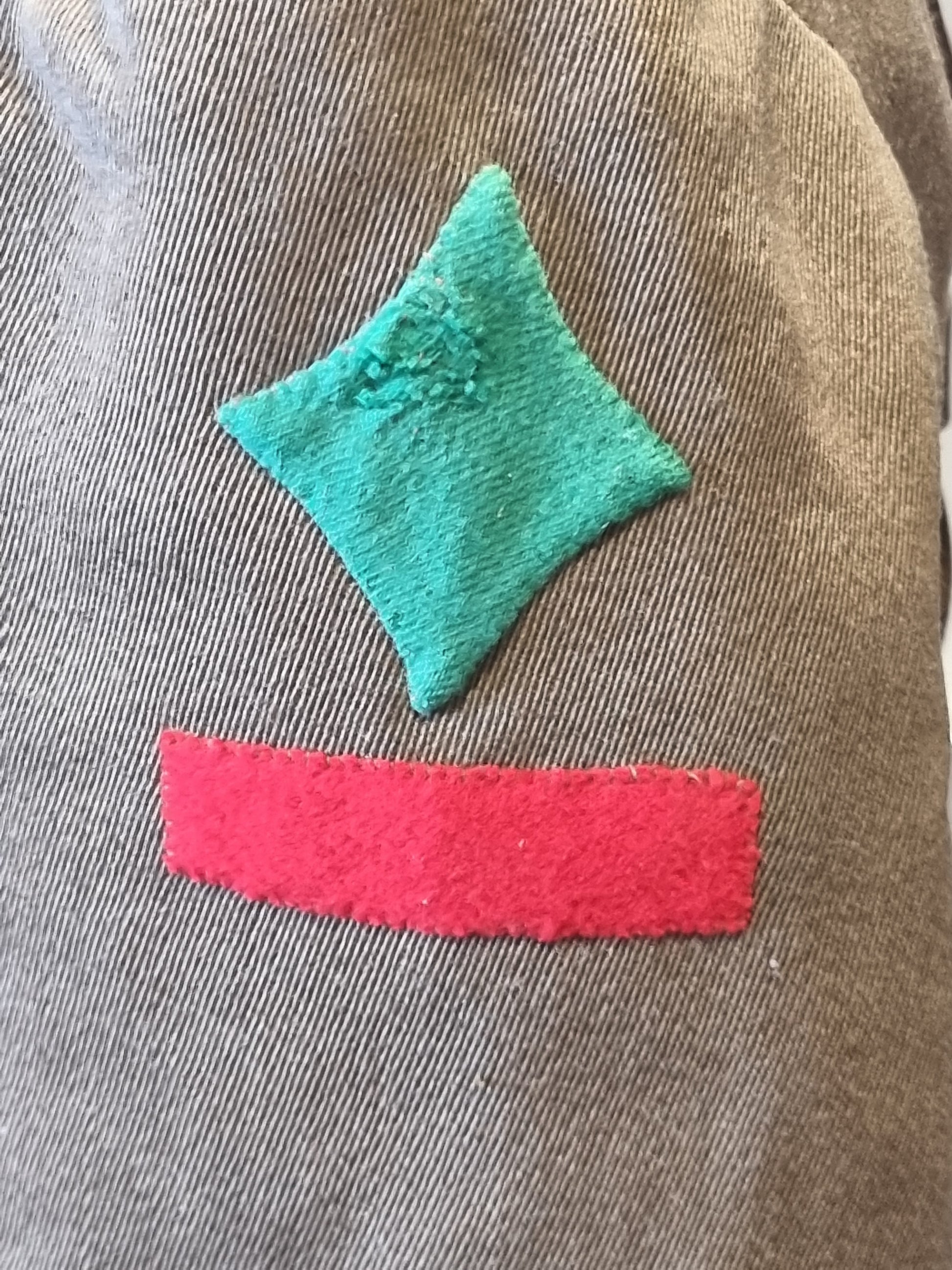 Fabric rank pips for a 2nd Lieutenant on the shoulders.